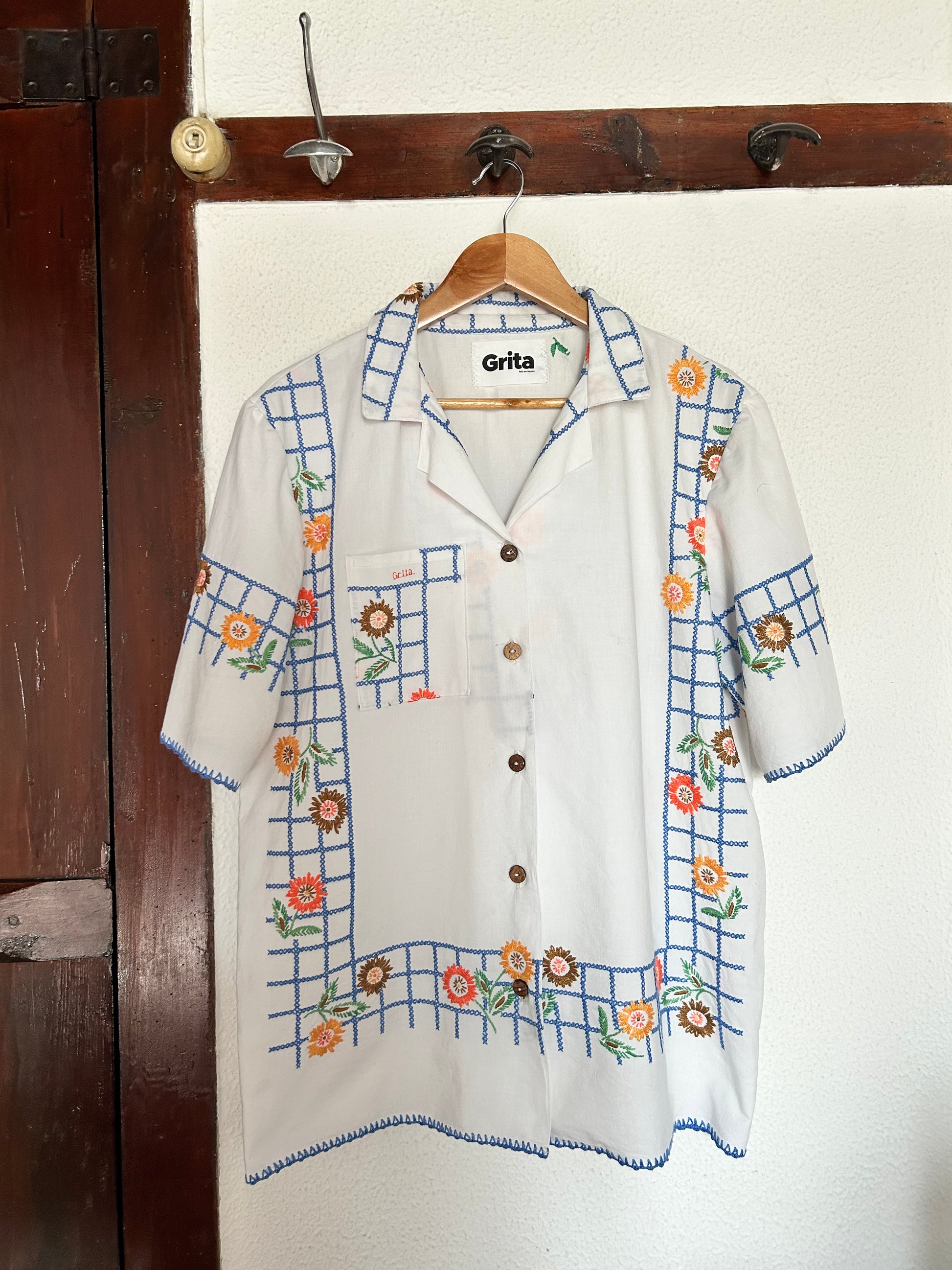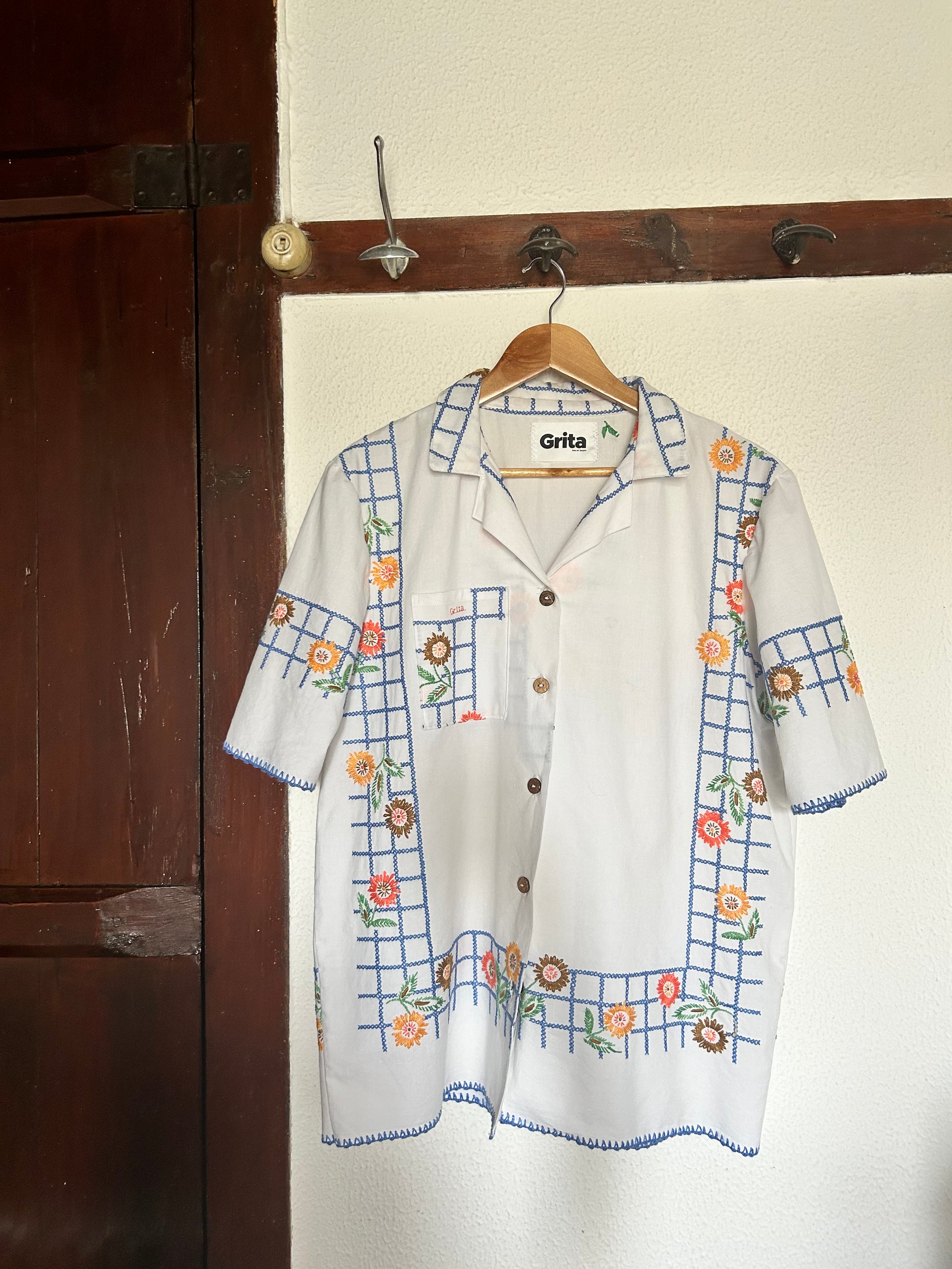 A GRITA utiliza tecidos usados dando-lhes uma nova função. Esta camisa era uma antiga toalha de mesa. A camisa estava em bom estado mas tinha muitas nódoas que foram todas retiradas