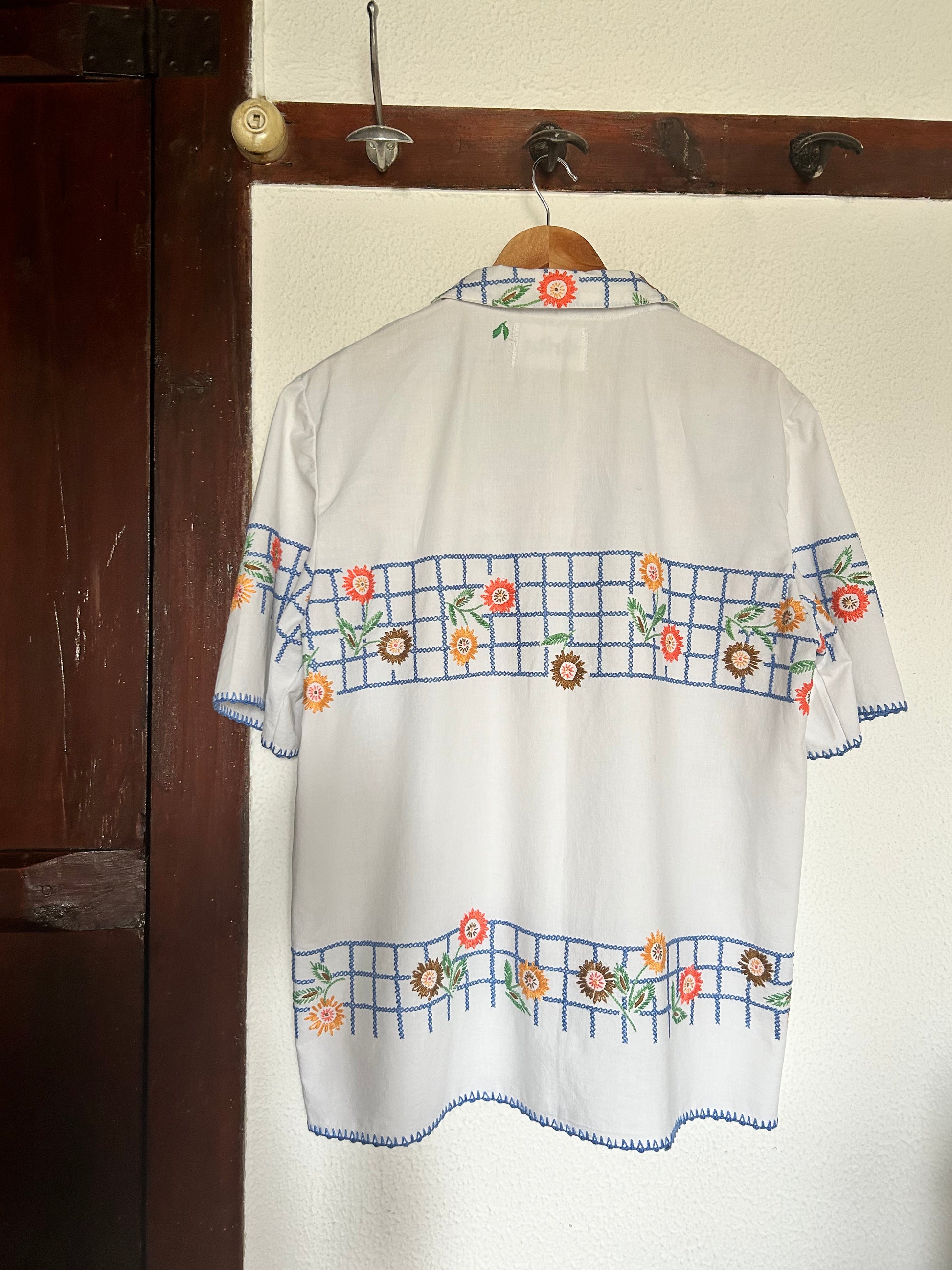Bonita camisa bordada a ponto cruz feita a partir de uma toalha de mesa