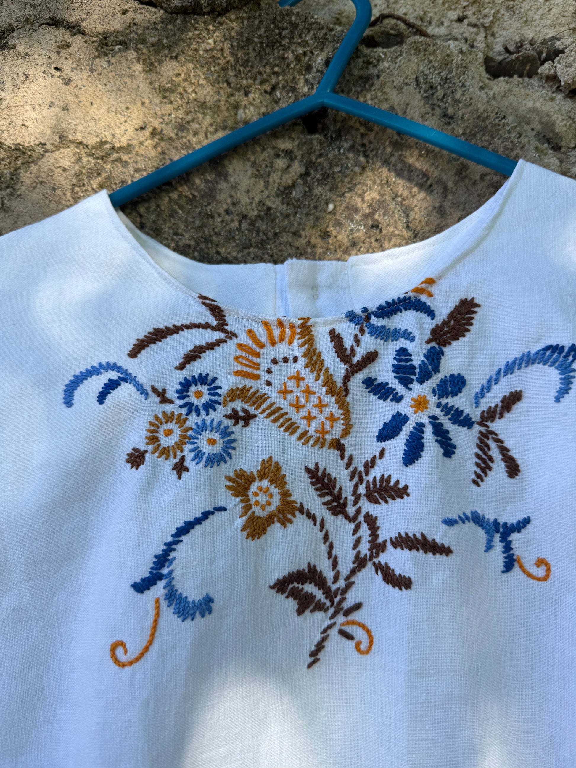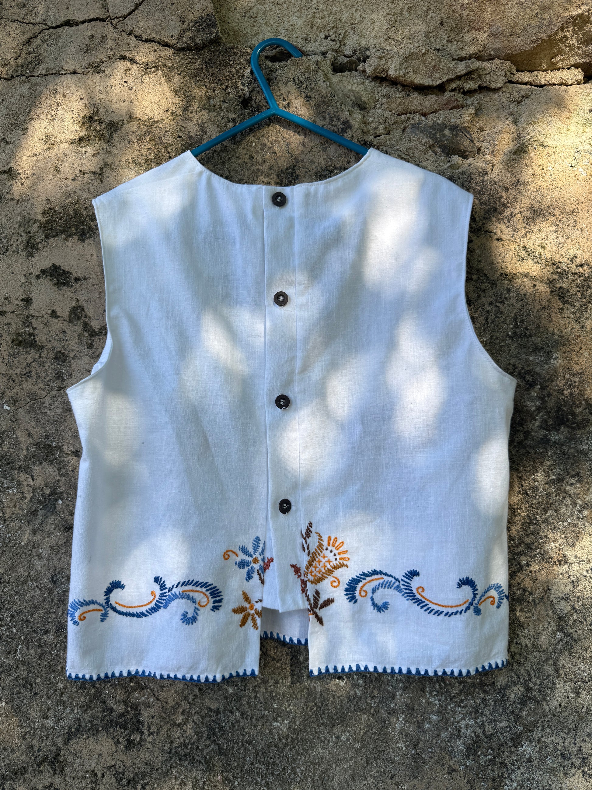 - A beautiful top made with a hand-embroidered linen curtain.