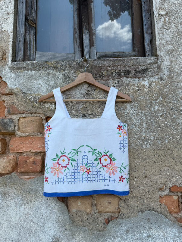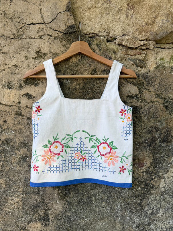 - Feito com uma cortina em linho e bordada à mão