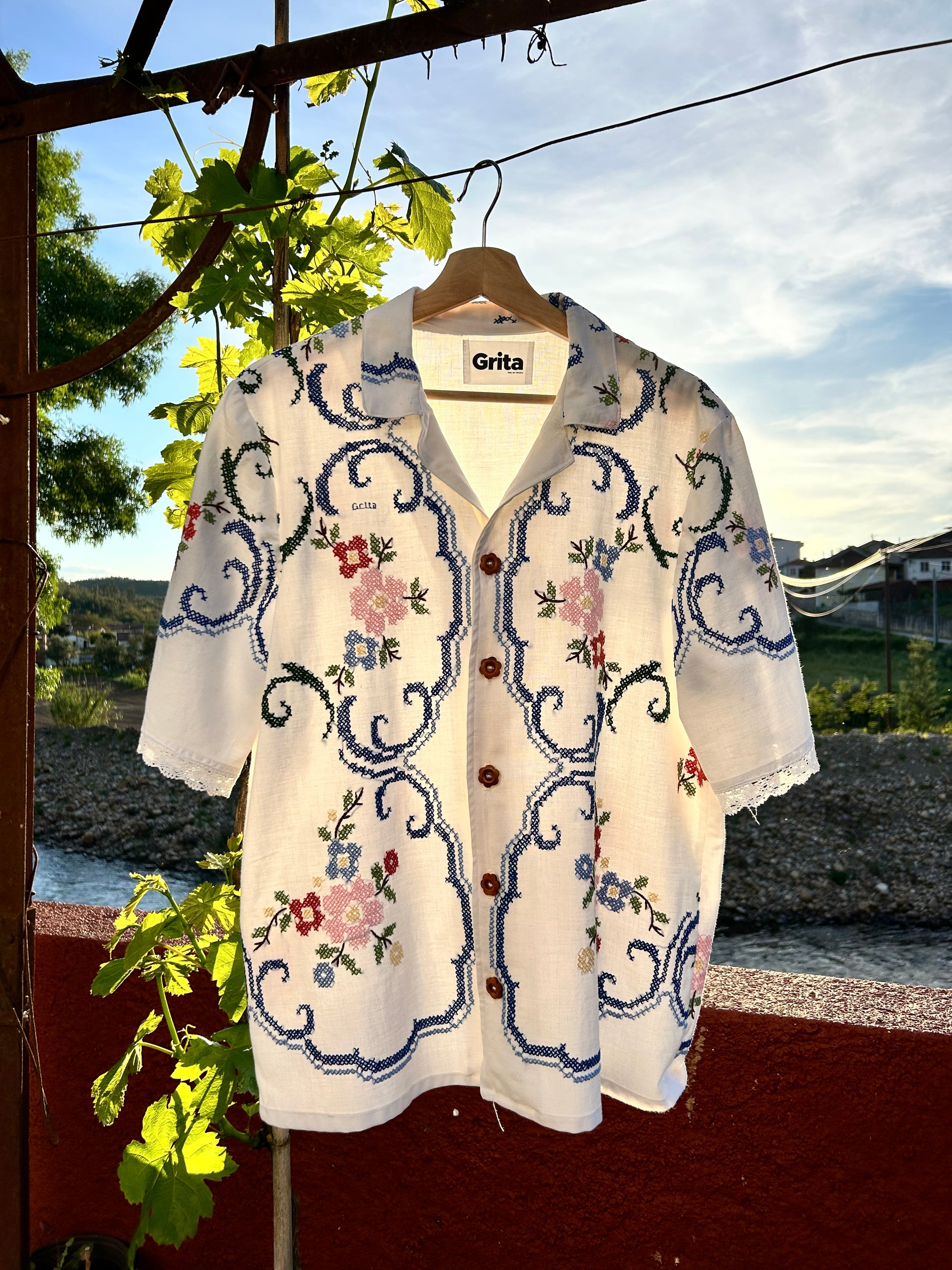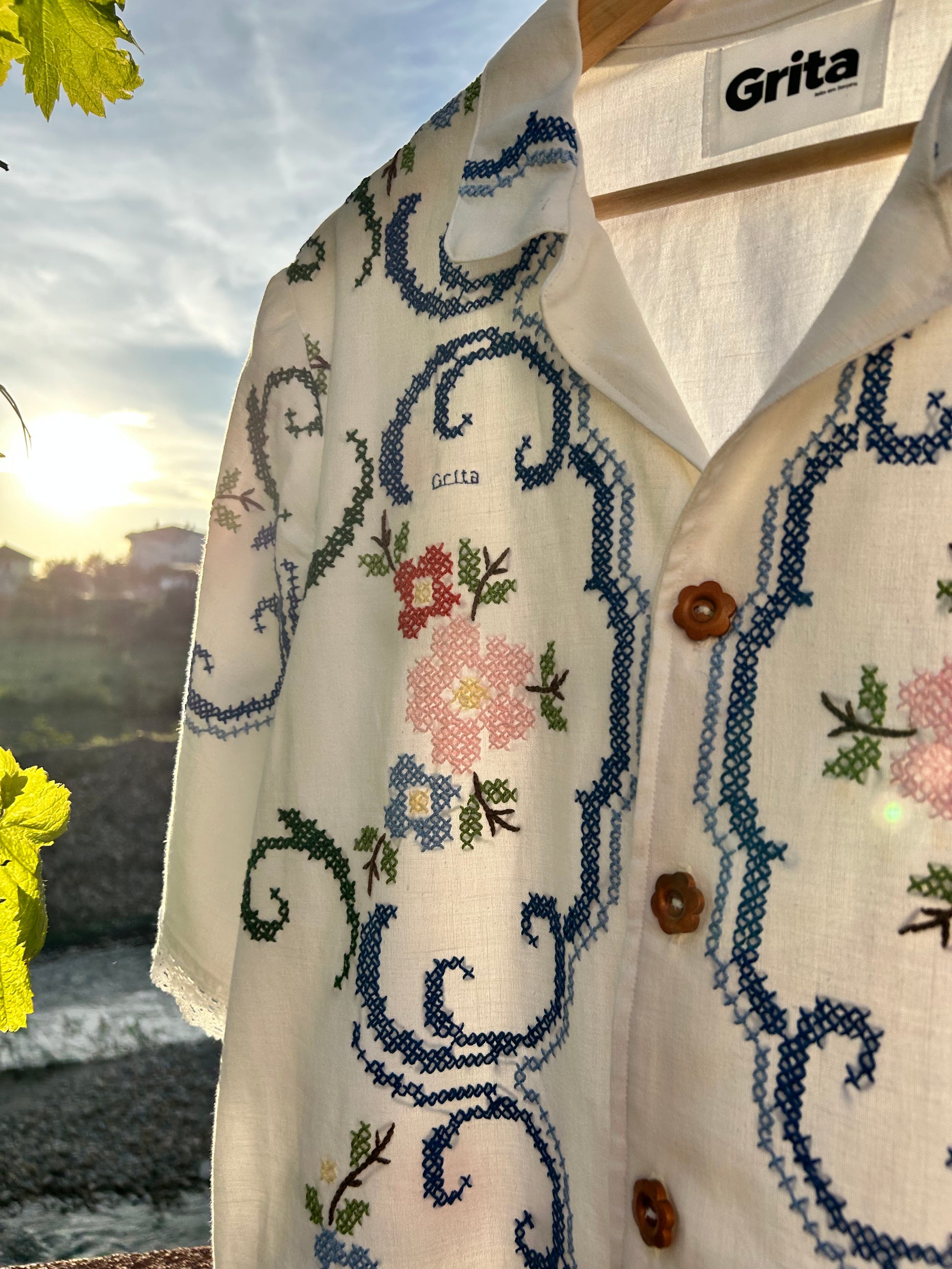 A GRITA utiliza tecidos usados dando-lhes uma nova função. Esta camisa era uma antiga toalha de mesa. Por isso, os tecidos podem ter pequenas imperfeições ou sinais de desgaste que tentamos disfarçar o melhor possível.