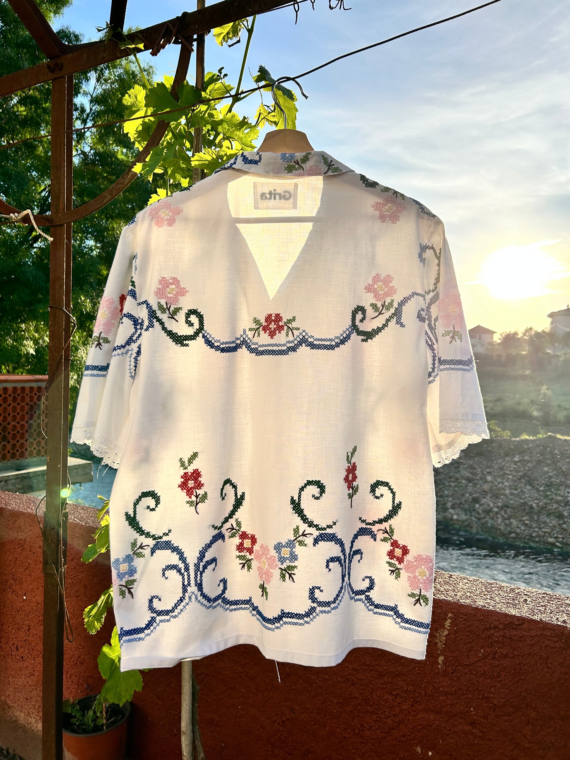 Bonita camisa florida, bordada a ponto cruz feita a partir de uma toalha de mesa