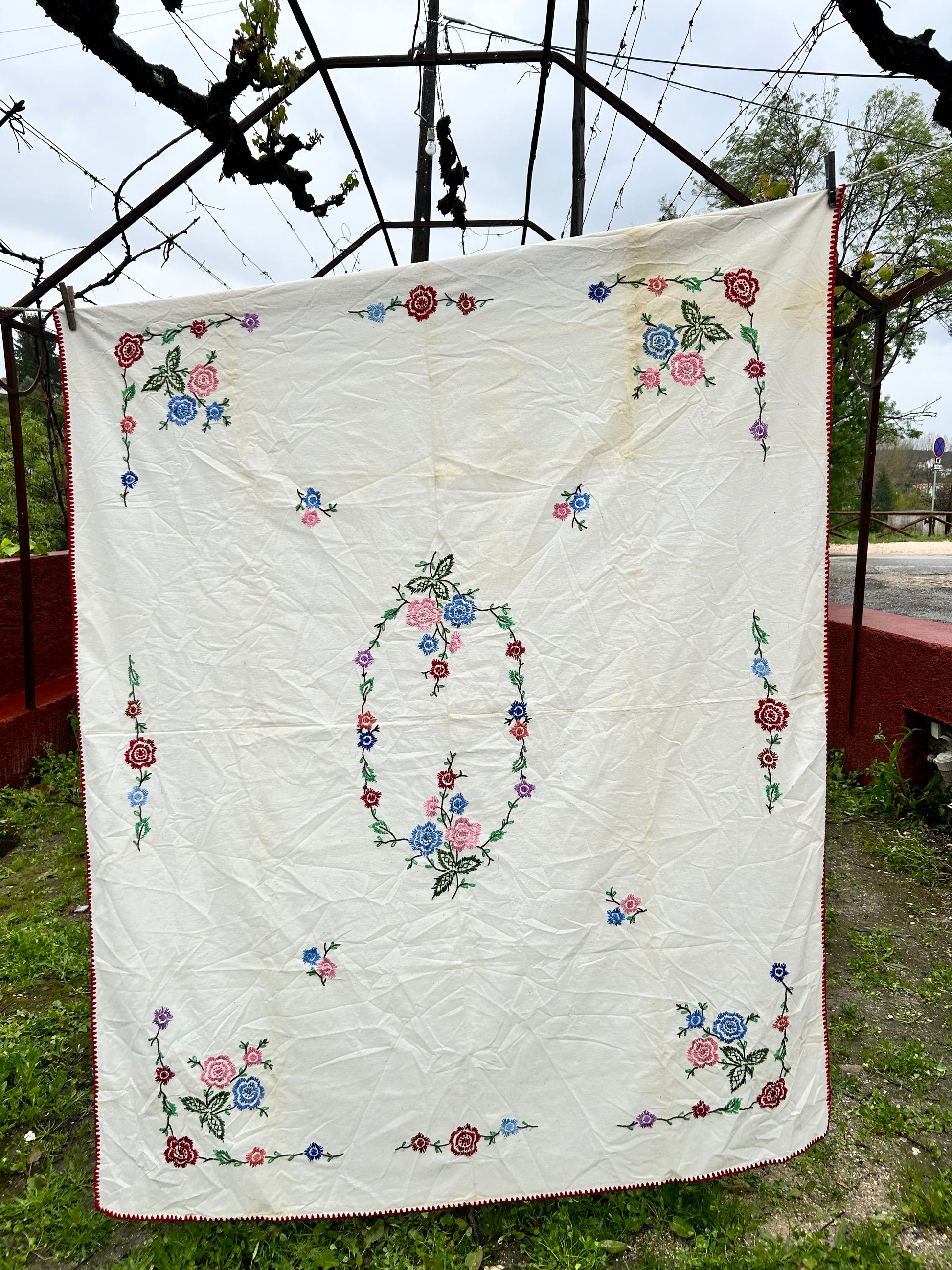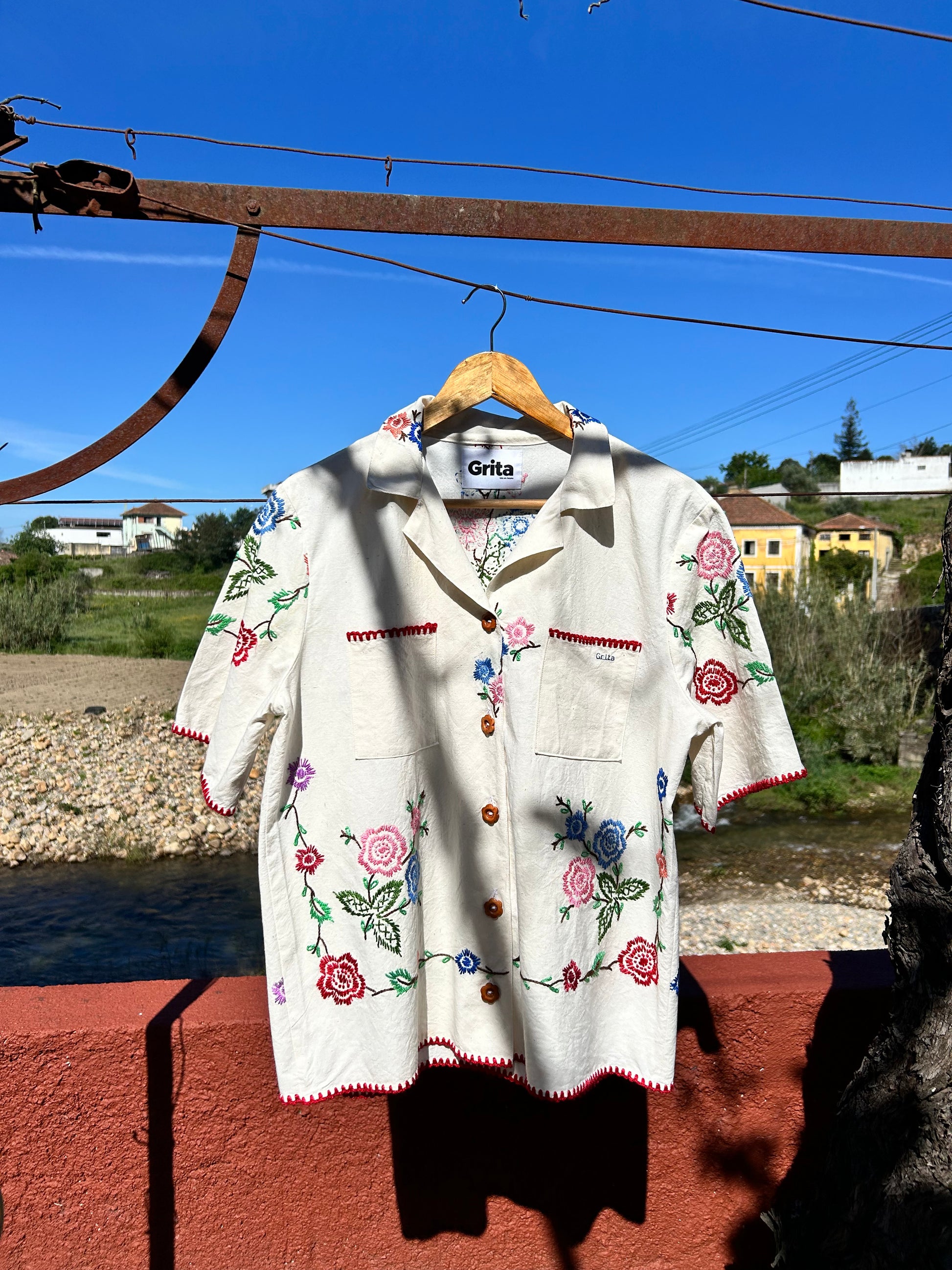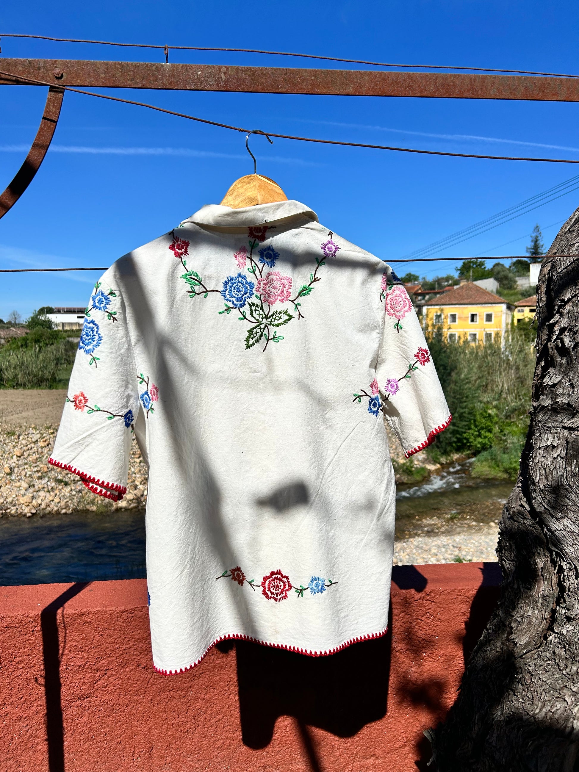 Bonita camisa florida, bordada a ponto cruz feita a partir de uma toalha de mesa