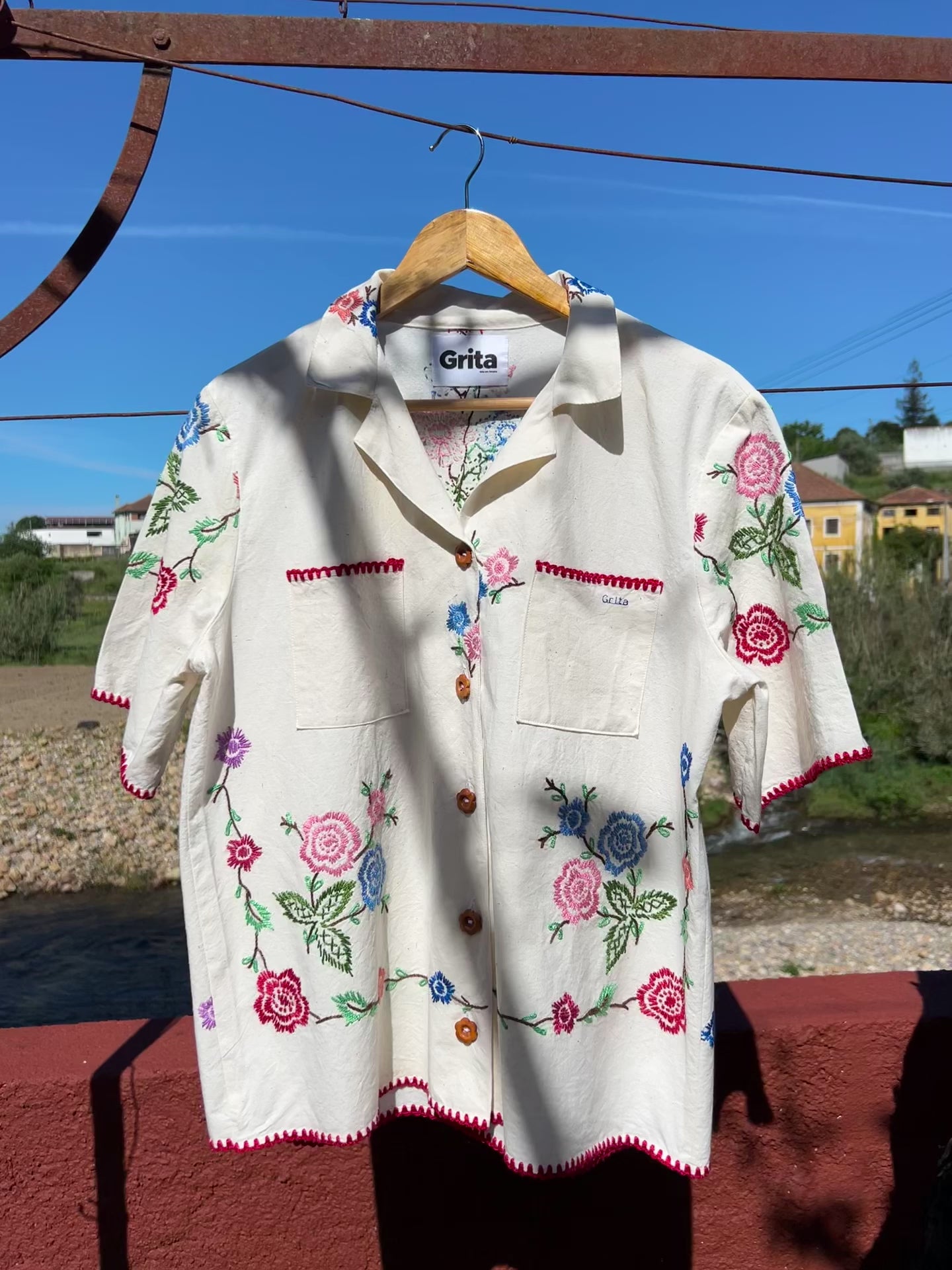 A GRITA utiliza tecidos usados dando-lhes uma nova função. Esta camisa era uma antiga toalha de mesa. Por isso, os tecidos podem ter pequenas imperfeições ou sinais de desgaste que tentamos disfarçar o melhor possível.