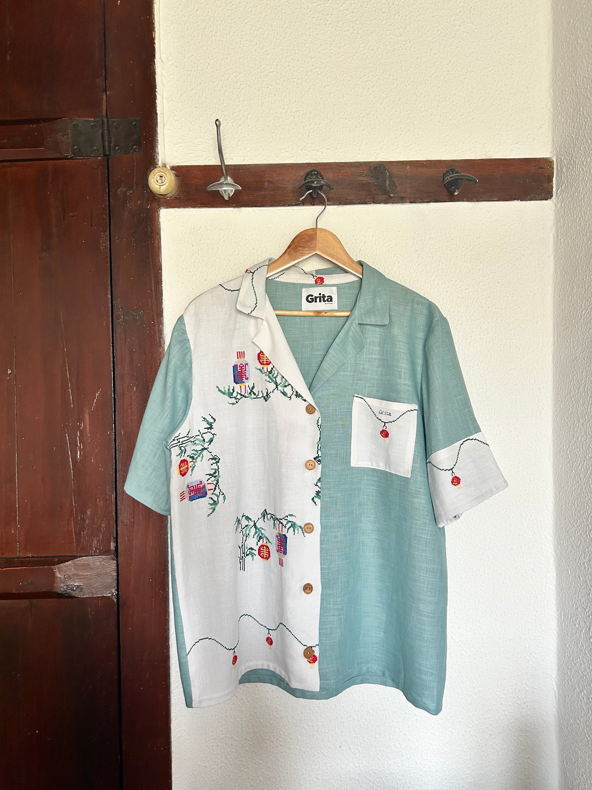 A GRITA utiliza tecidos usados dando-lhes uma nova função. Esta camisa tem uma parte que era uma antiga toalha de mesa. Por isso, os tecidos podem ter pequenas imperfeições ou sinais de desgaste que tentamos disfarçar o melhor possível.