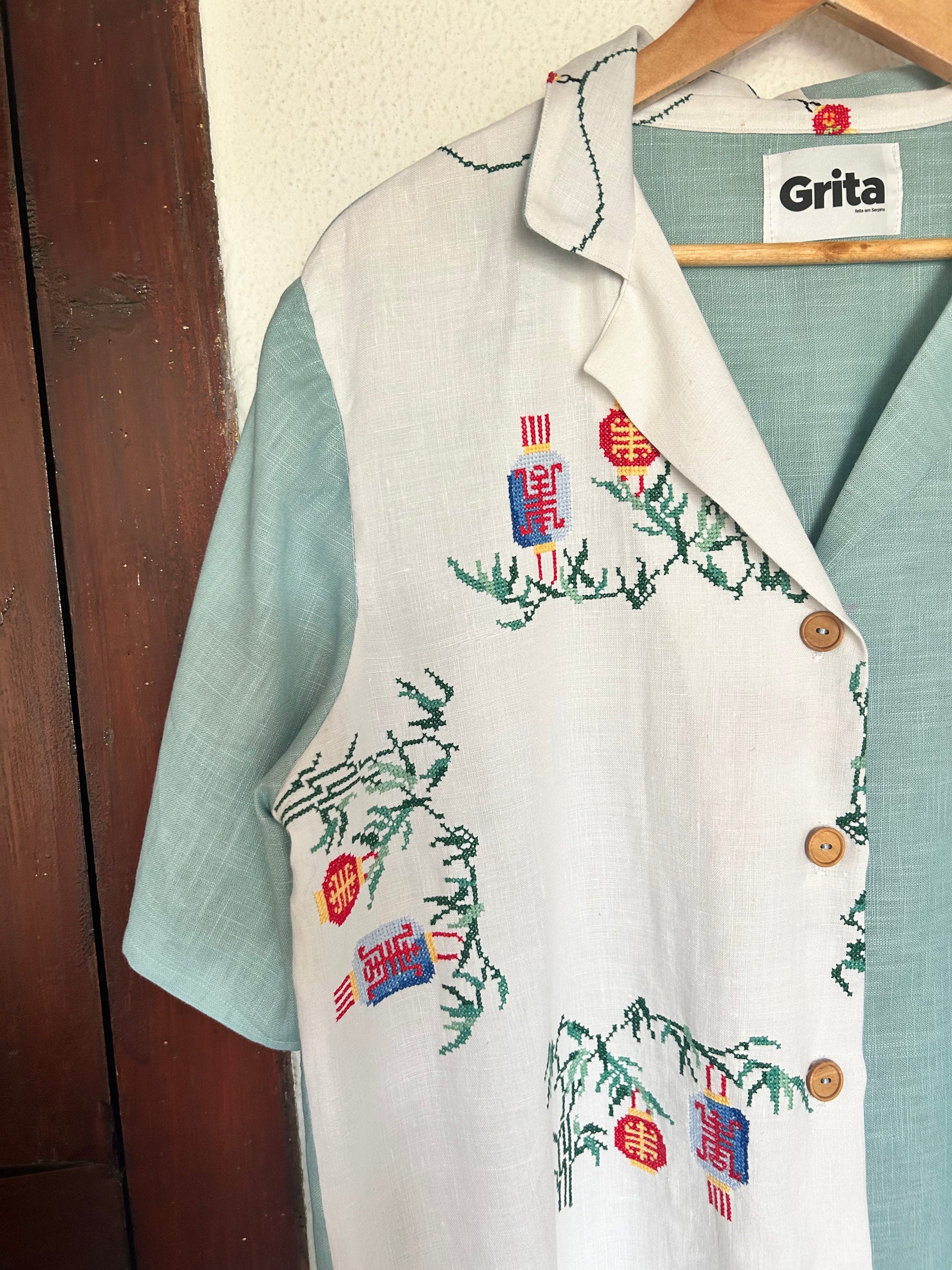 GRITA uses used fabrics giving them a new function. This shirt was an old tablecloth. Therefore, fabrics may have small imperfections or signs of use that we try to disguise as best as possible.
