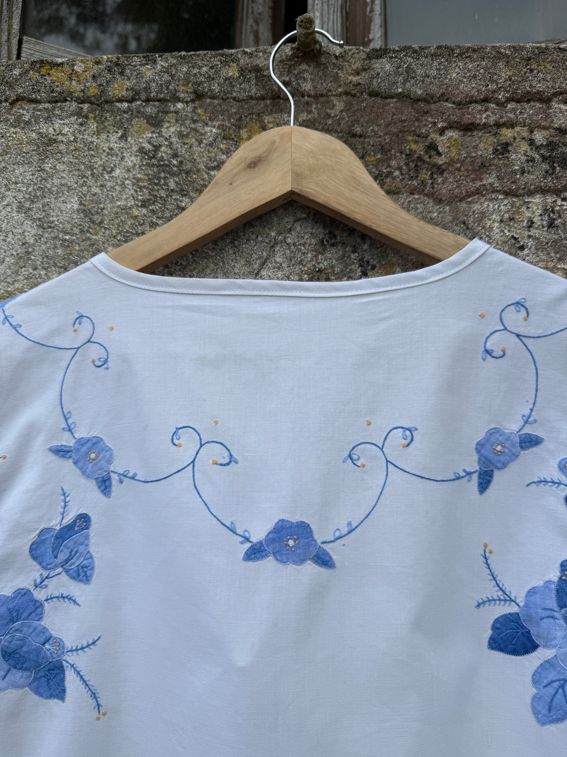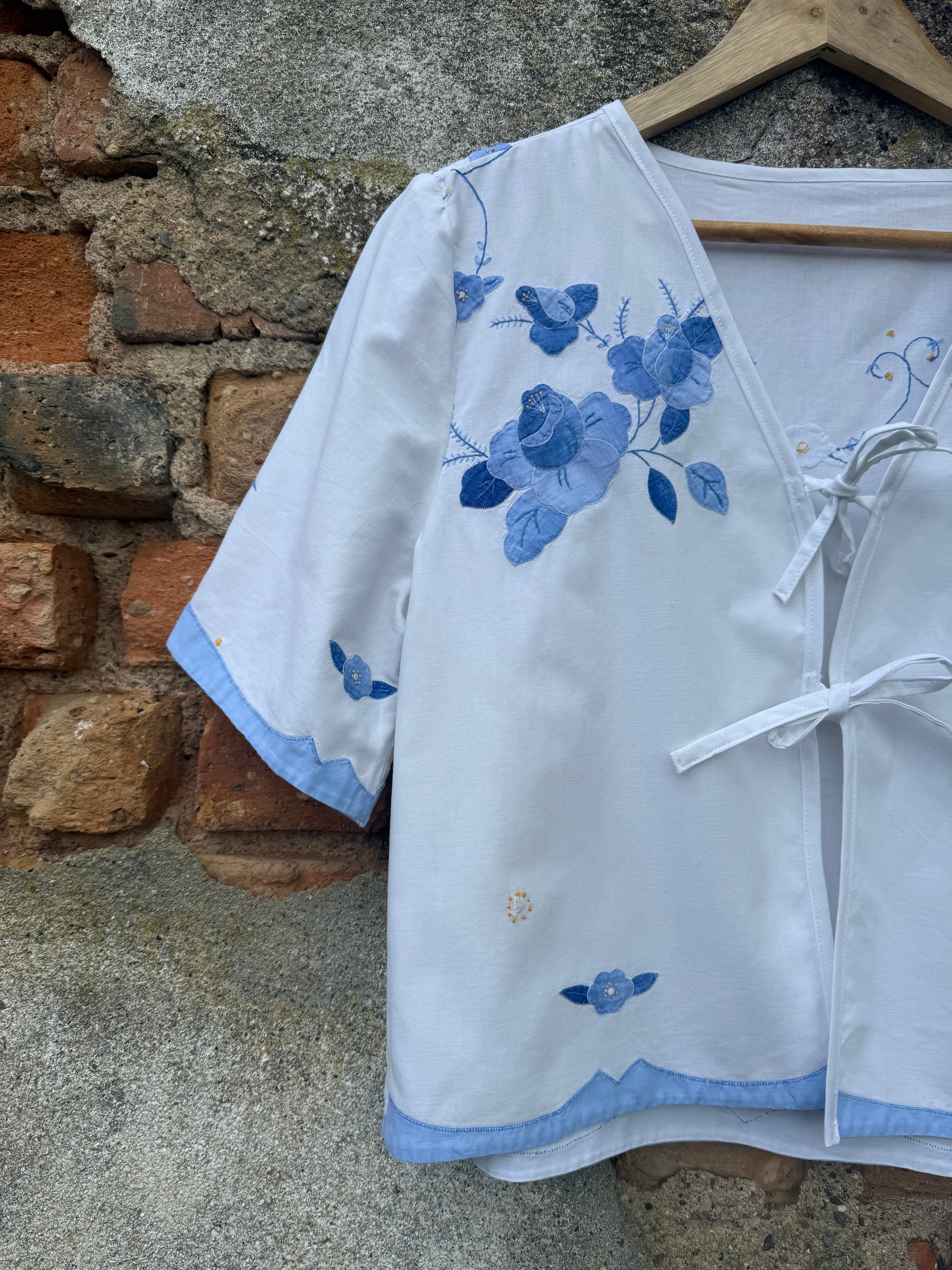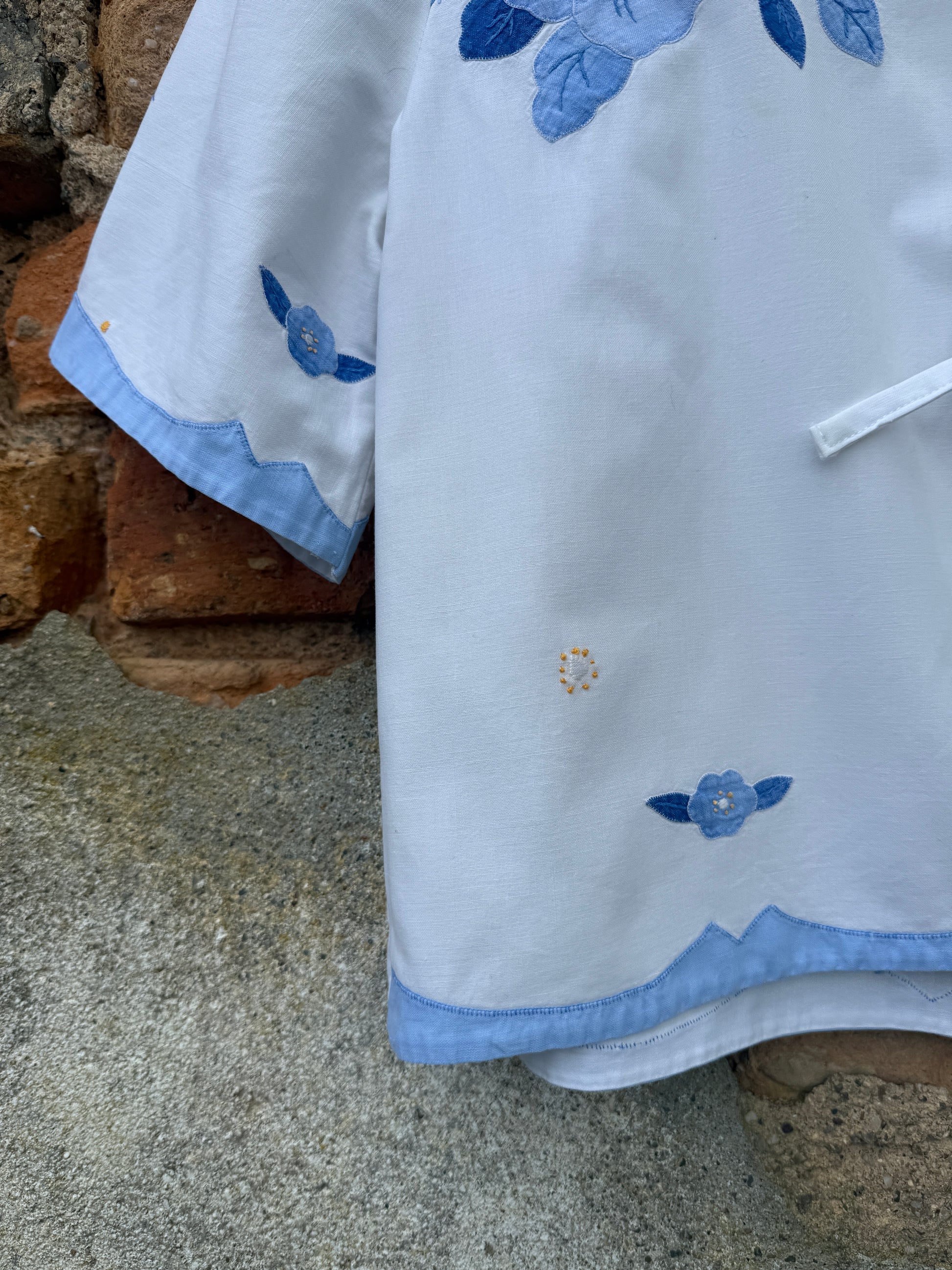 Blusa com mangas feita com uma toalha de mesa com aplicações em tecido e bordada à mão