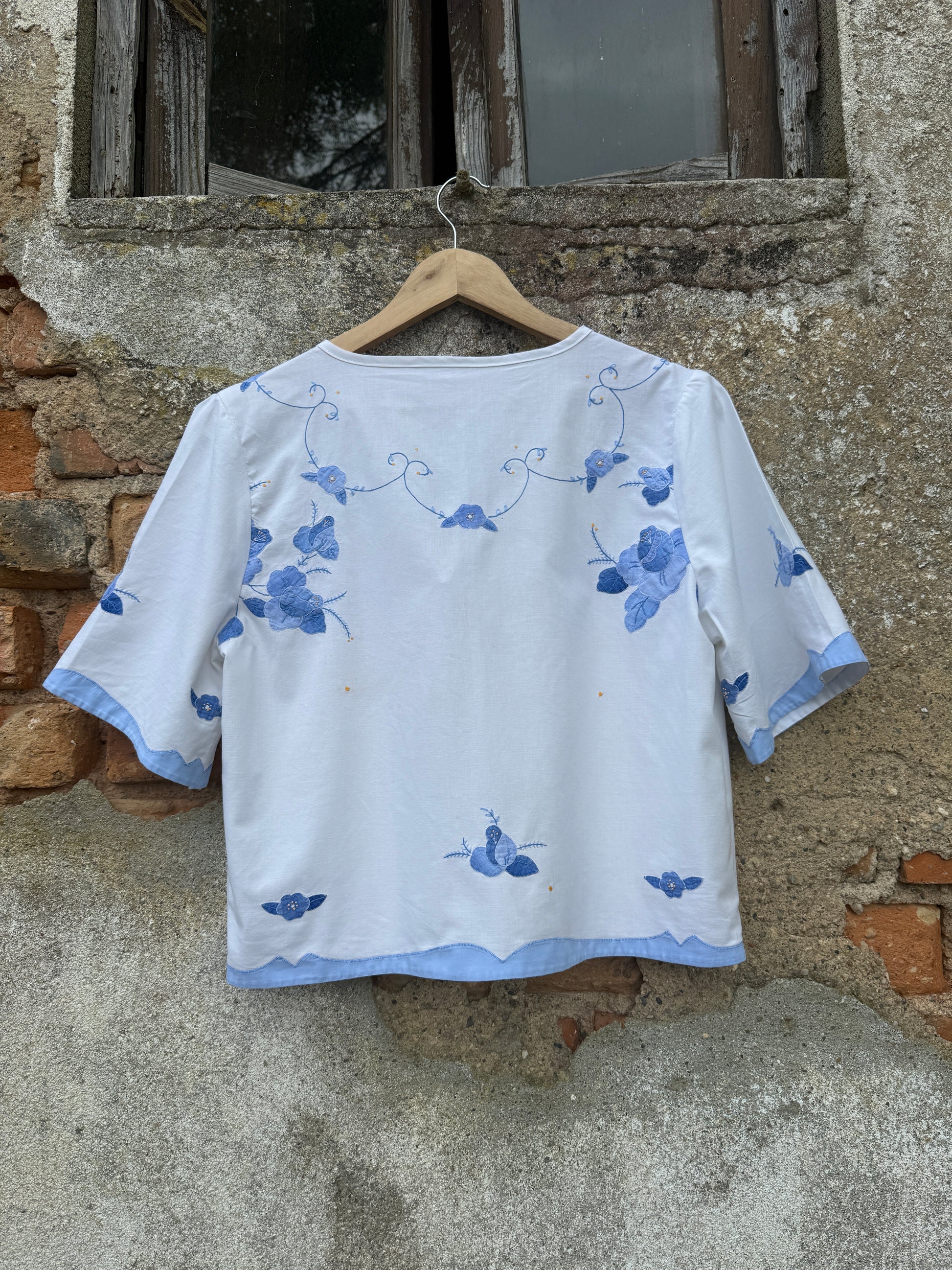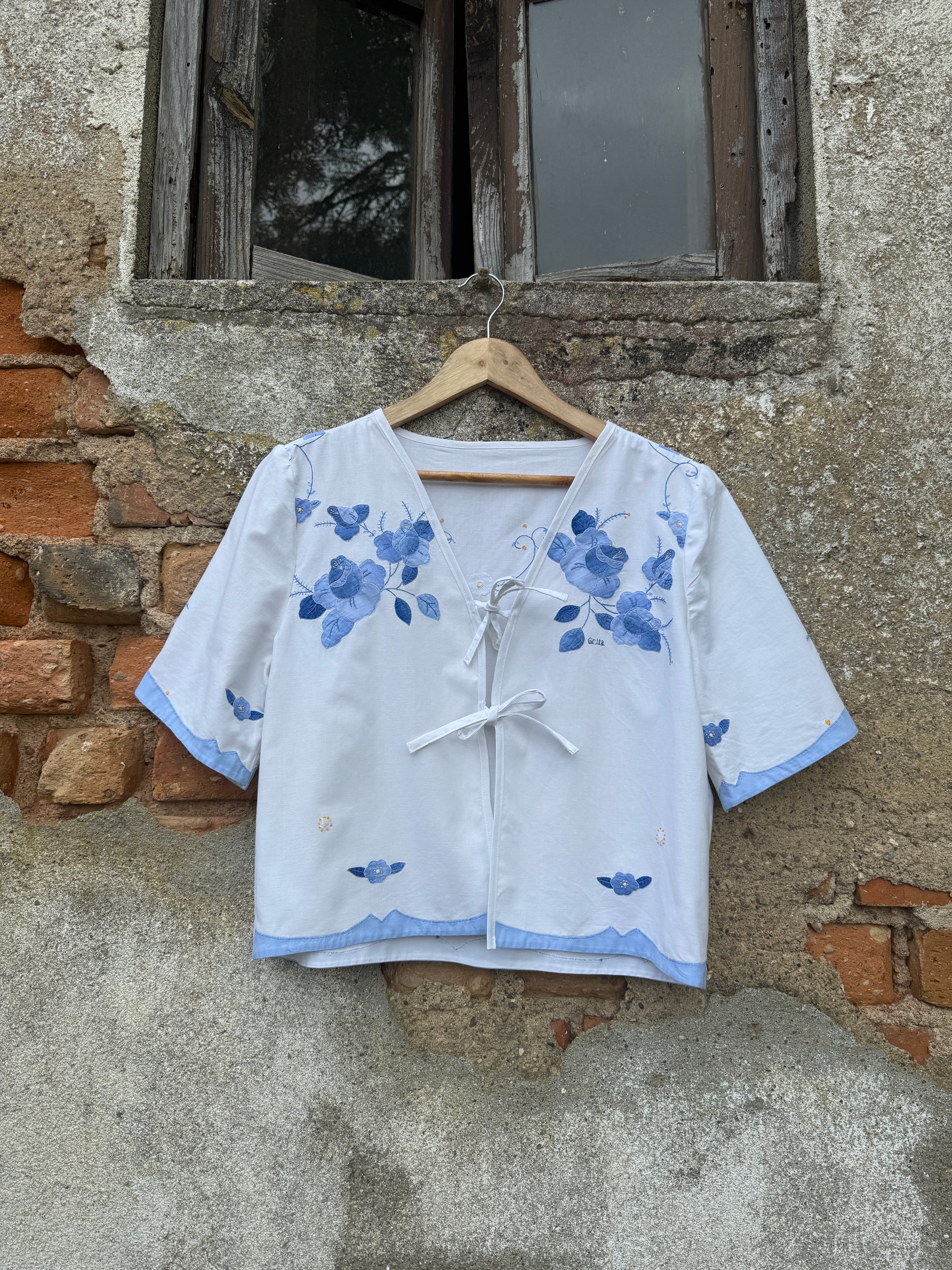 Blouse with sleeves made with a tablecloth with fabric applications and hand embroidery