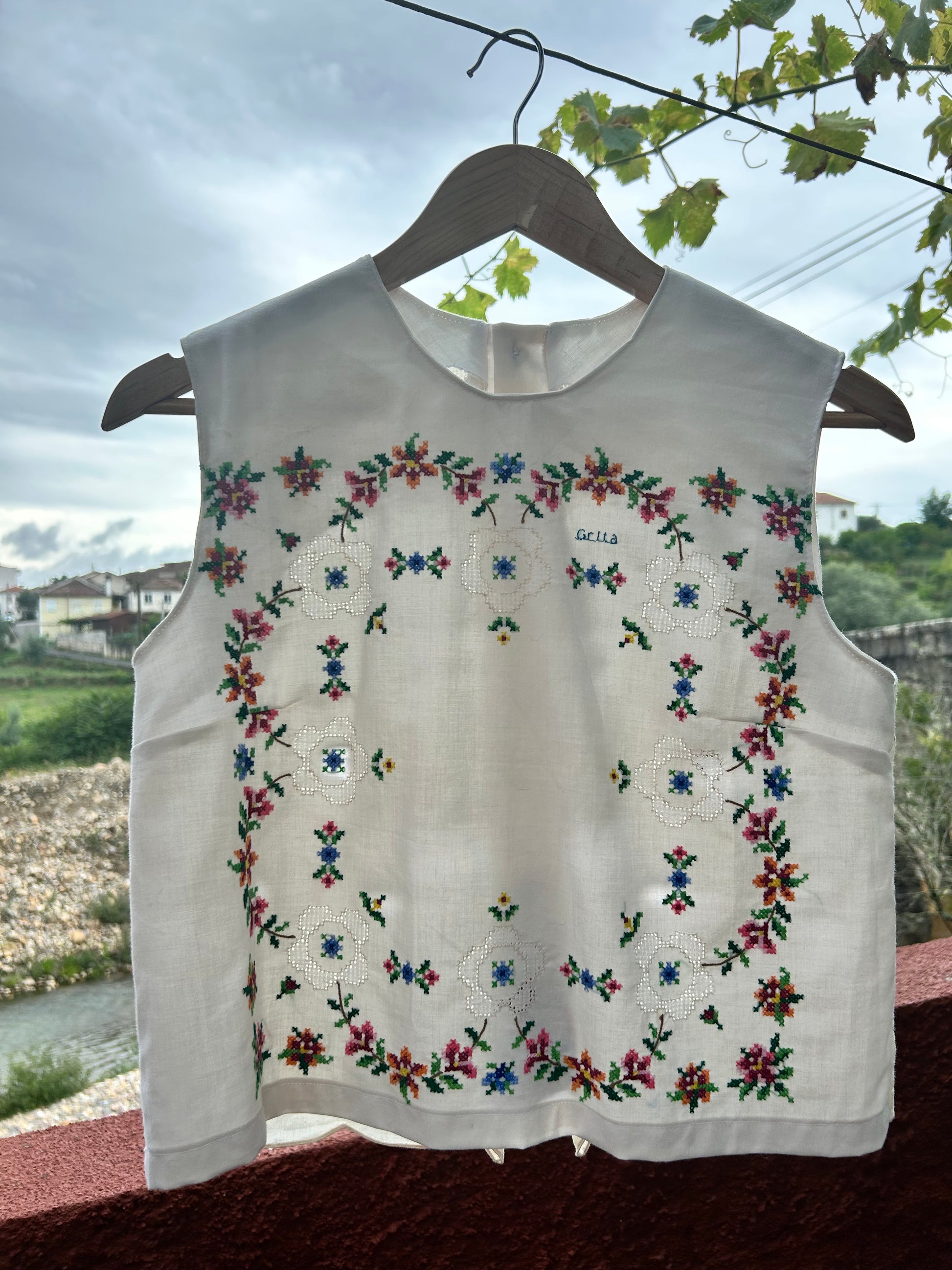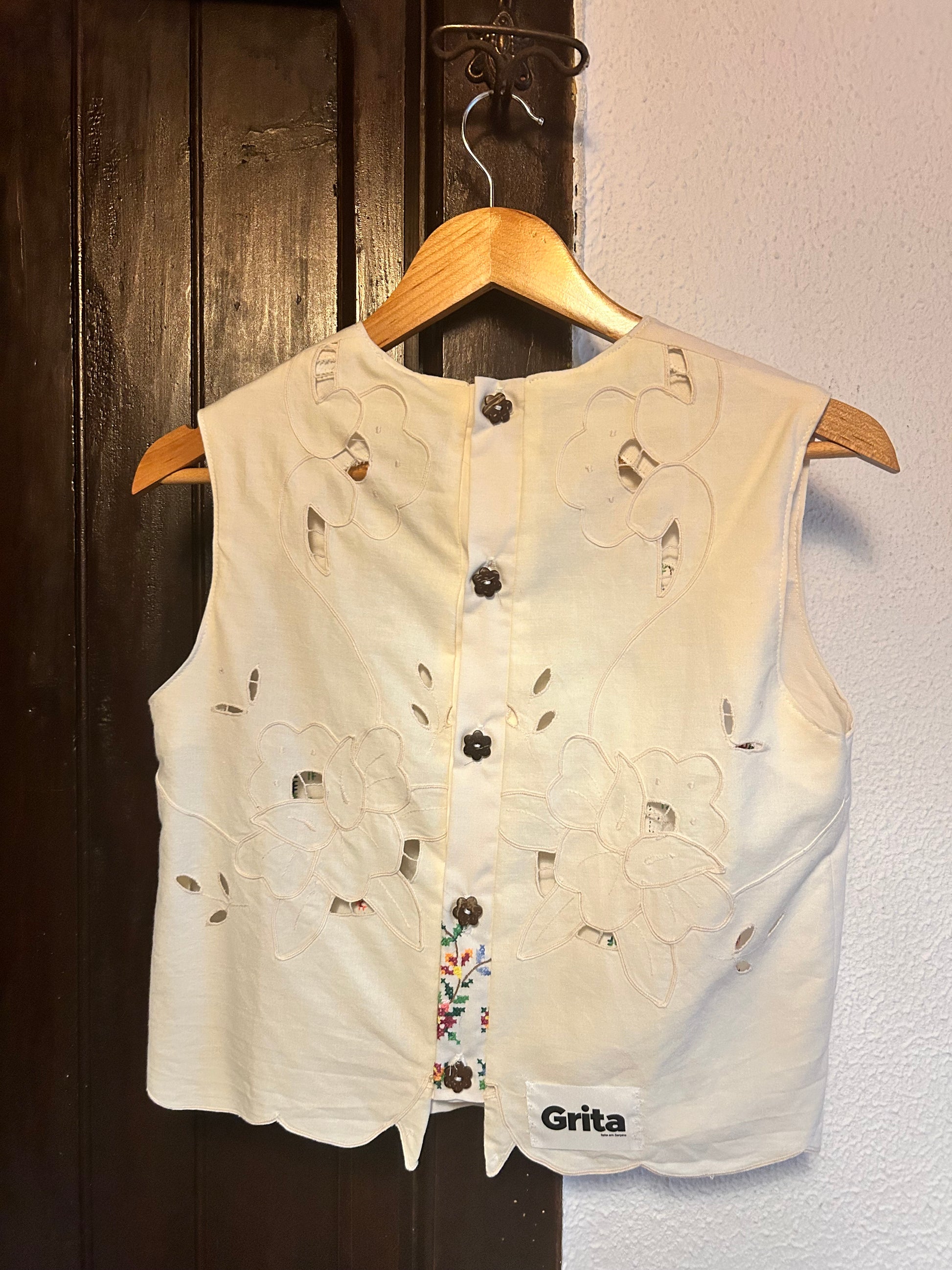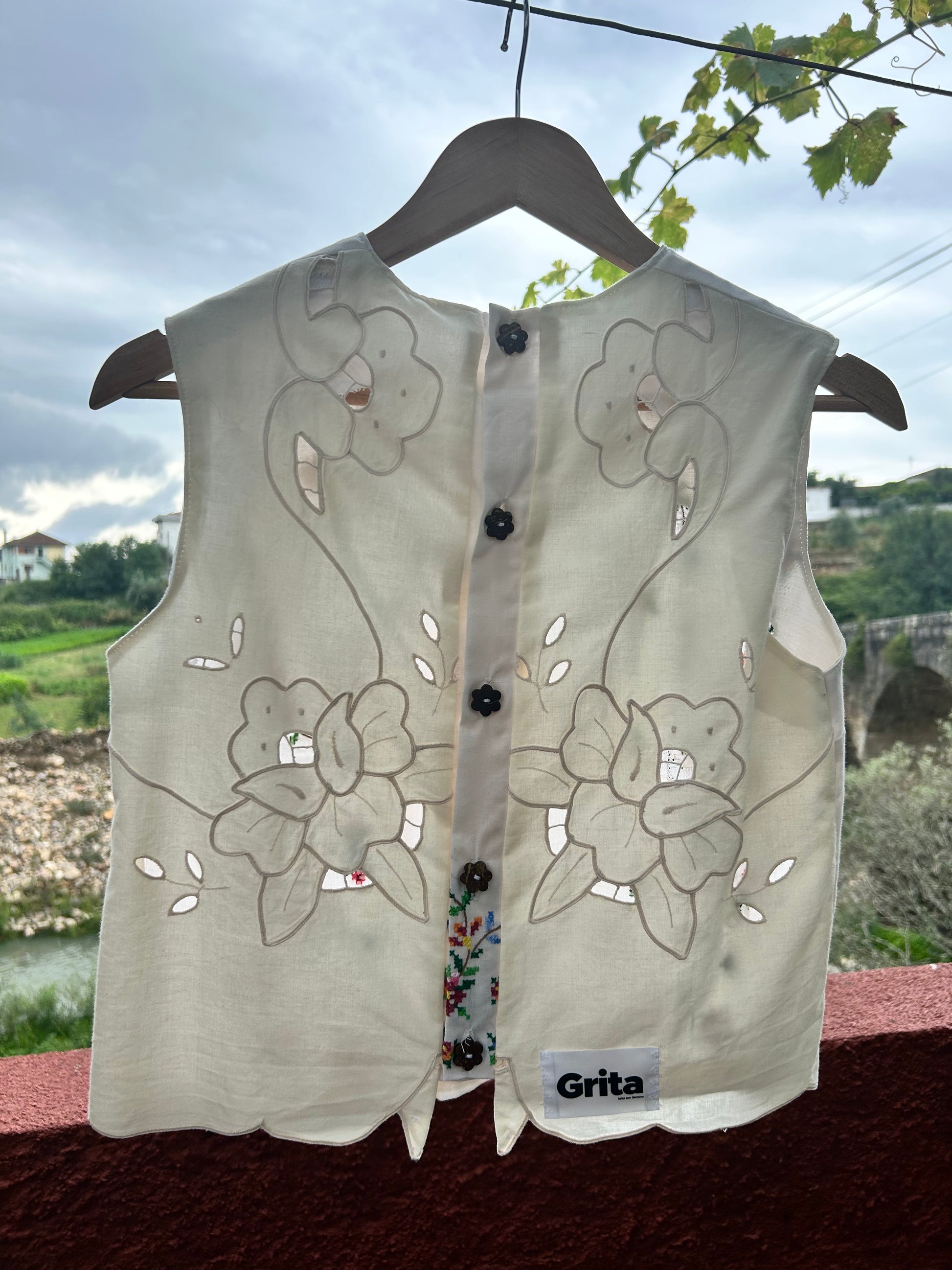 Top único e muito elegante em linho feito à mão com duas toalhas de chá. É perfeito para combinar com um par de calças de cintura subida.