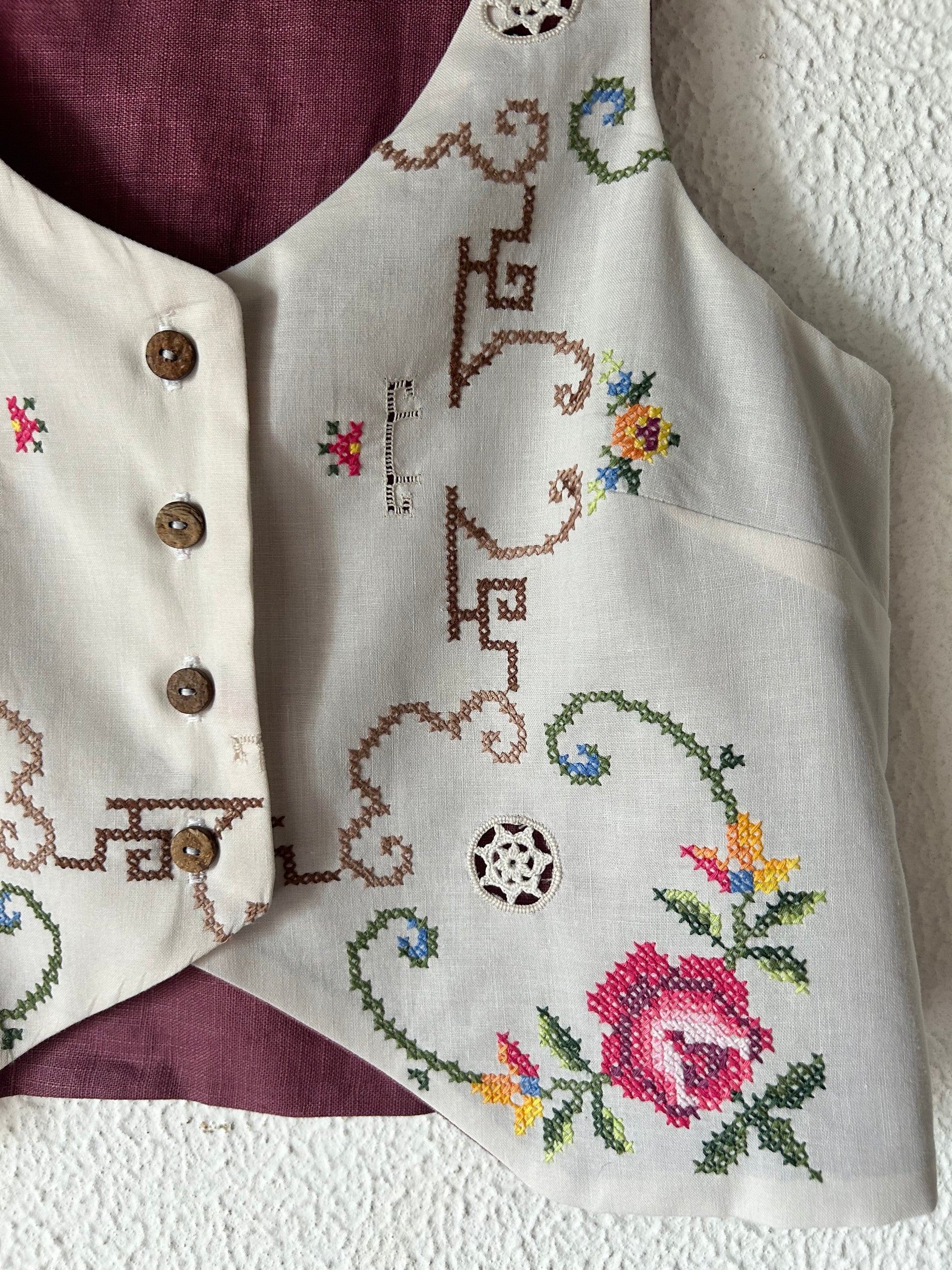 Beautiful handmade vest with cross stitch embroidery. Can be worn with nothing underneath or with a t-shirt.