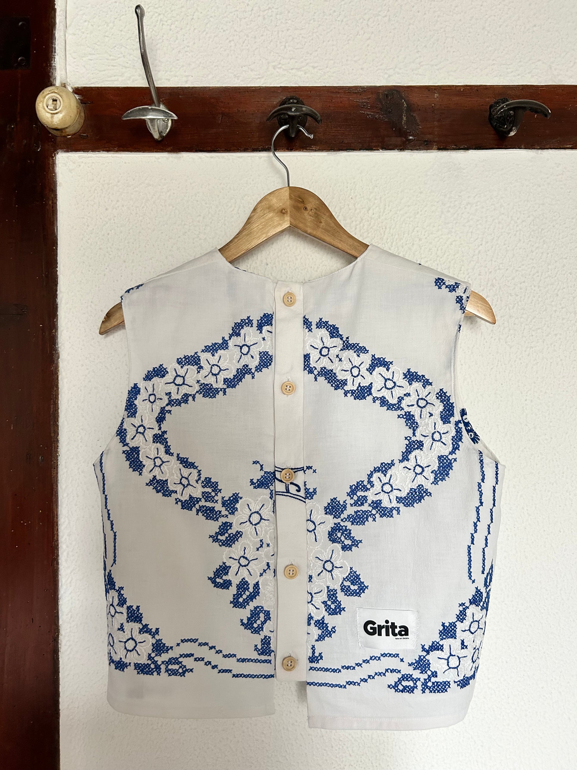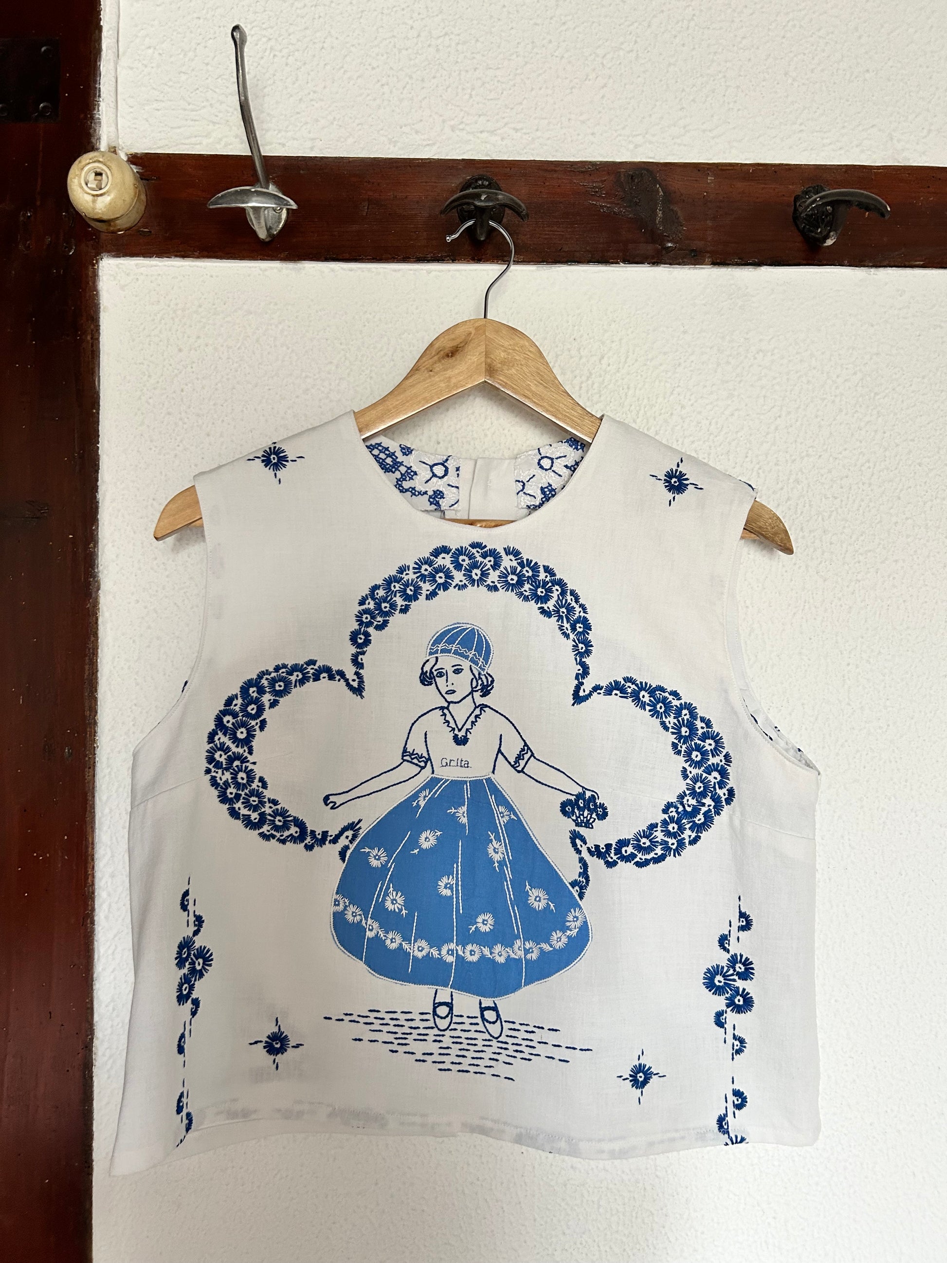 A GRITA utiliza tecidos usados dando-lhes uma nova função. Este top era uma antiga cortina. Por isso, os tecidos podem ter pequenas imperfeições ou sinais de desgaste que tentamos disfarçar o melhor possível.