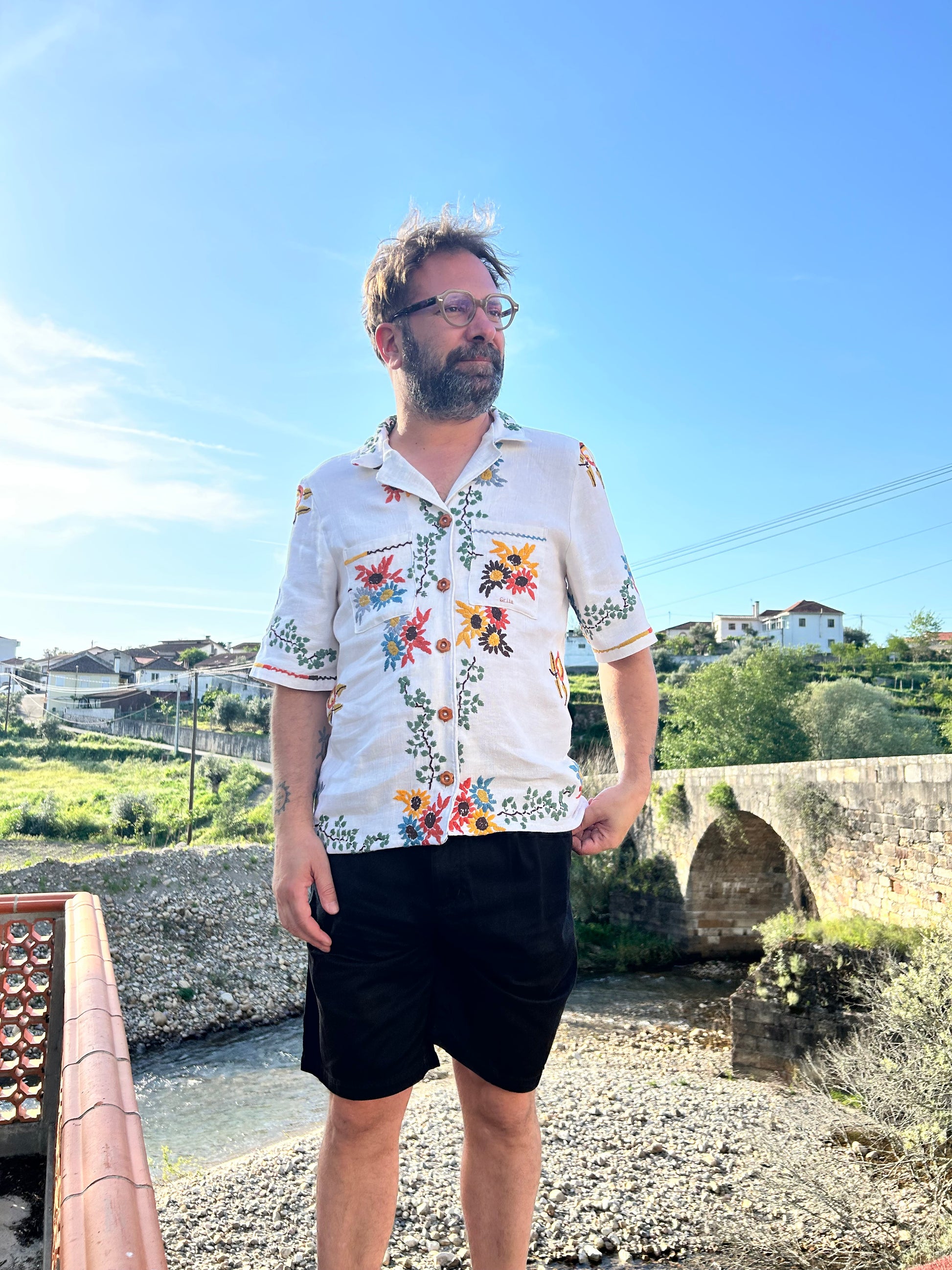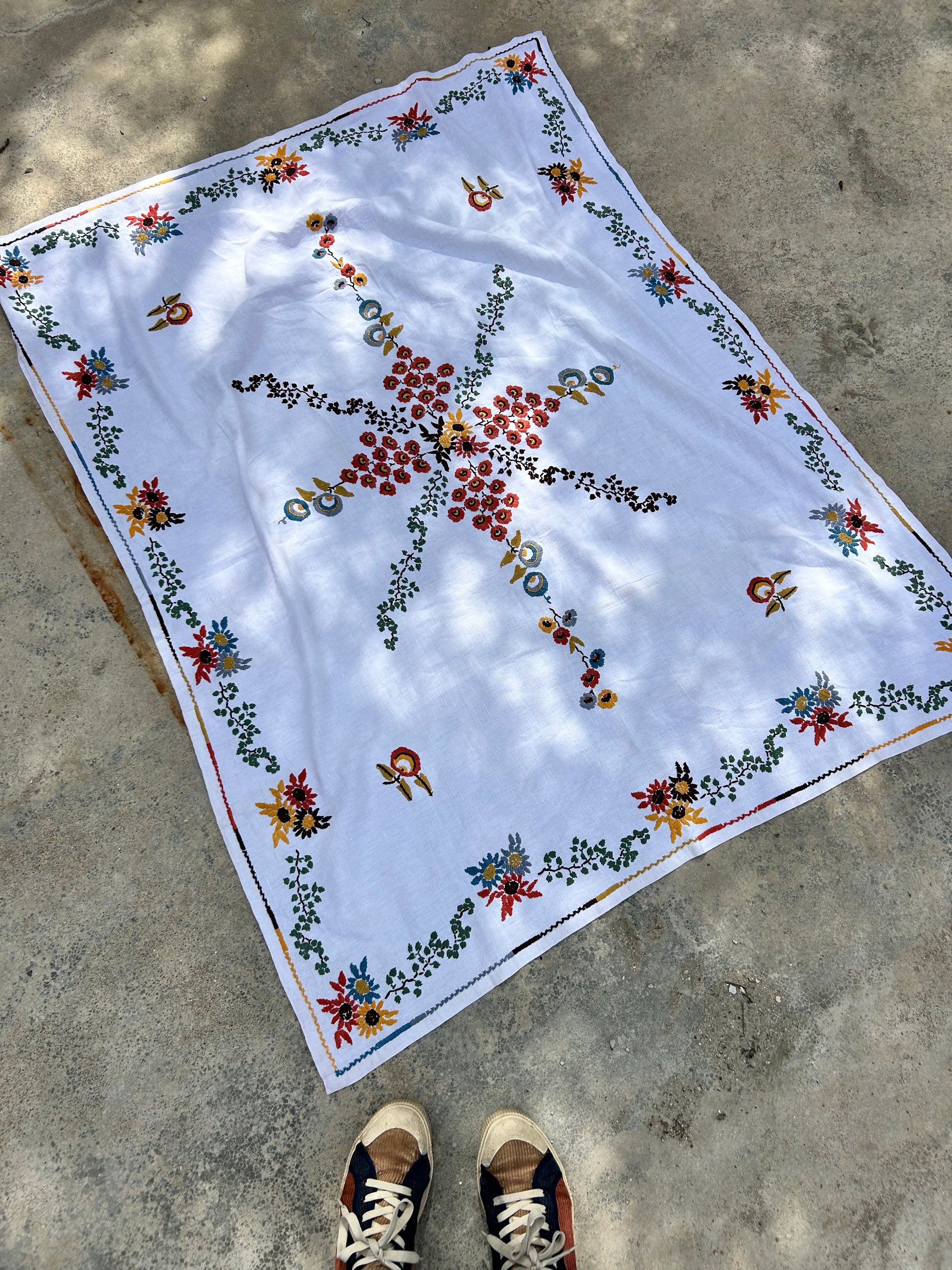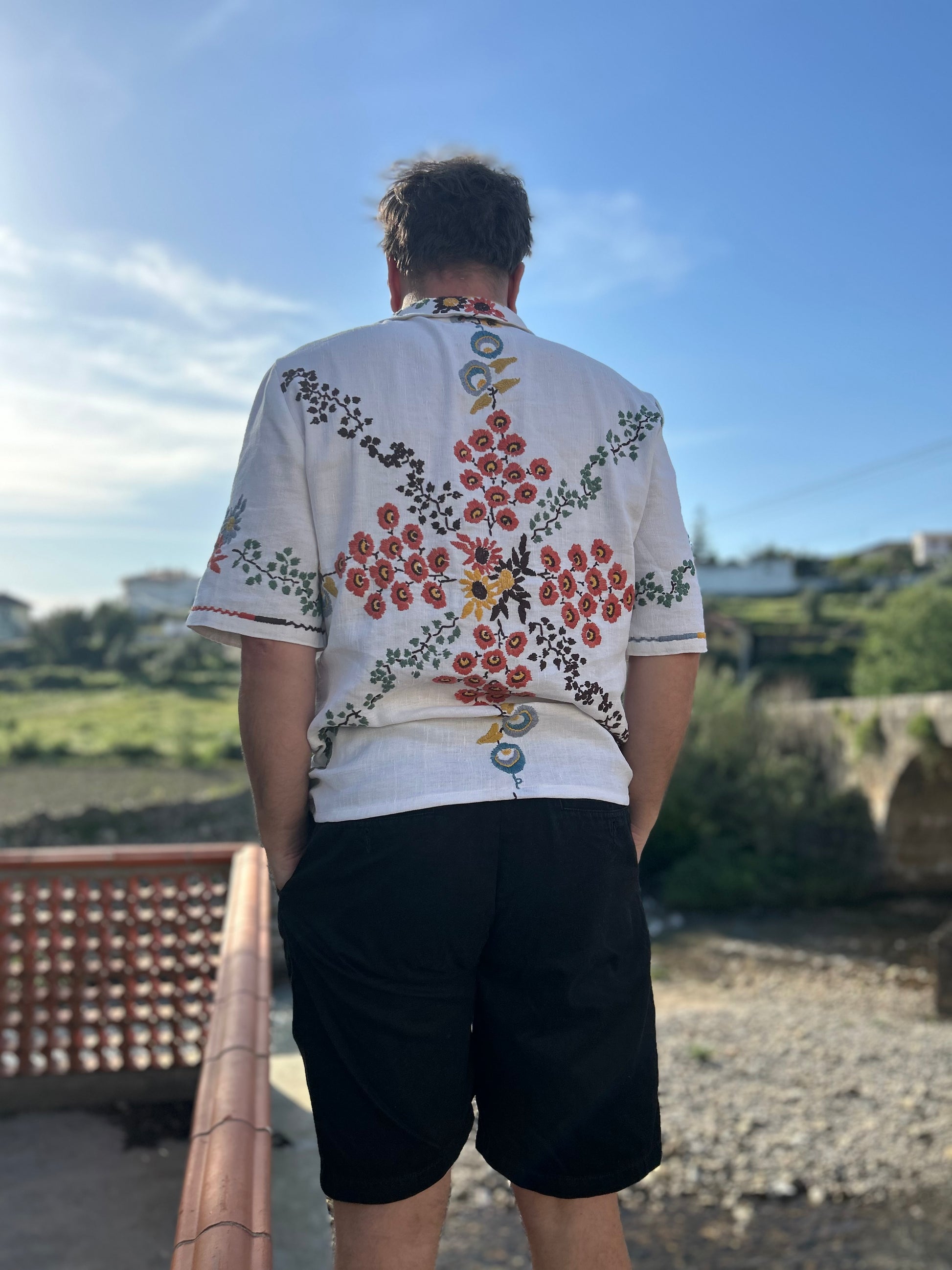 Bonita camisa florida, bordada à mão, feita a partir de uma toalha de mesa