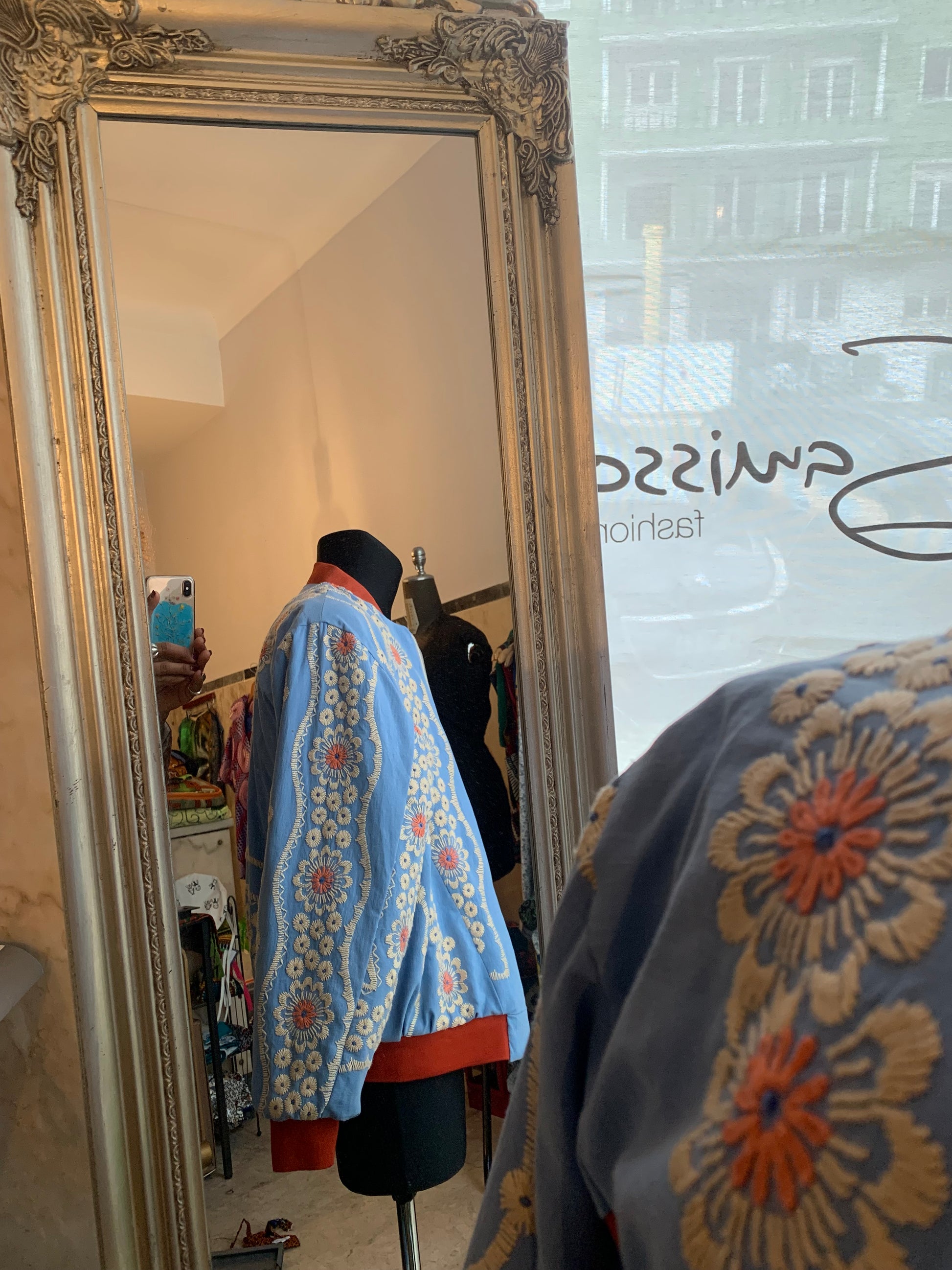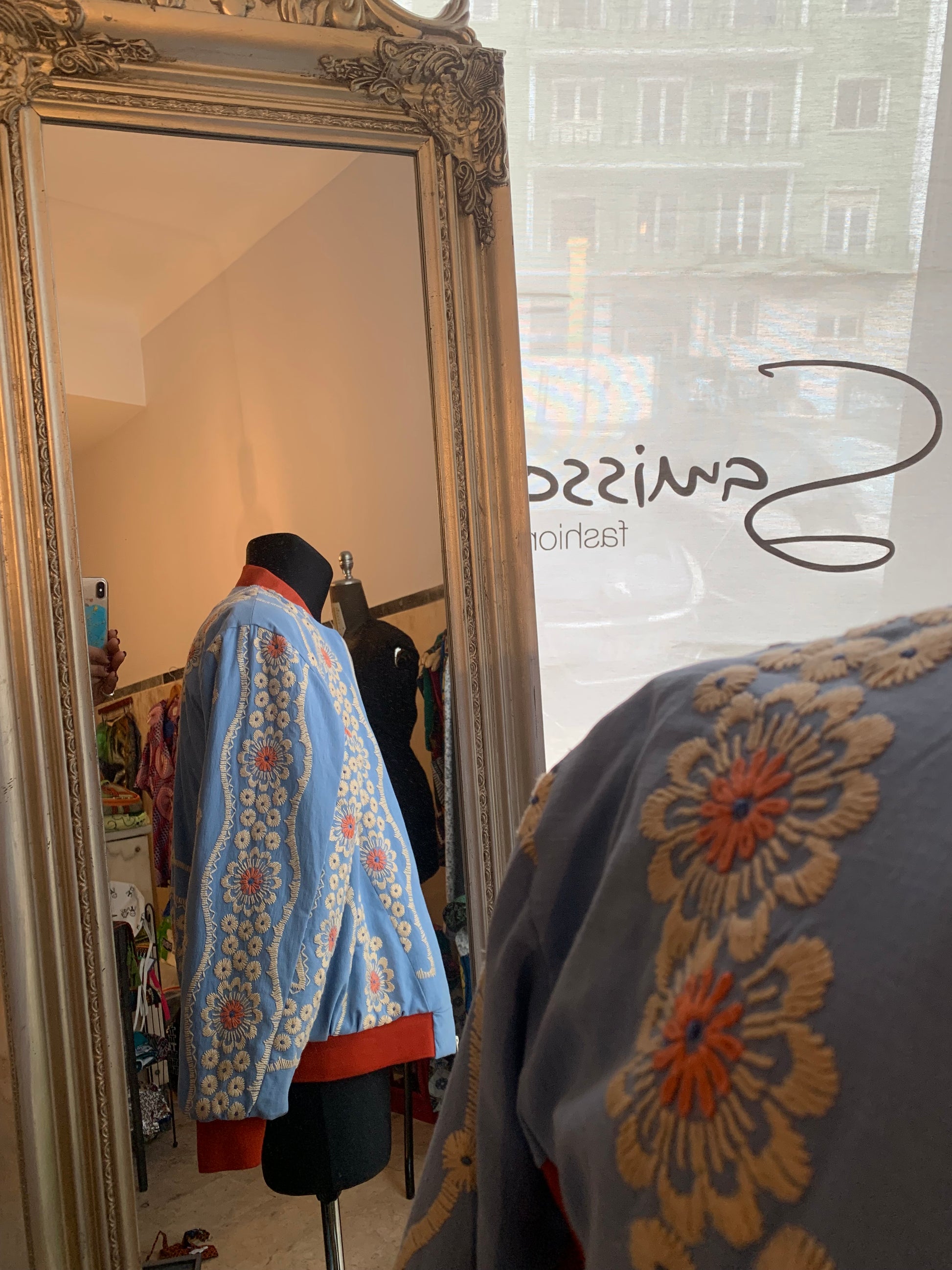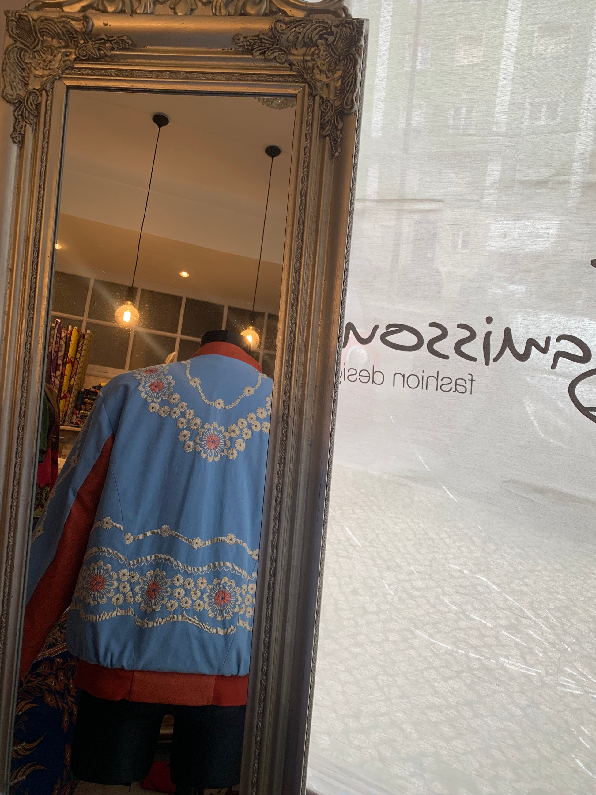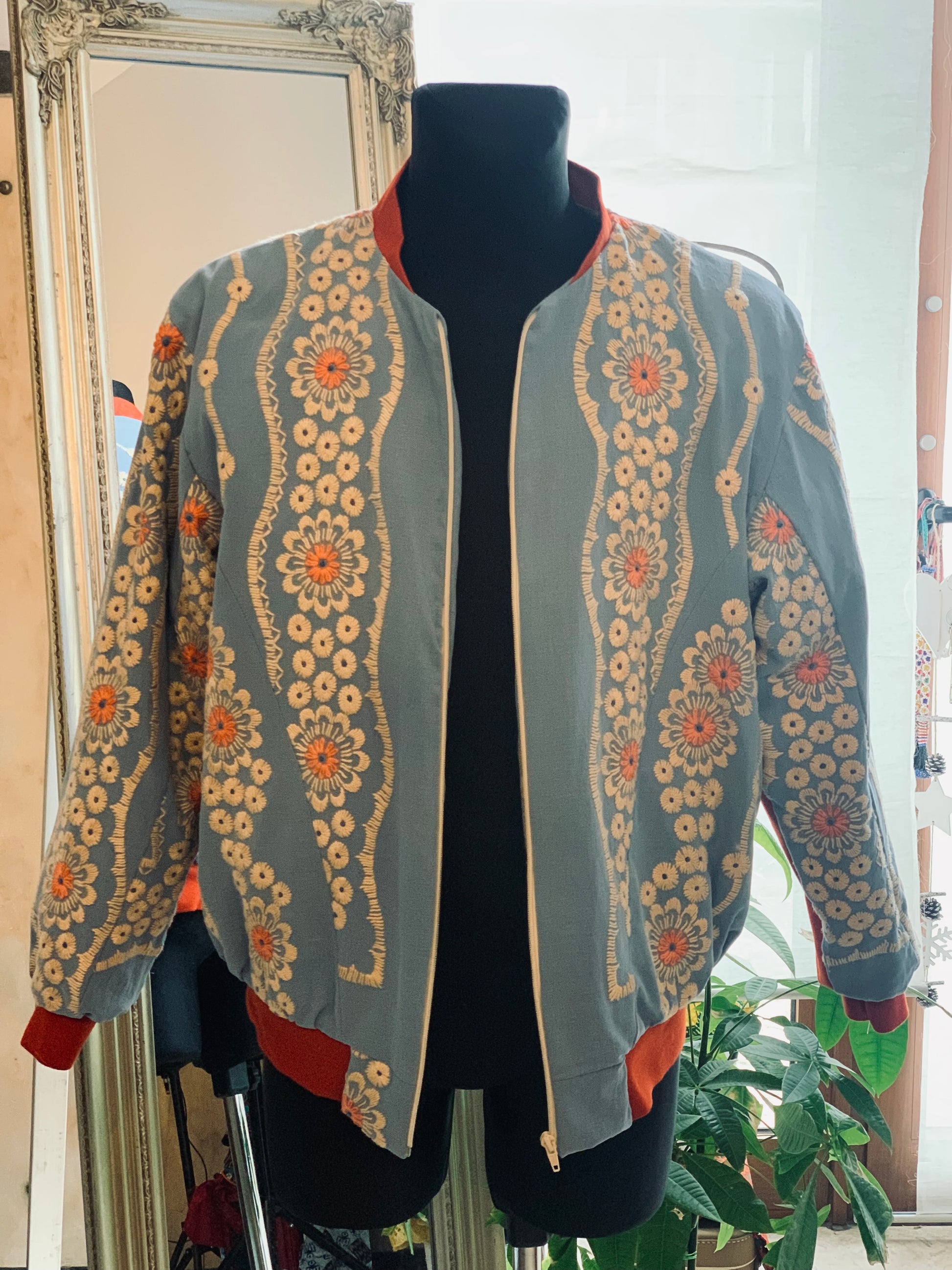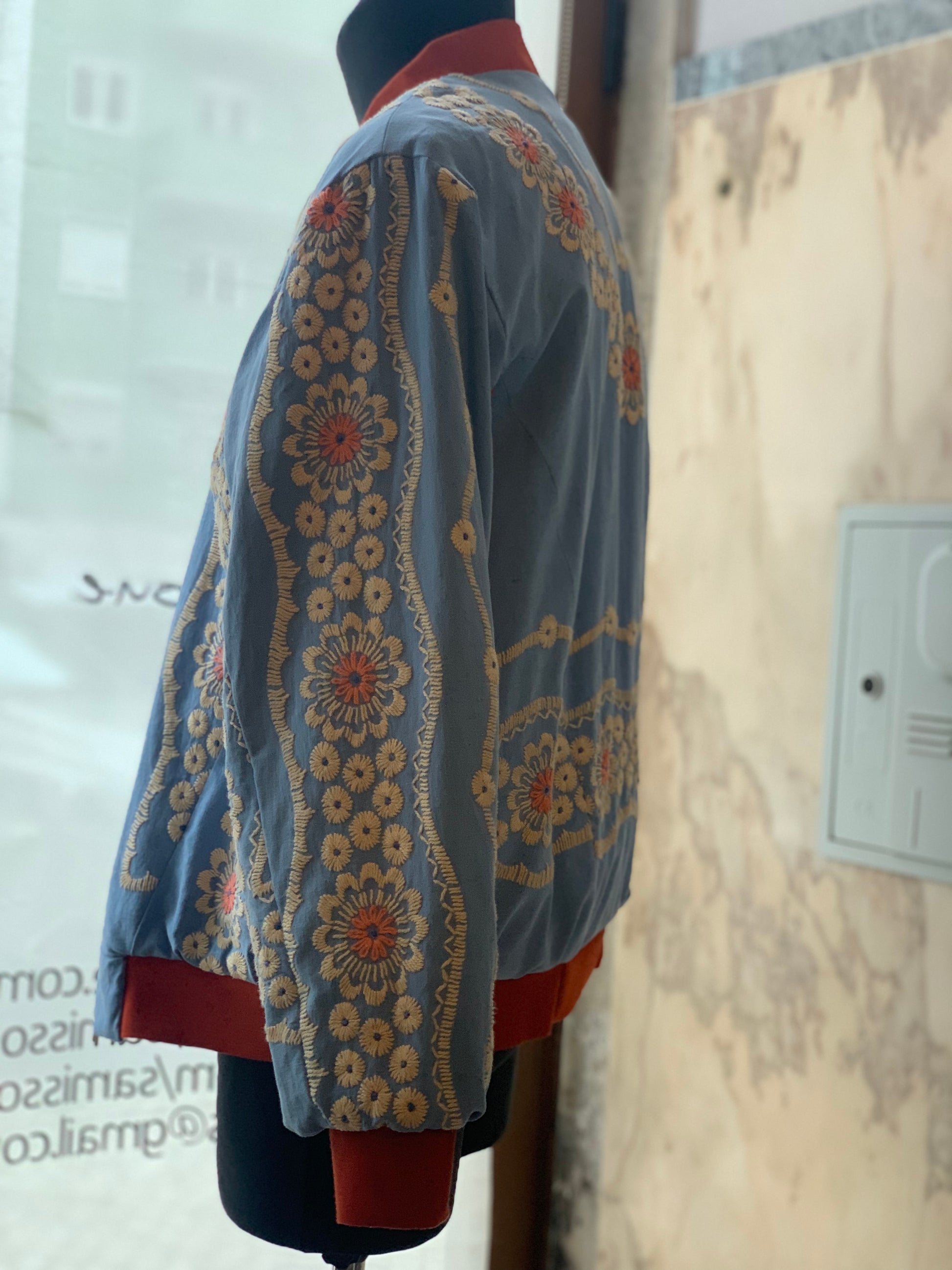 Casaco bomber criado pela Designer Teresa Samissone.para o projeto GRITA SAMISSONE. Um projeto que resultou do encontro das duas duas criadoras, Cristina e Teresa, na Academia de Mulheres empreendedoras. Podem saber mais neste link: https://fashionhub.pt/grita-e-samissone-lancam-colecao-exclusiva-que-une-desperdicio-textil-e-criatividade/