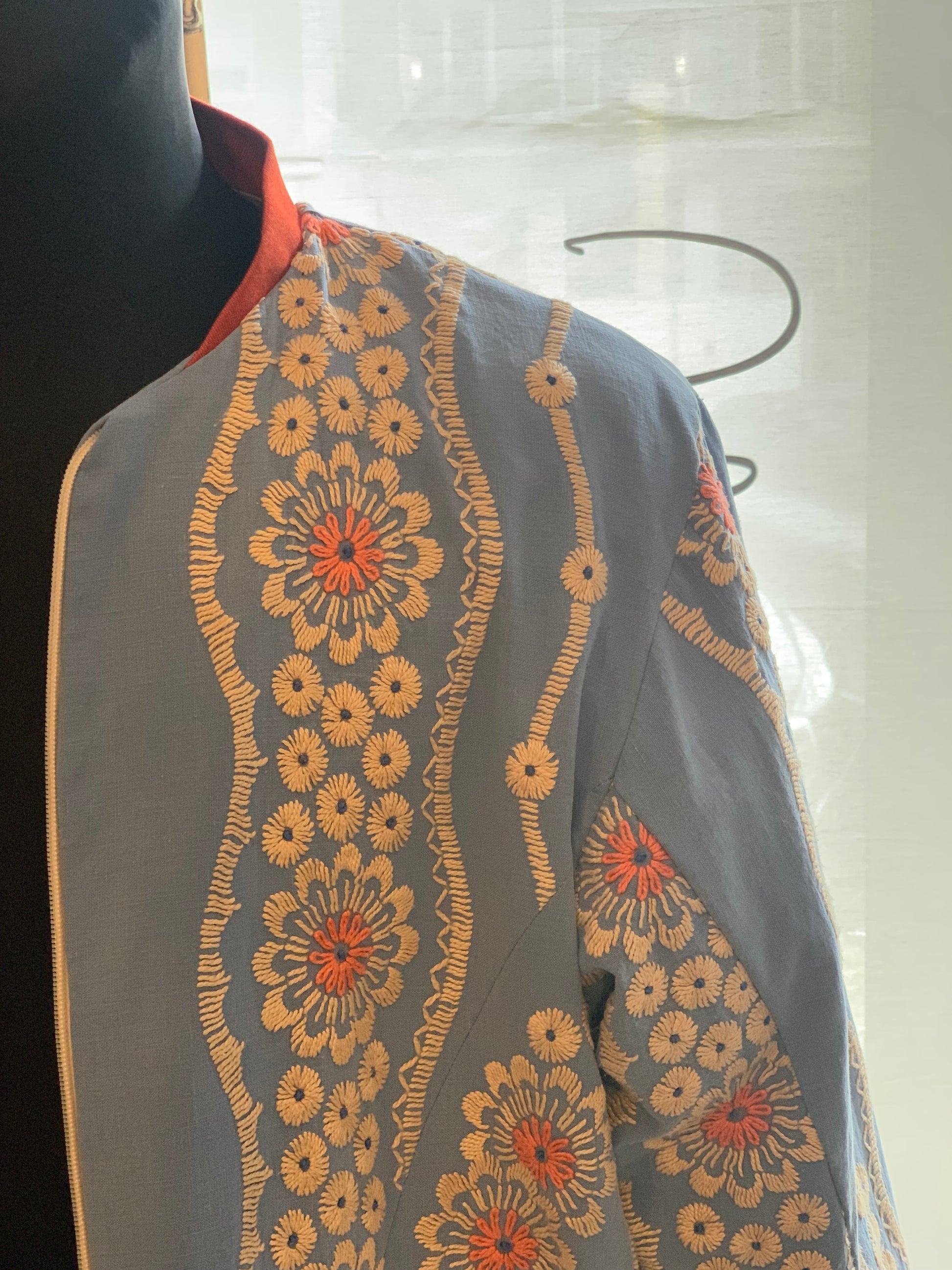 "Criado a partir de uma toalha de linho azul bordada, comprada em Espinho, cada detalhe carrega um legado artesanal, agora transformado em moda contemporânea.