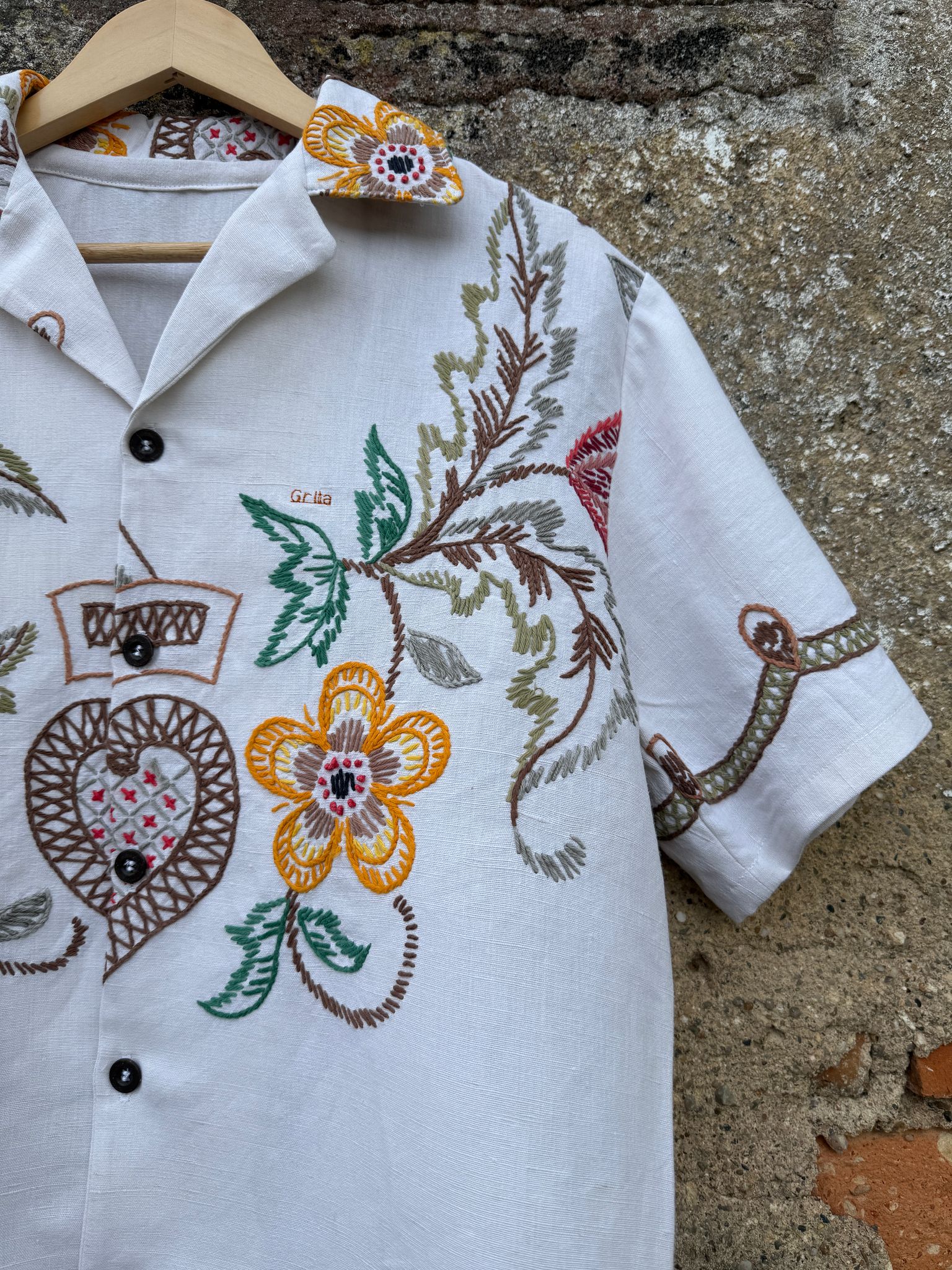A GRITA utiliza tecidos usados dando-lhes uma nova função. Esta camisa era uma antiga toalha de mesa. Por isso, os tecidos podem ter pequenas imperfeições ou sinais de desgaste que tentamos disfarçar o melhor possível.