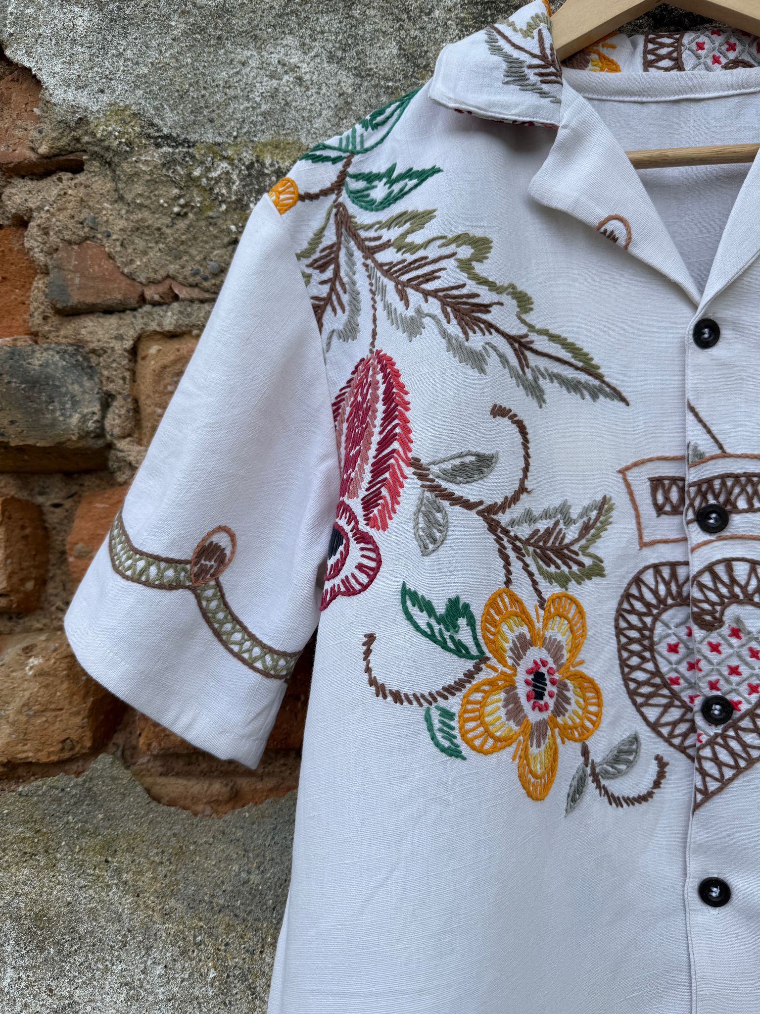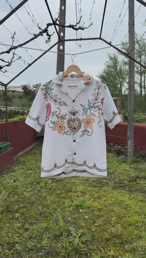 Camisa muito especial, feita com uma toalha de mesa bordada à mão