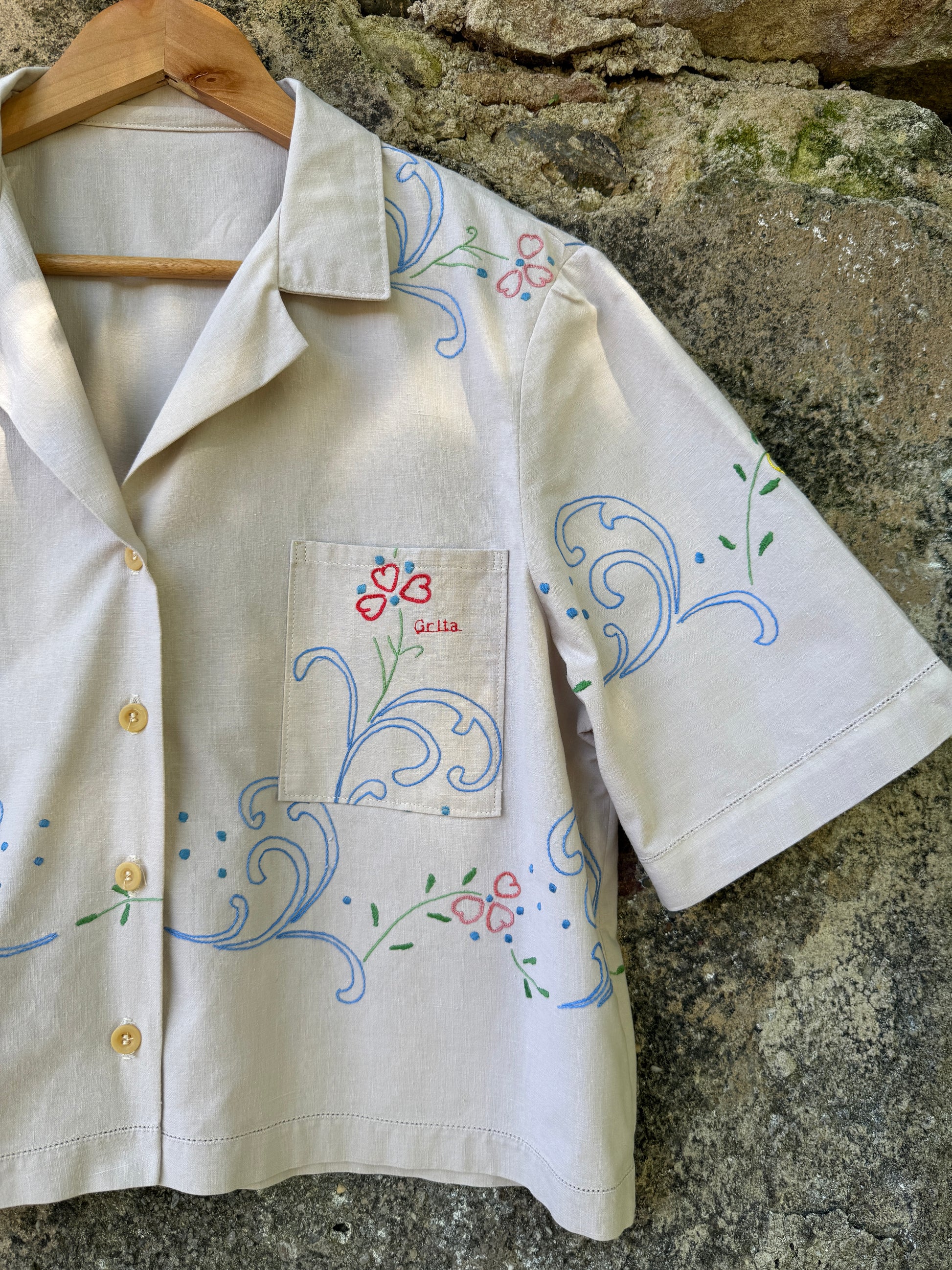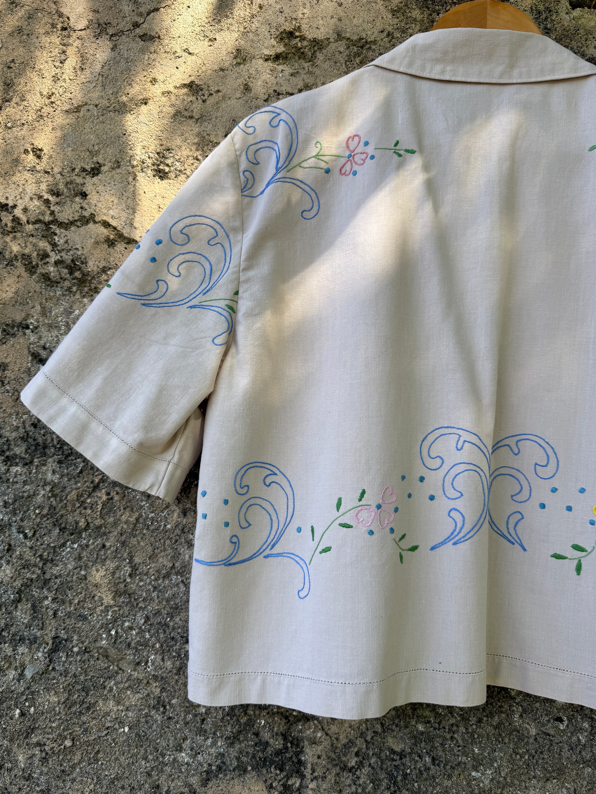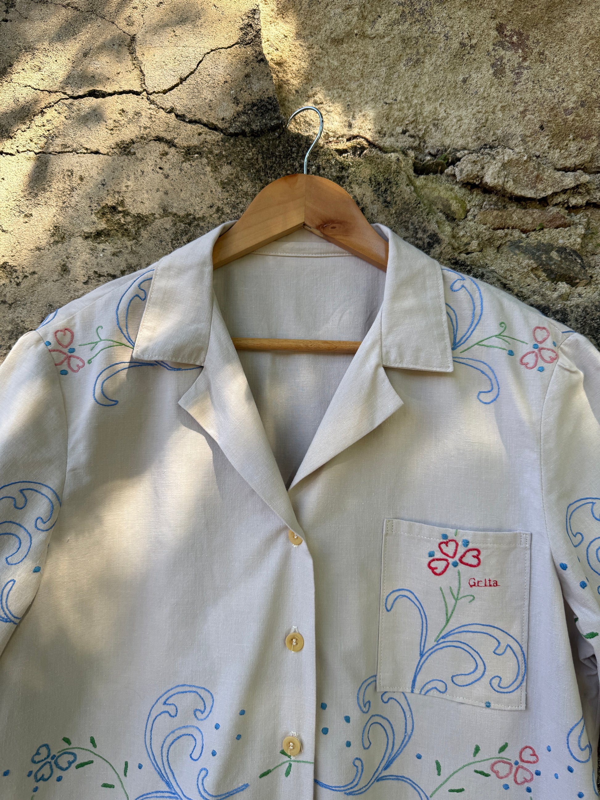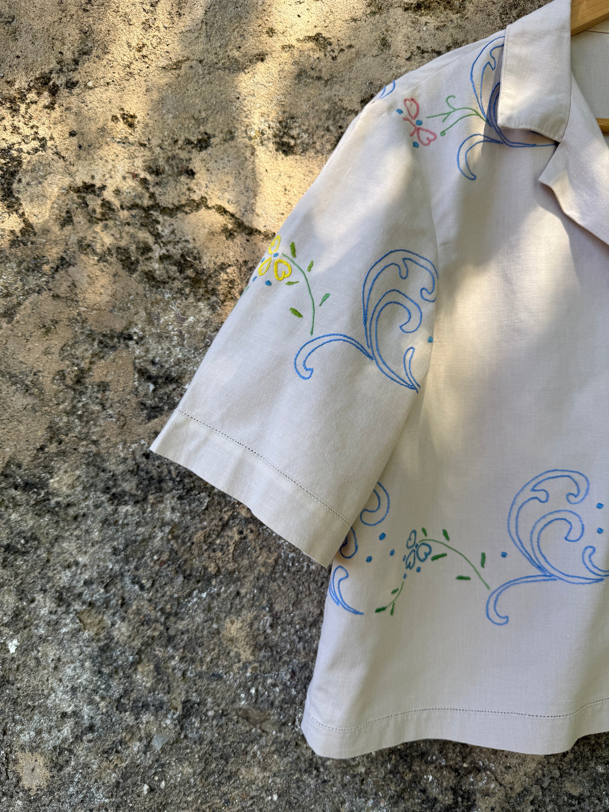 Beautiful shirt made from a hand-embroidered linen tablecloth found in a home furnishings collection warehouse