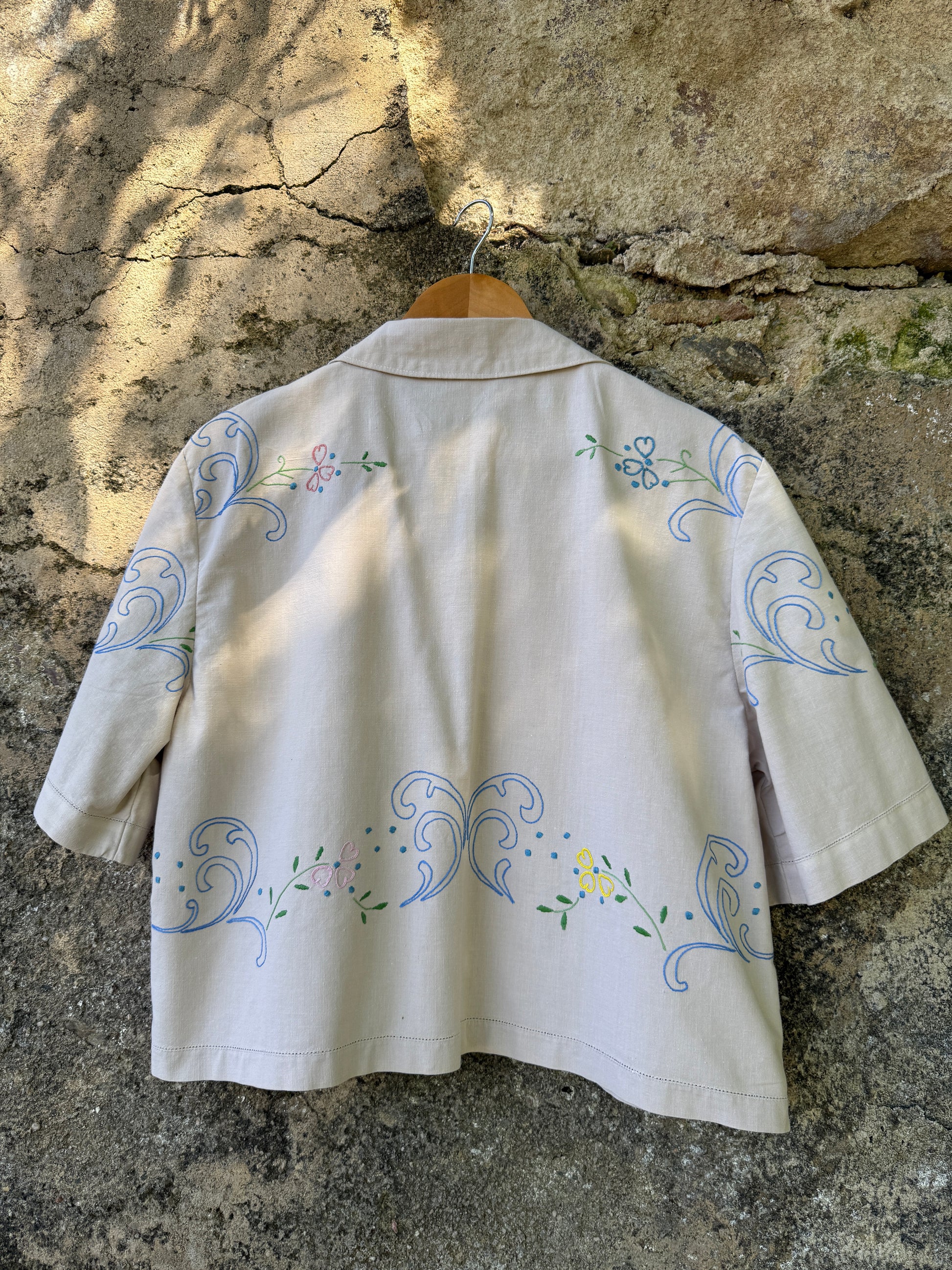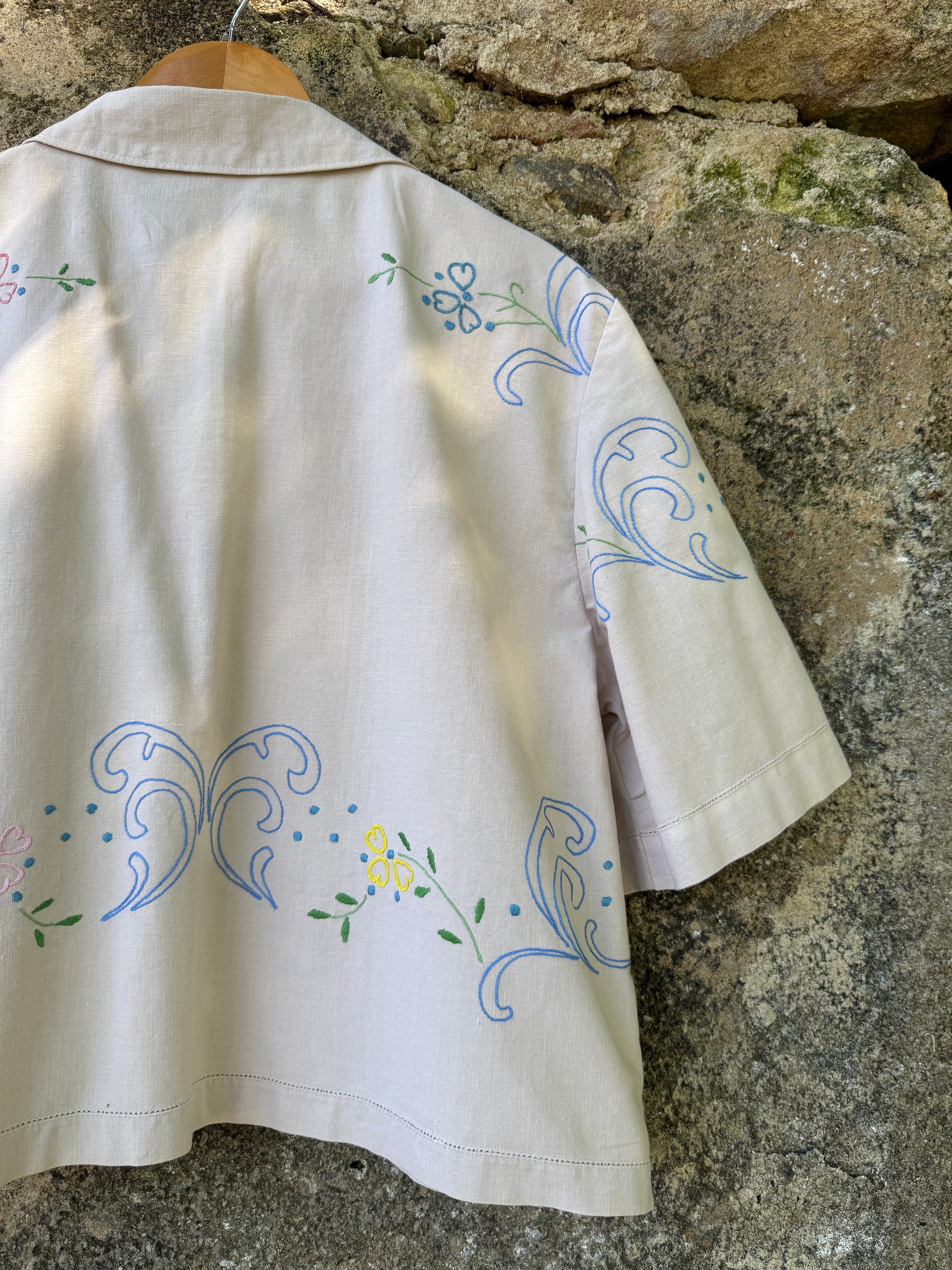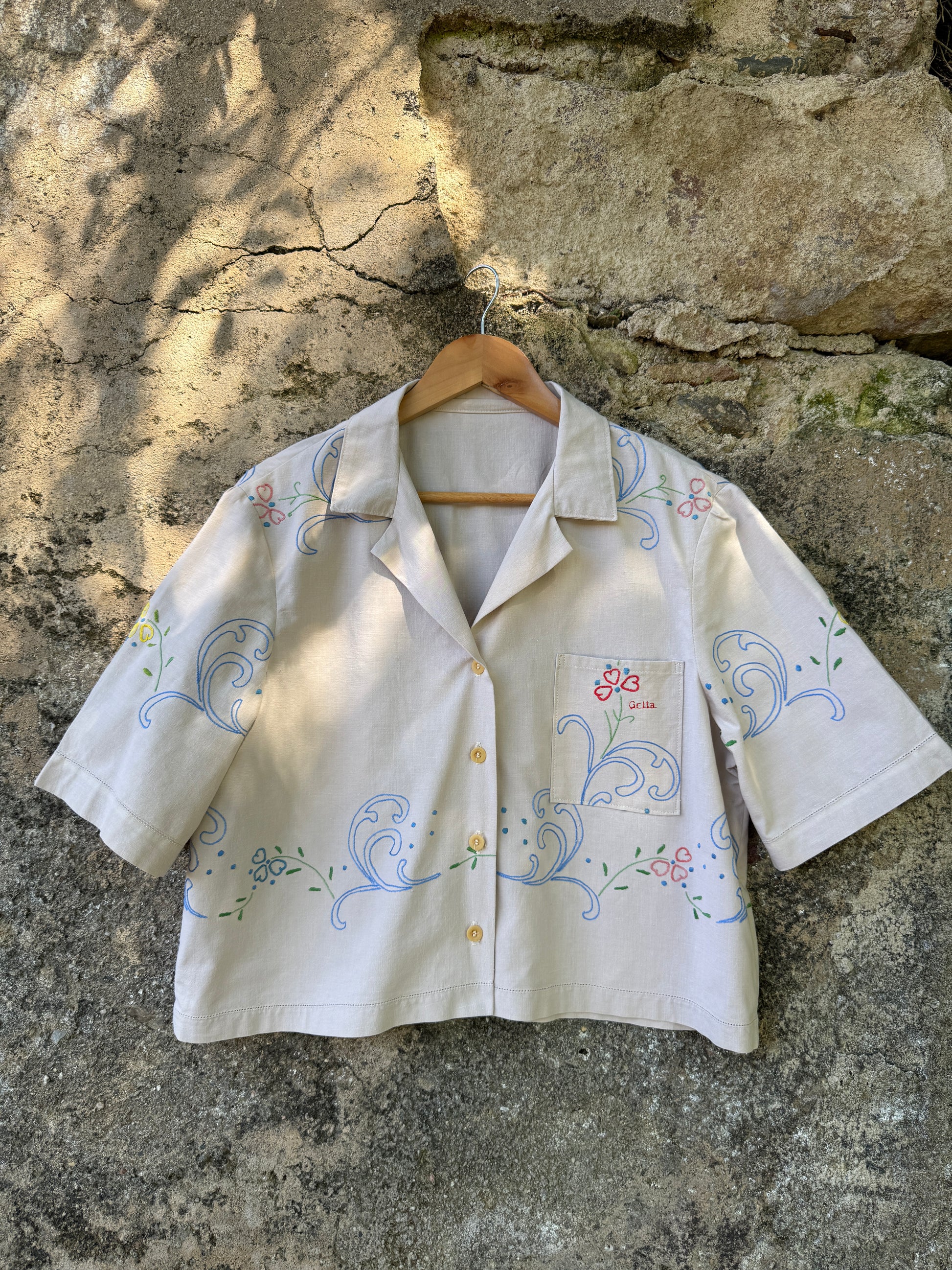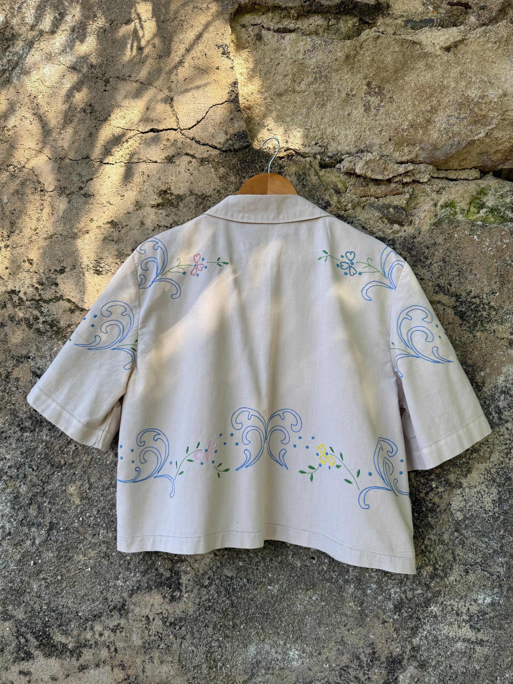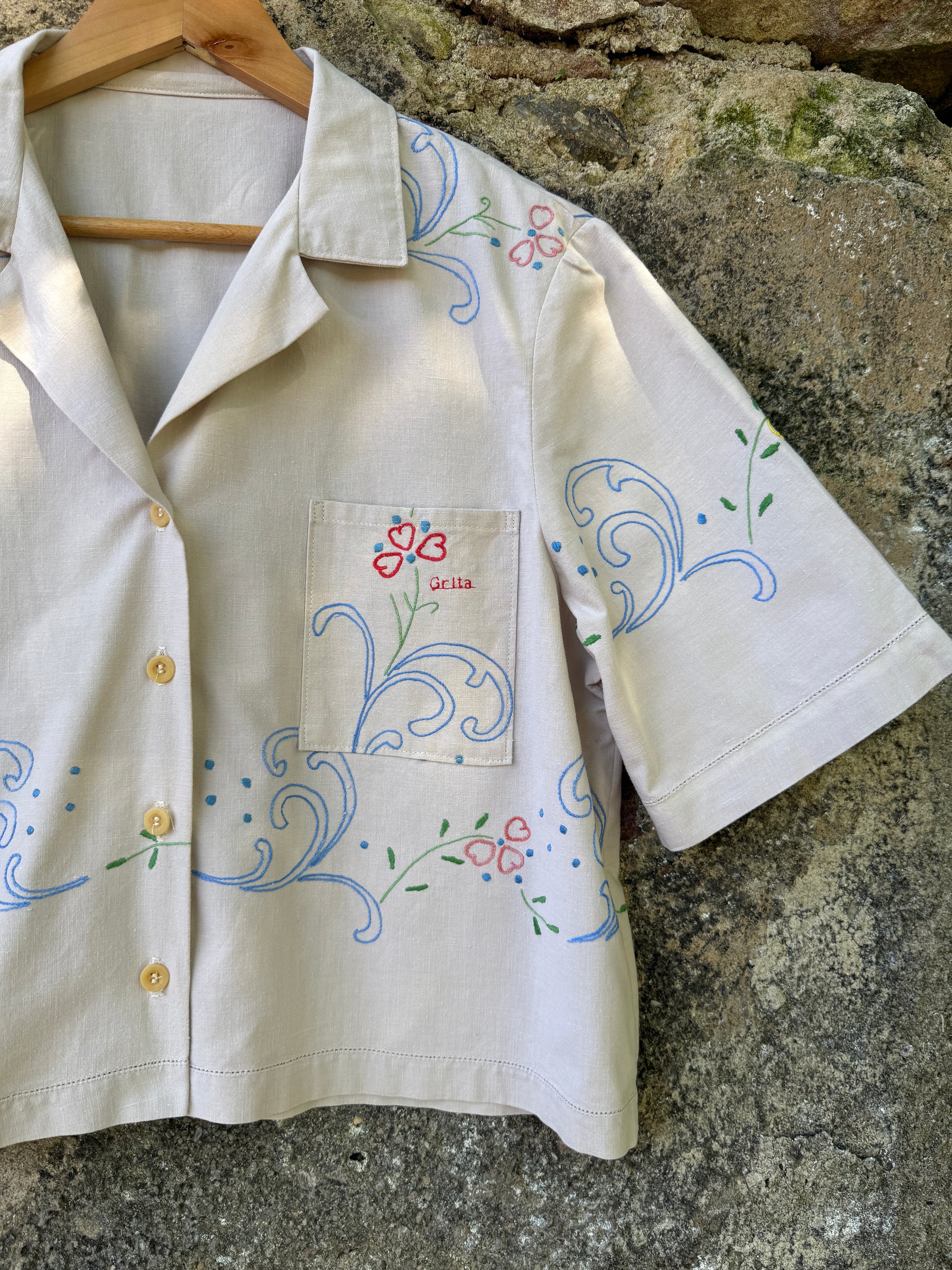 Beautiful shirt made from a hand-embroidered linen tablecloth found in a home furnishings collection warehouse