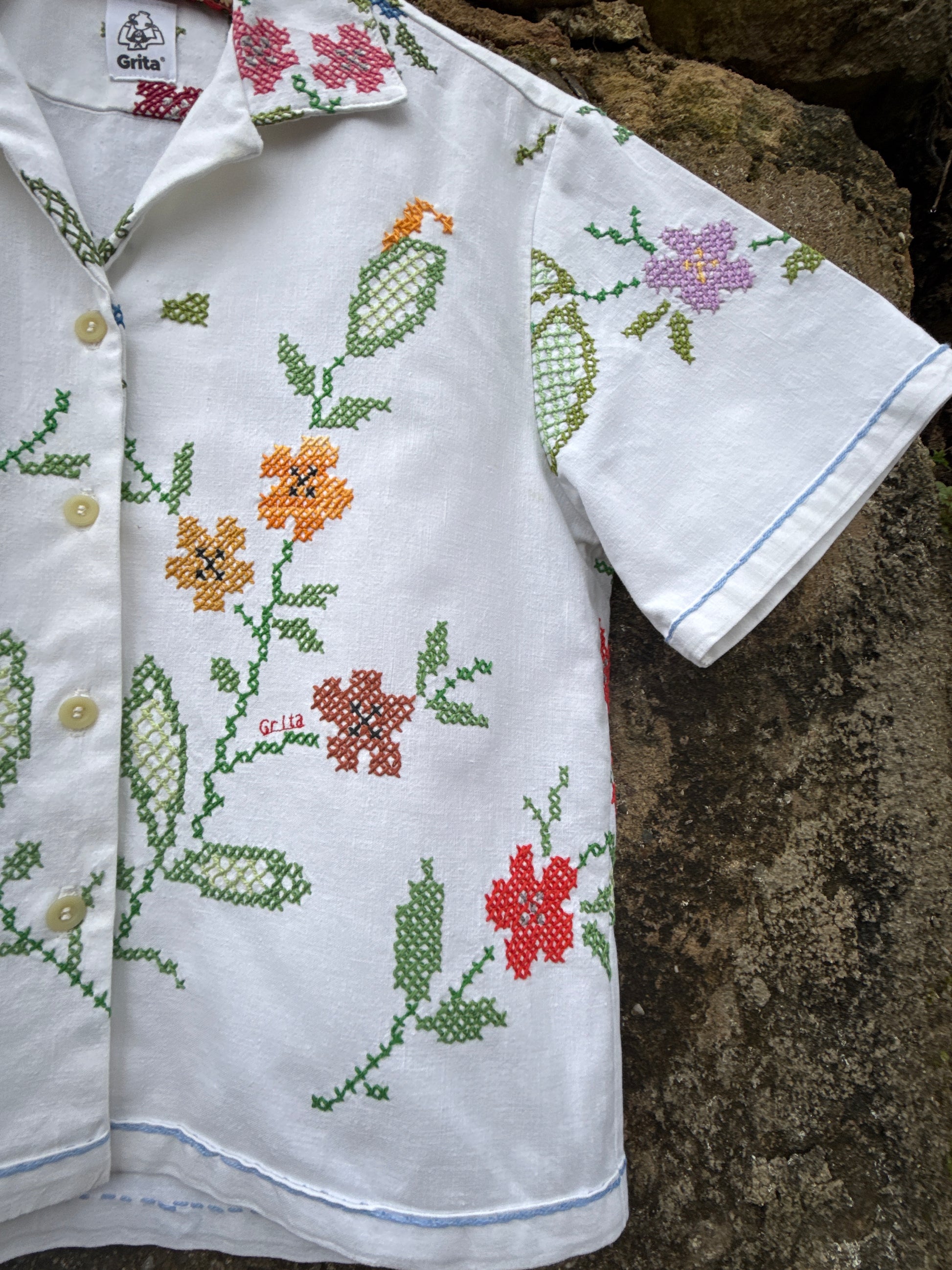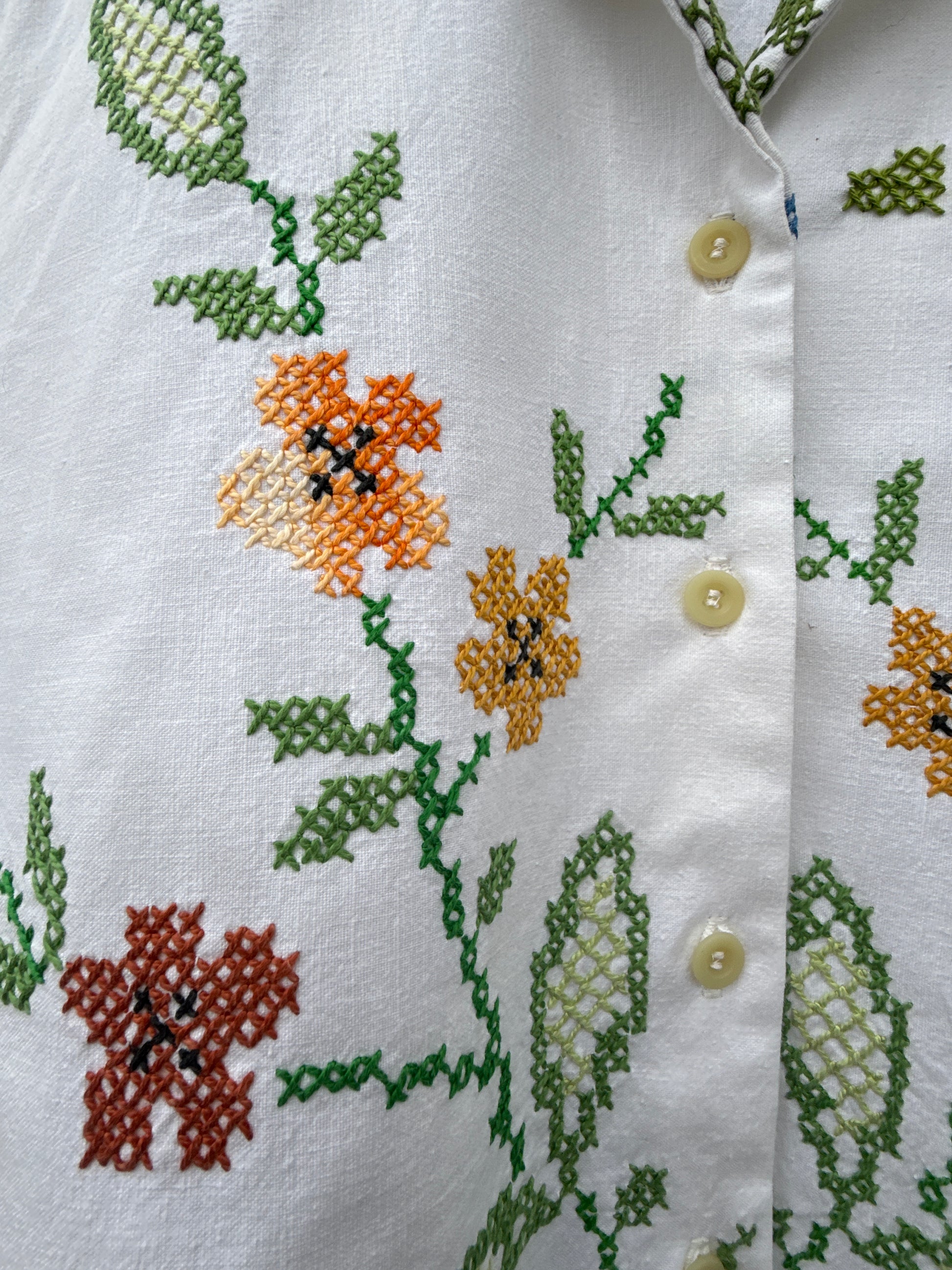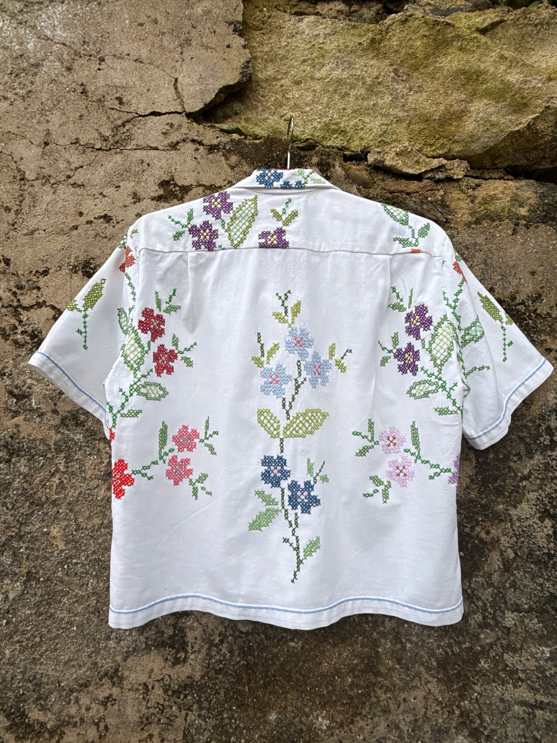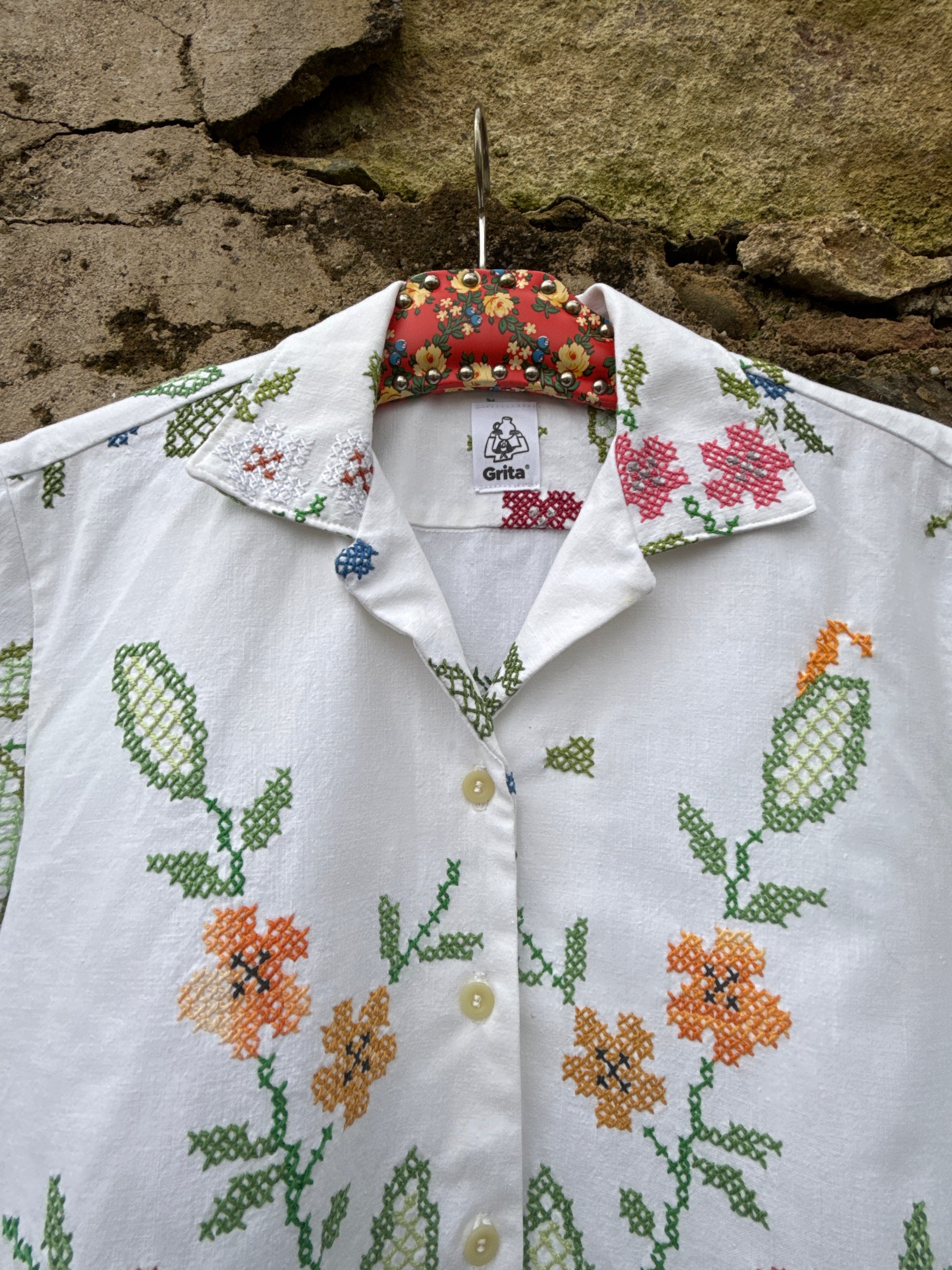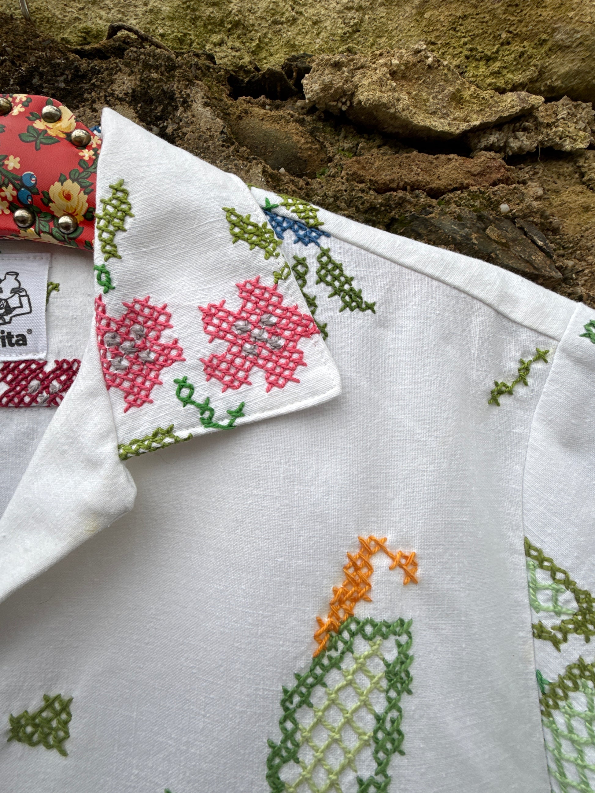 Bonita camisa, feita com uma toalha de mesa em linho e bordada à mão em ponto cruz