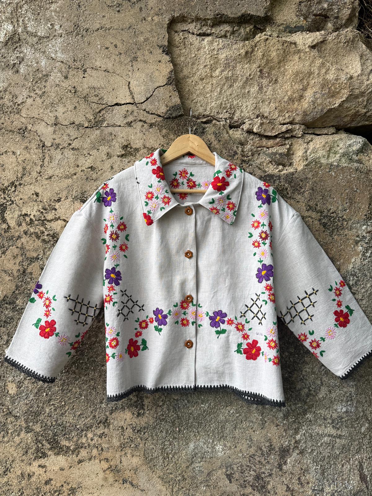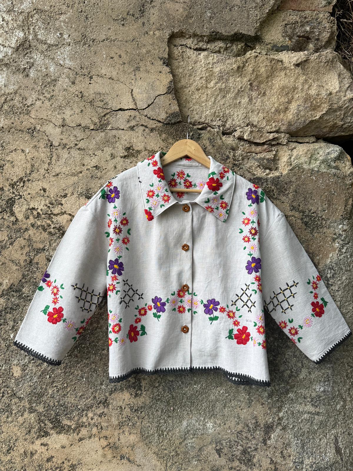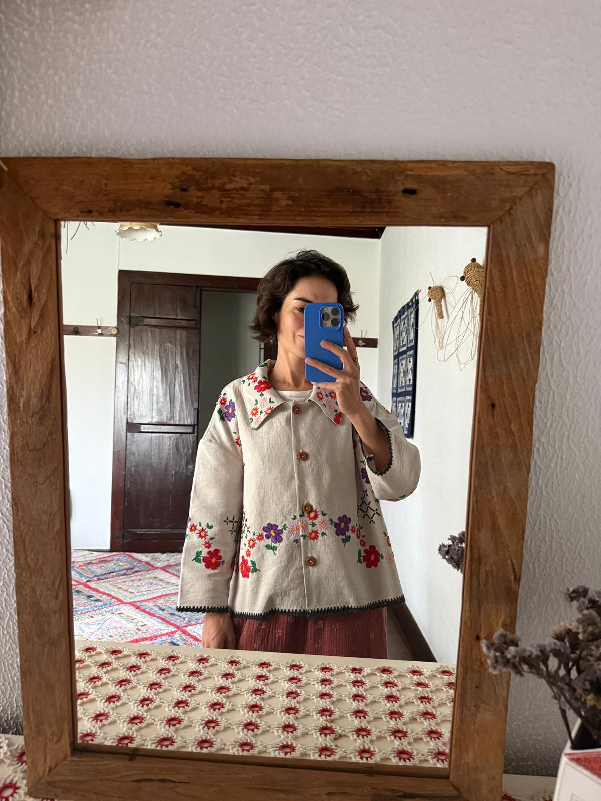 Casaco muito especial feito com uma toalha de mesa em linho com flores bordadas