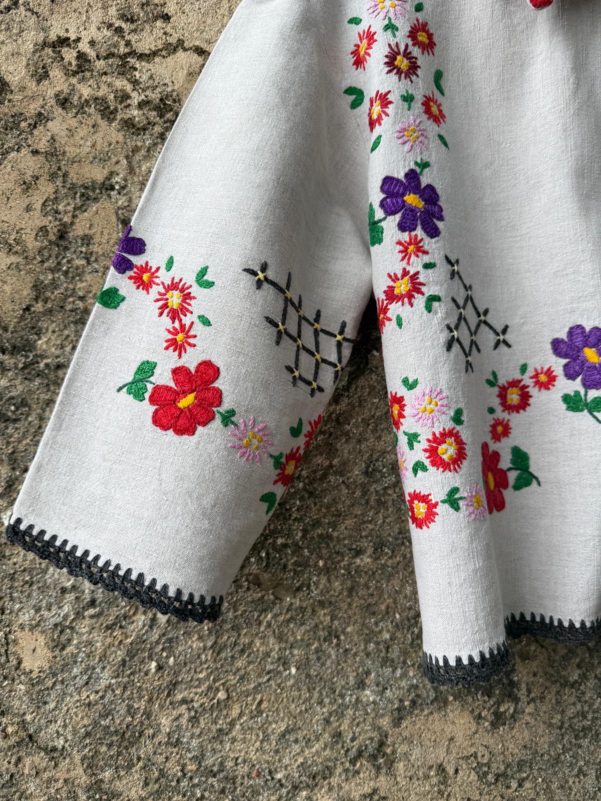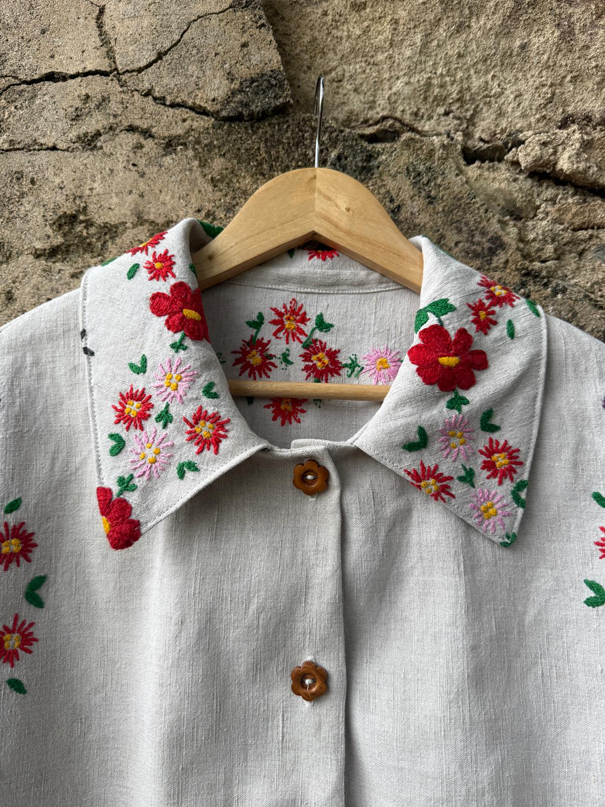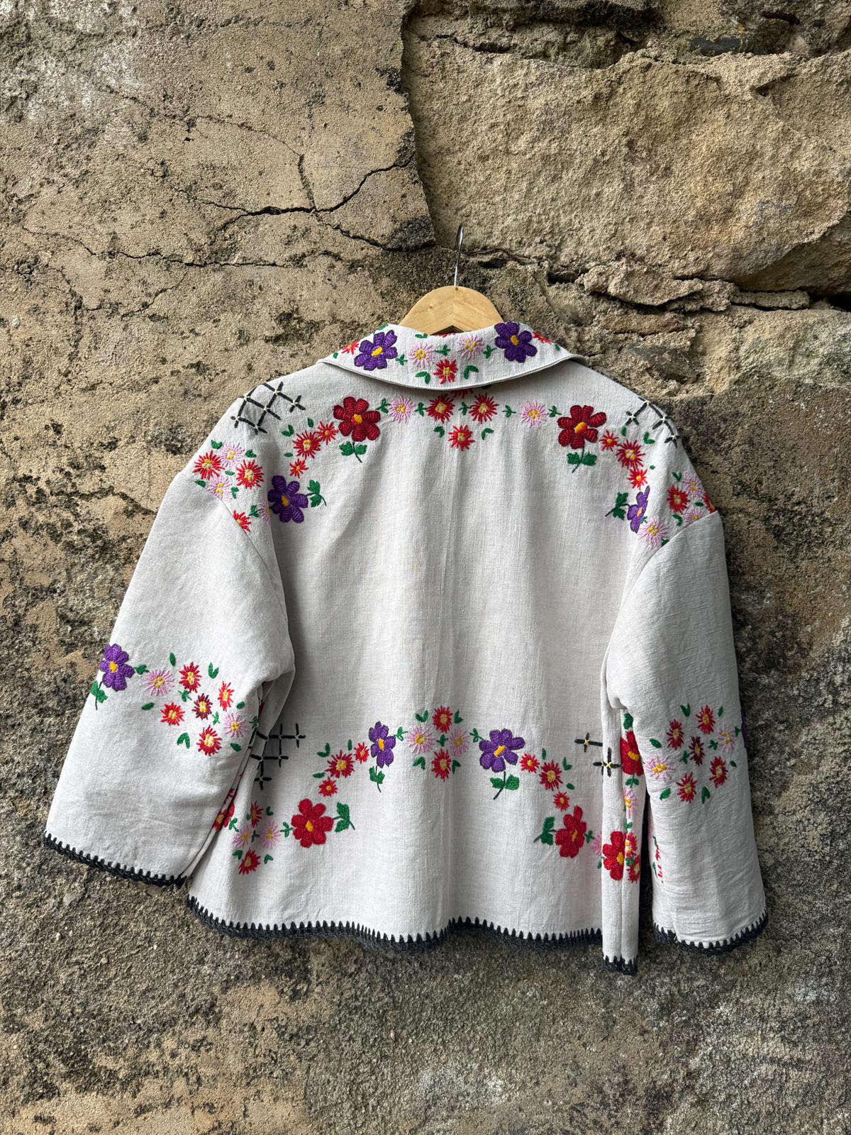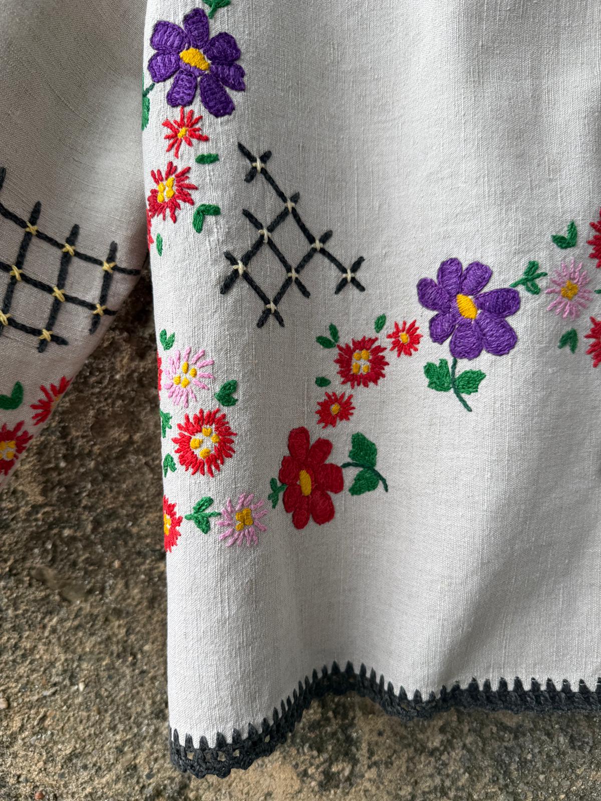 Casaco muito especial feito com uma toalha de mesa em linho com flores bordadas