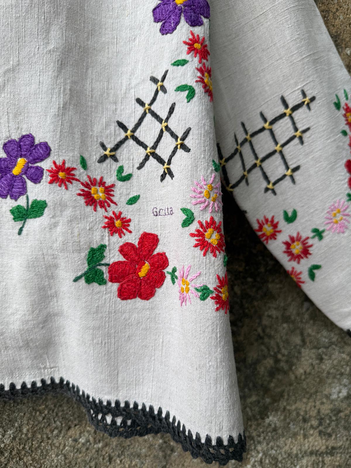 Very special coat made with a linen tablecloth with embroidered flowers.