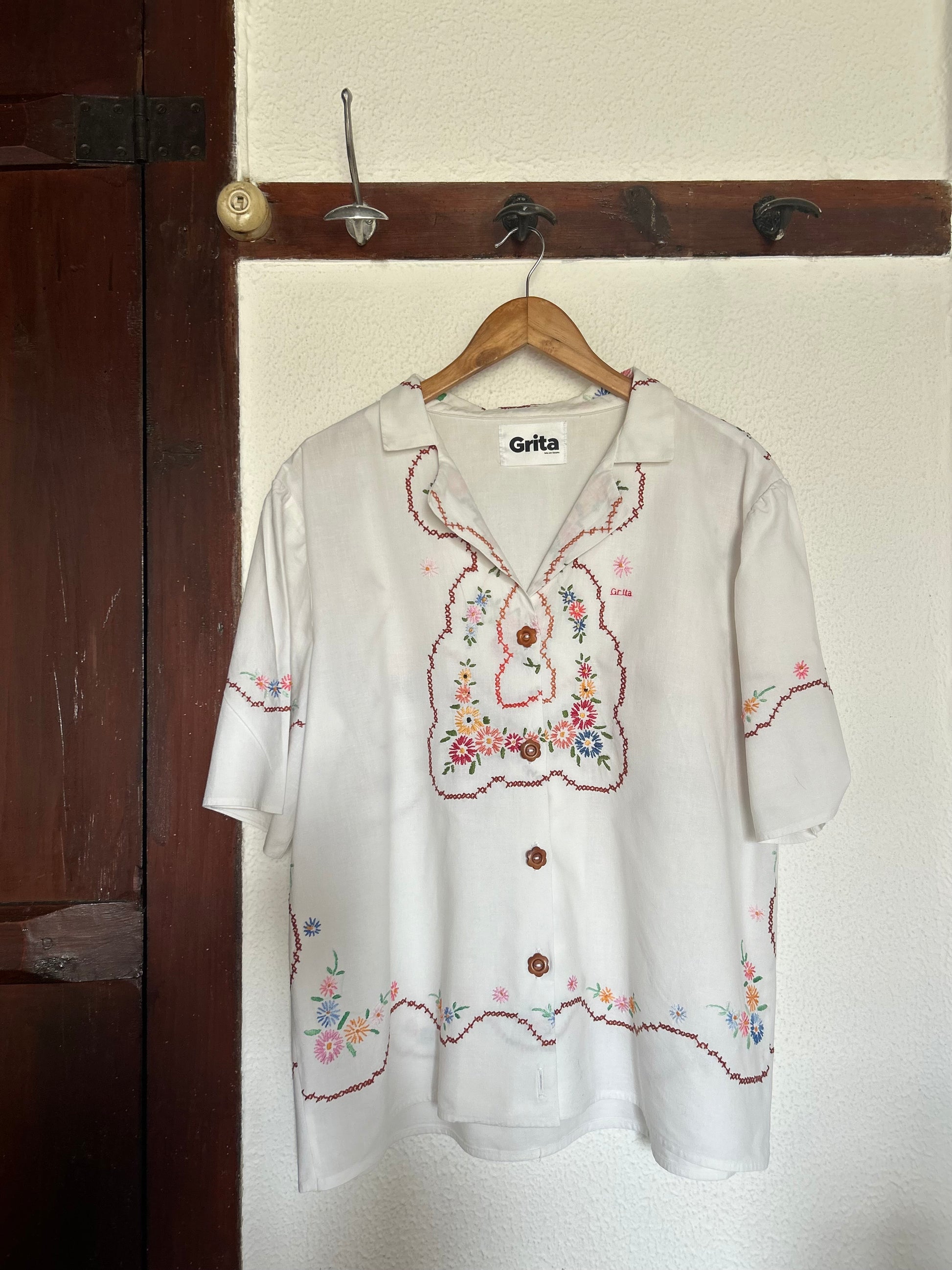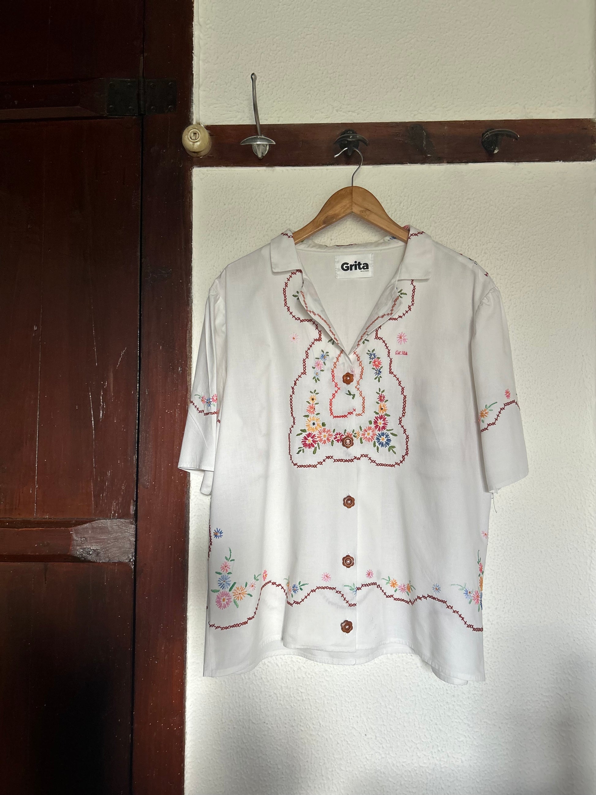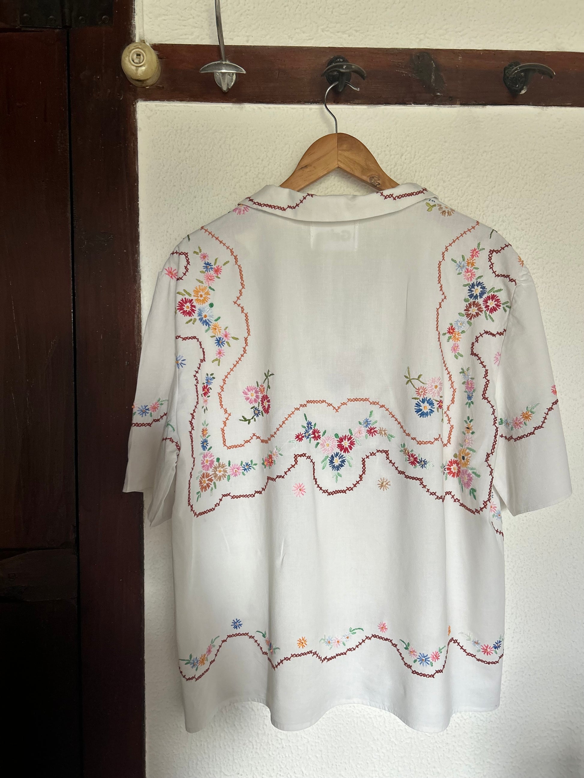 Bonita camisa florida, bordada a ponto cruz feita a partir de uma toalha de mesa