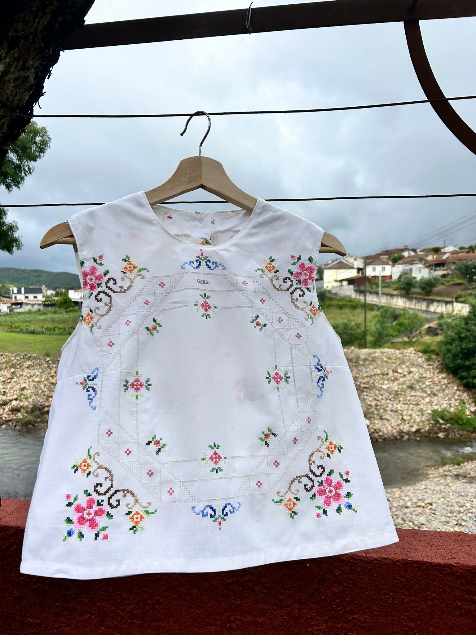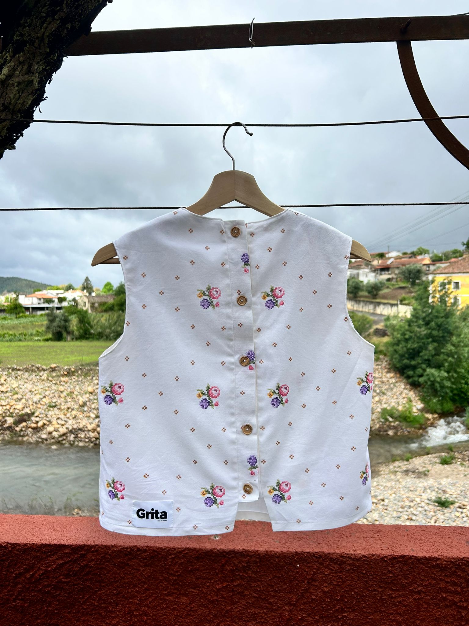 - Top muito trabalhado com bordados em ponto cruz. Tudo feito à mão