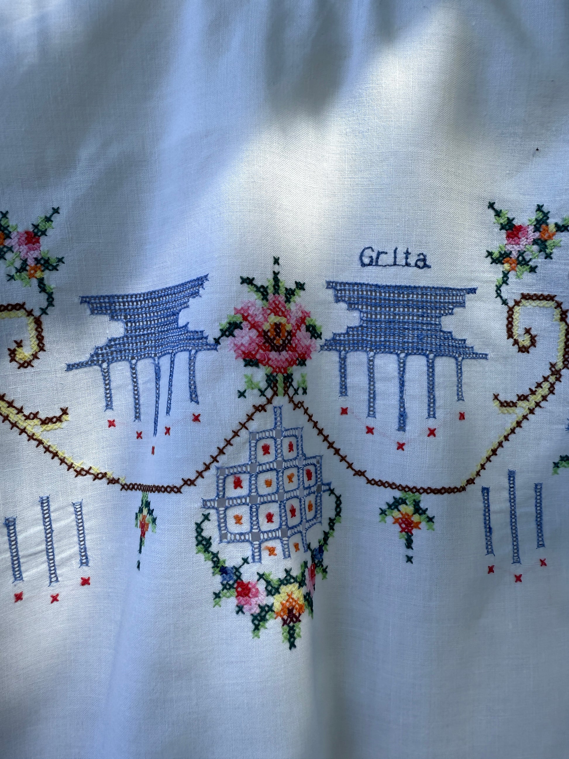 - Feita com uma toalha de chá bordada à mão muito trabalhada e bonita