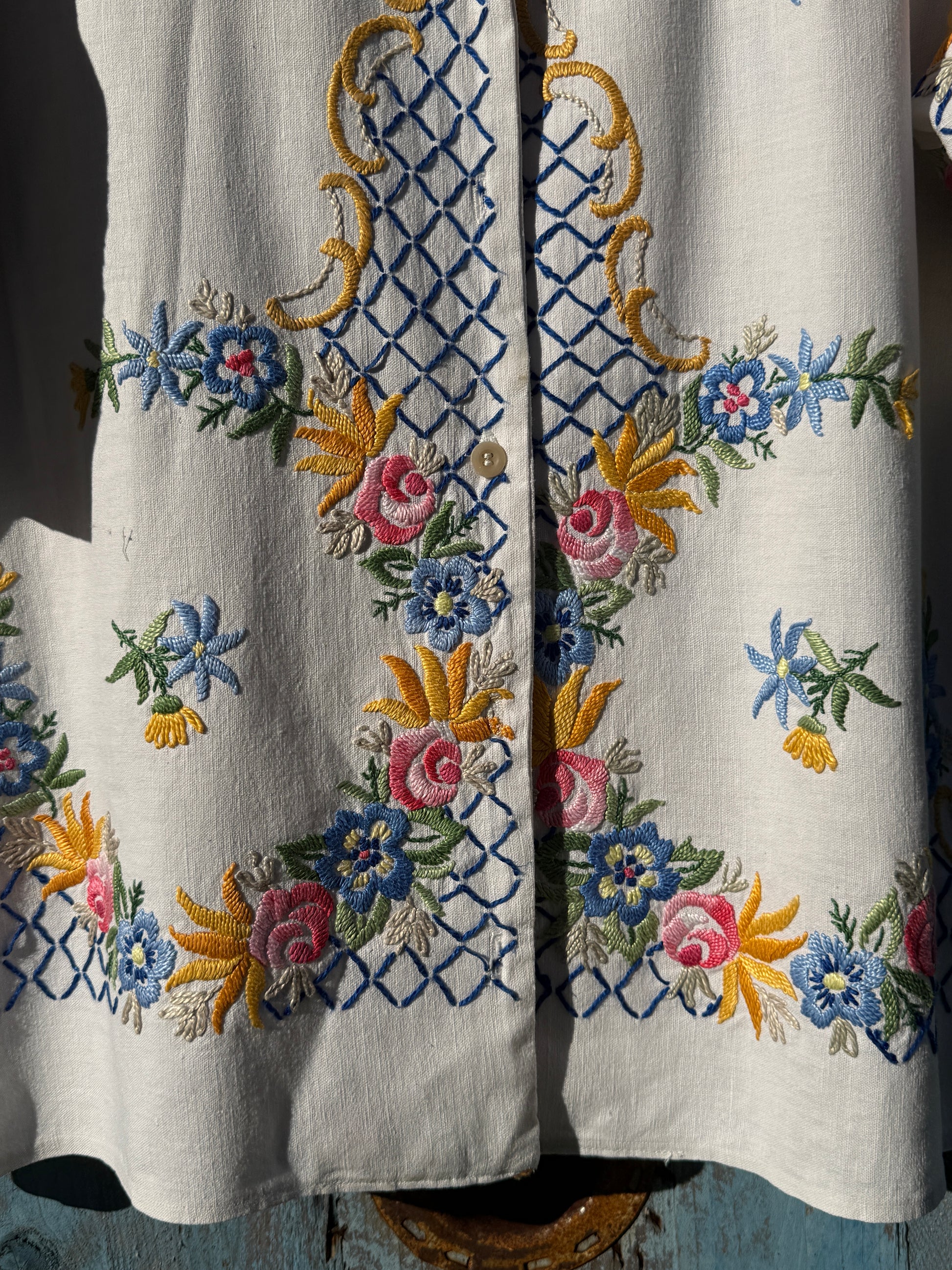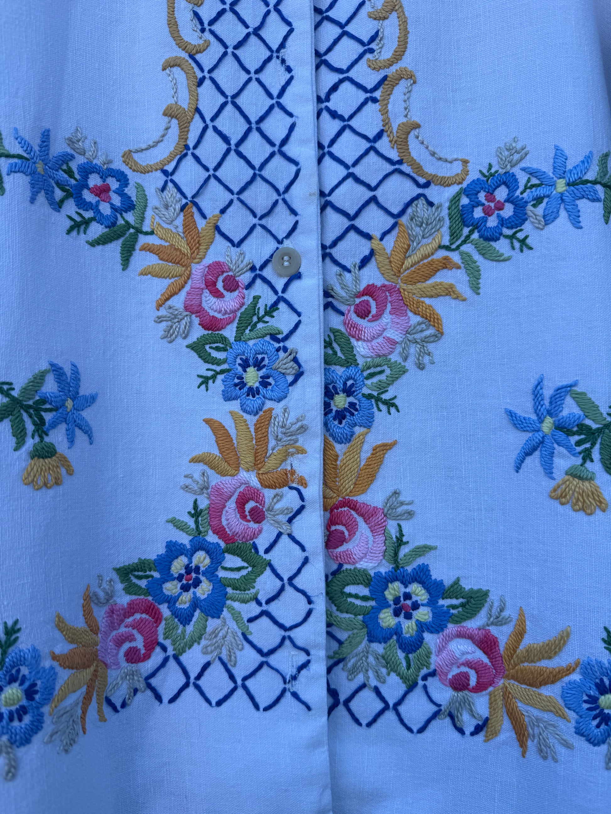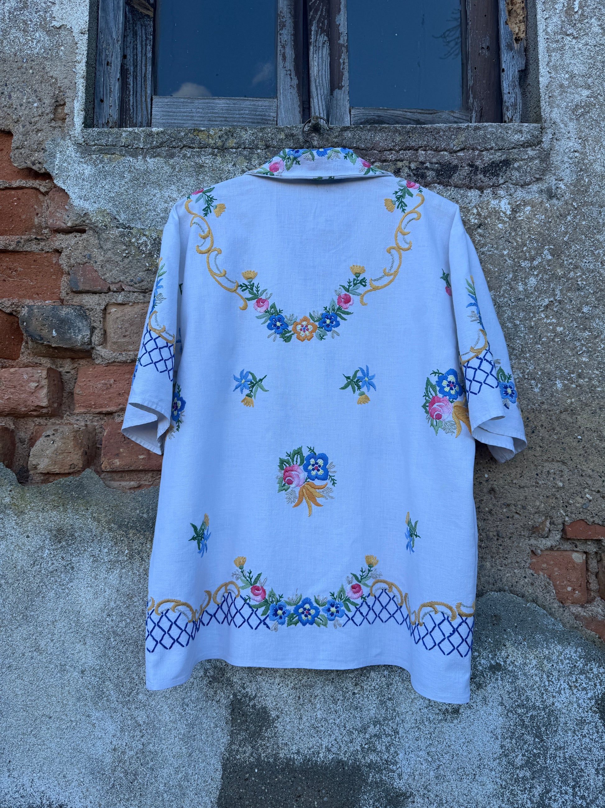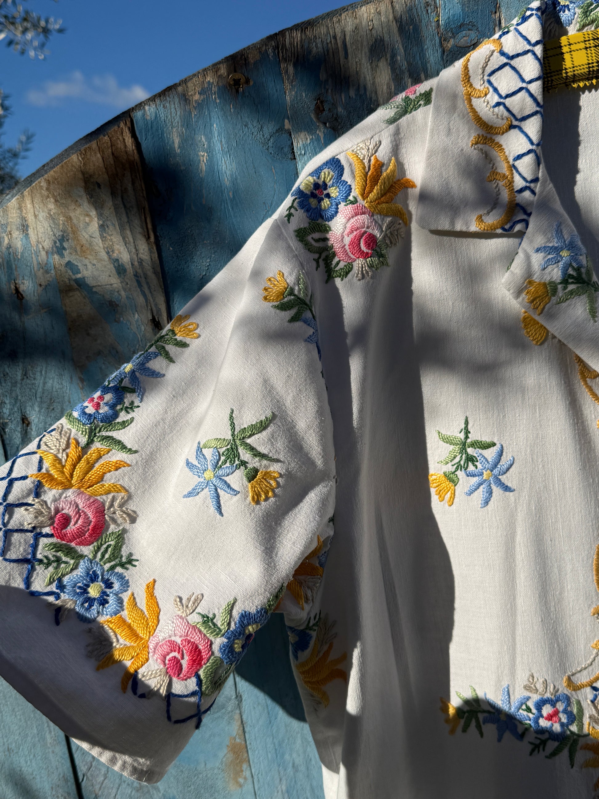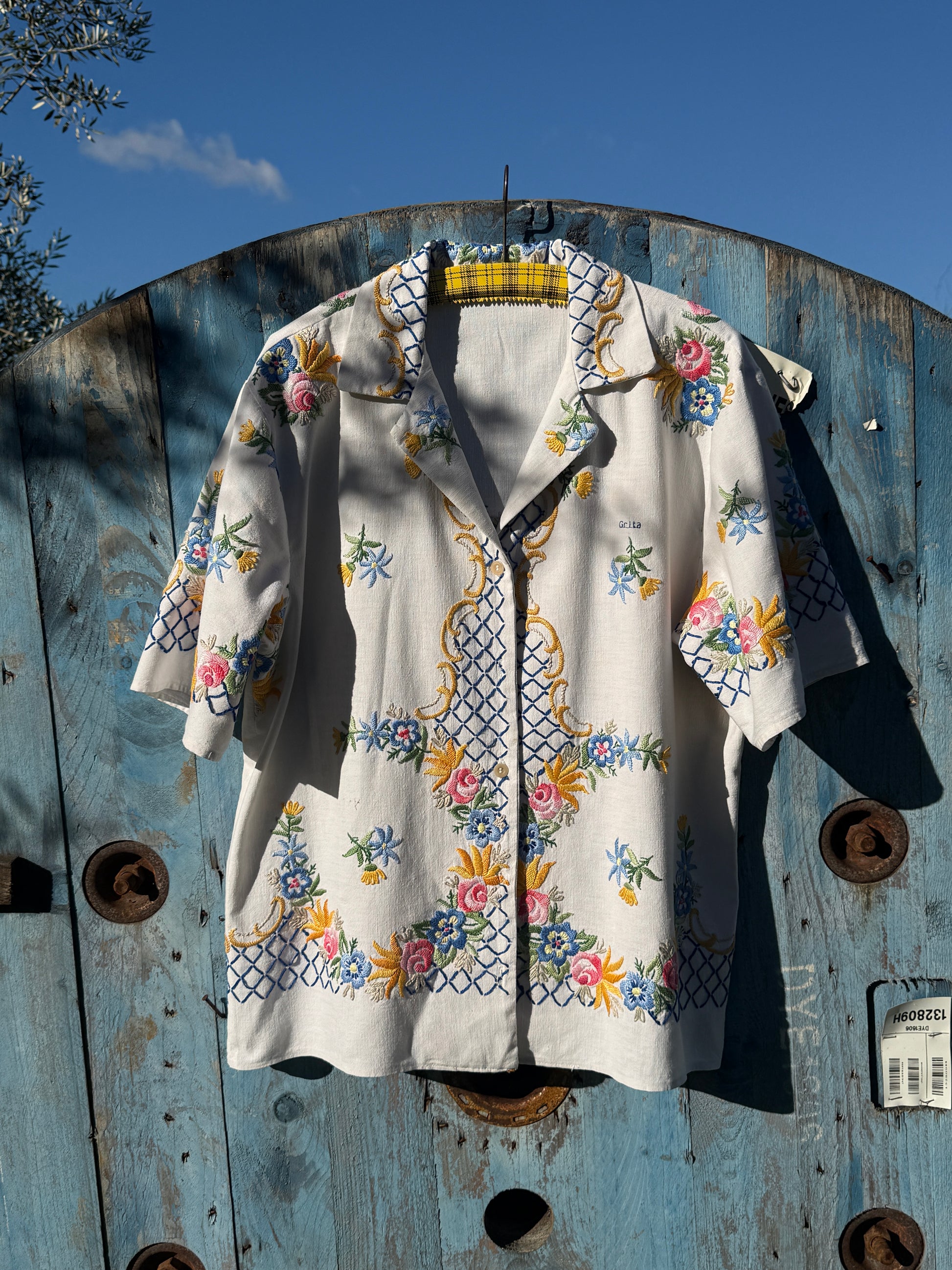 Camisa exclusiva, muito especial, feita com uma toalha de mesa em linho bordada à mão