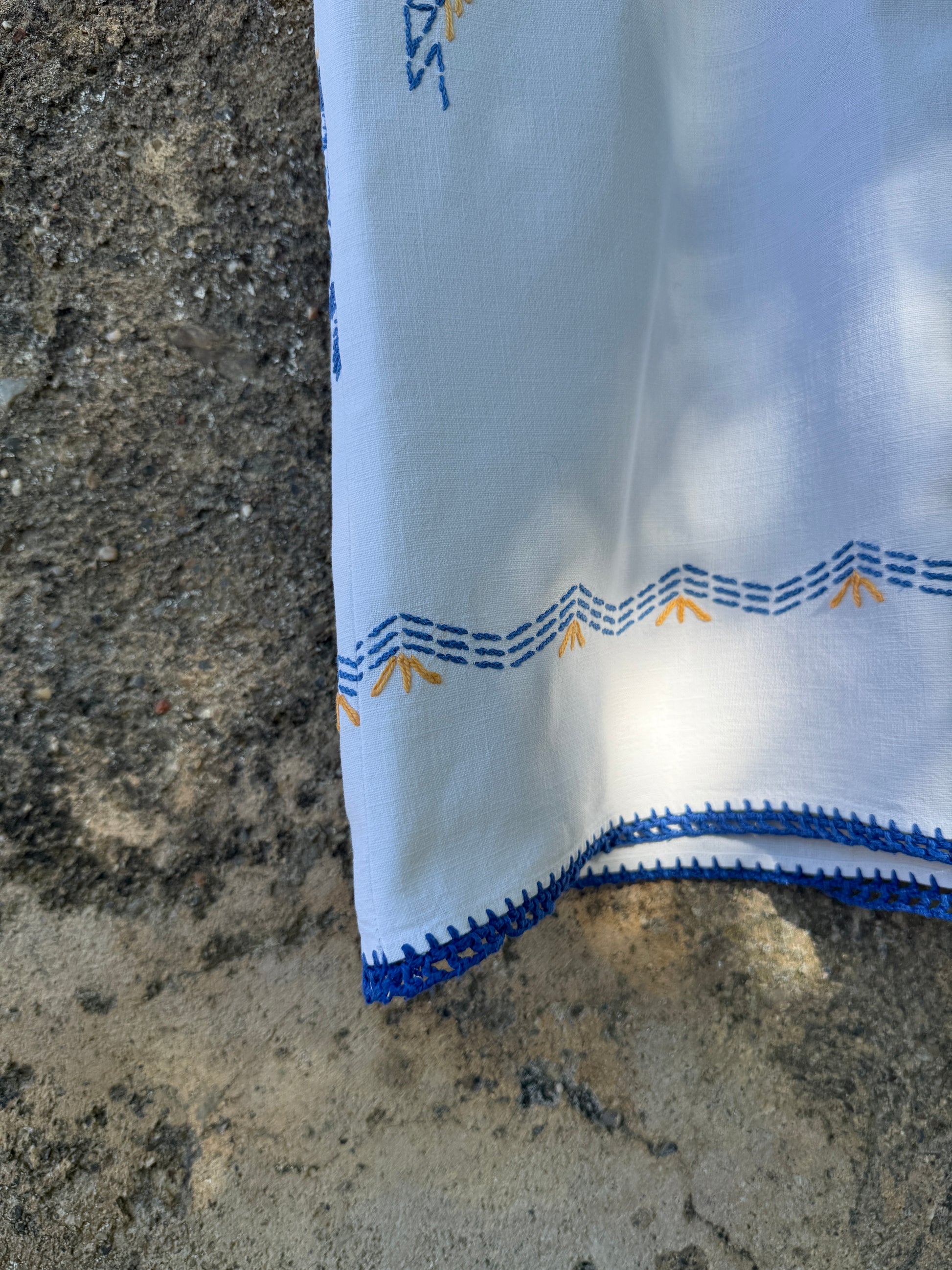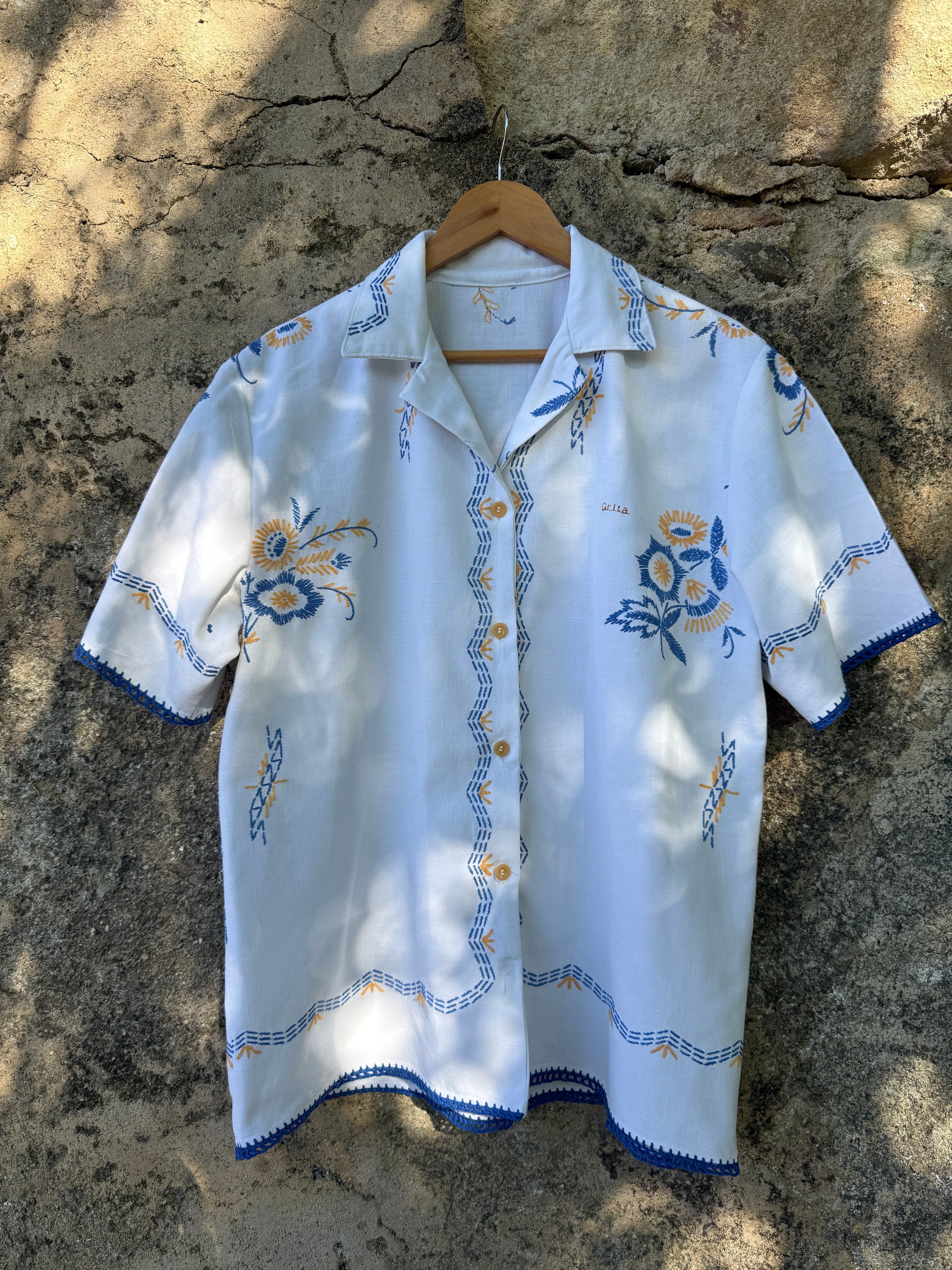 Bonita camisa, feita com uma toalha de mesa em linho e bordada à mão.