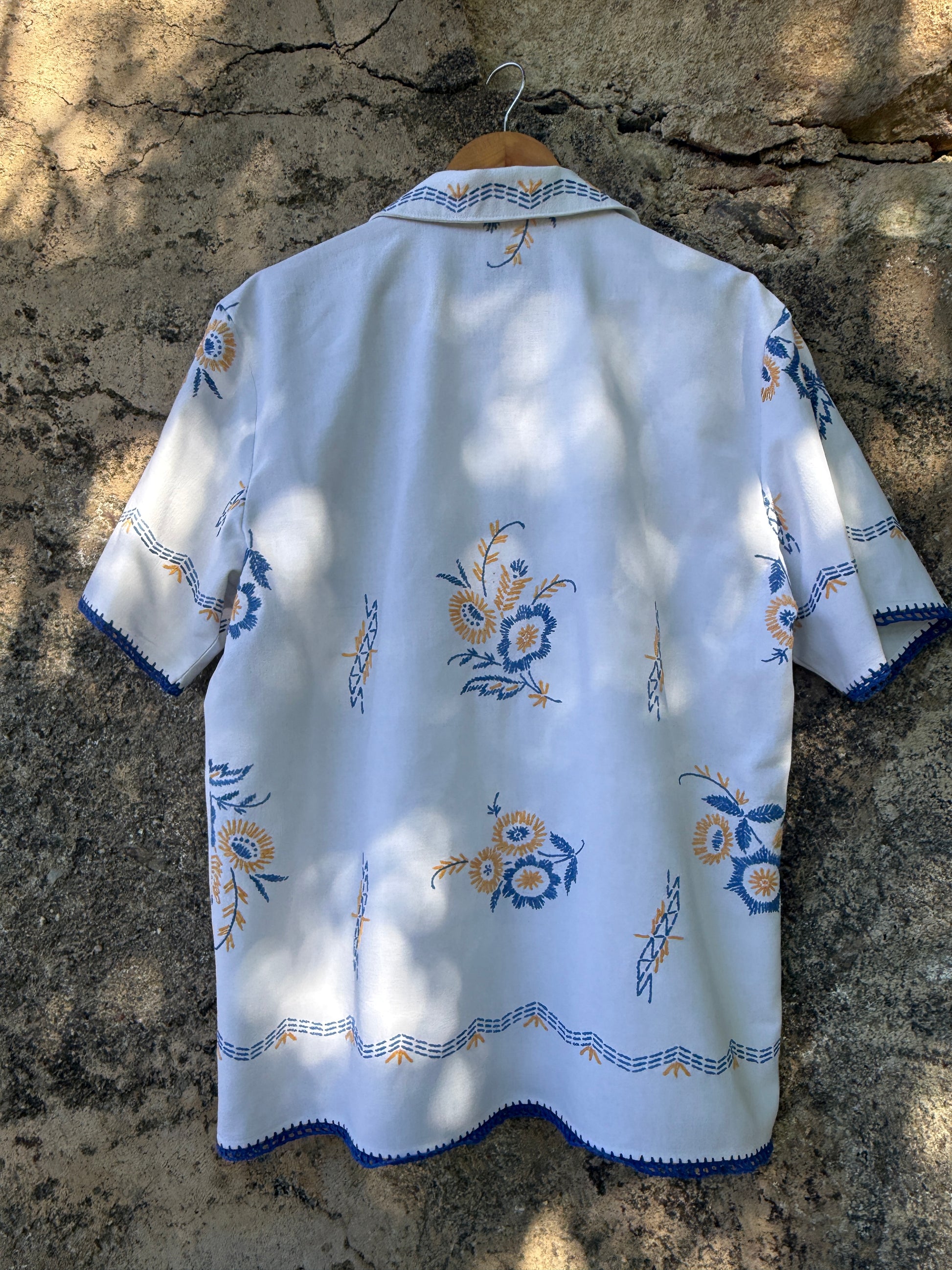 Beautiful shirt, made from a linen tablecloth and hand-embroidered.