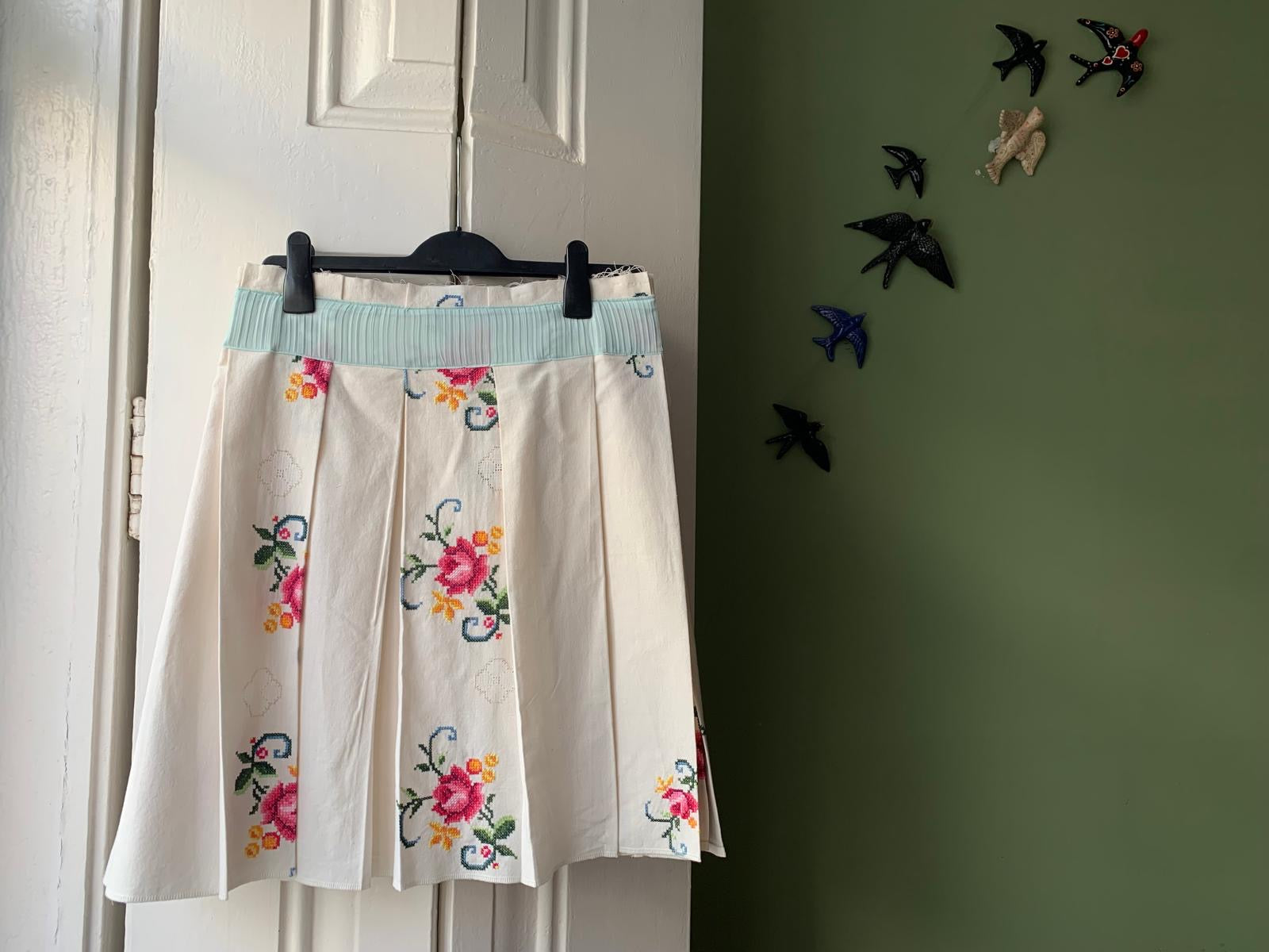 O corte de pregas adiciona movimento e fluidez, criando um efeito visual sofisticado e dinâmico, perfeito para qualquer ocasião. O toque vintage dos bordados contrasta harmoniosamente com a silhueta estruturada da saia, tornando-a uma peça única, intemporal e impossível de replicar.
