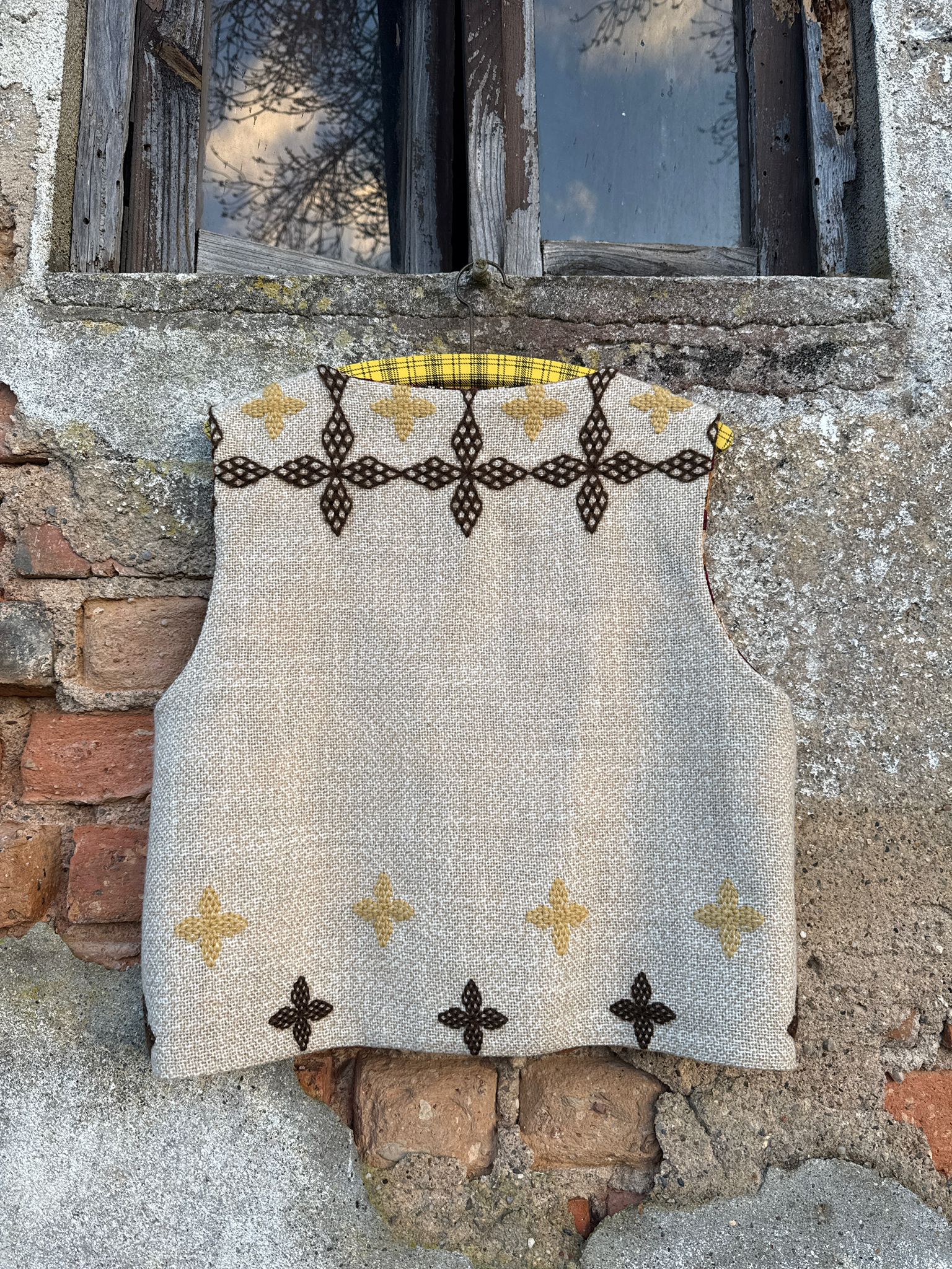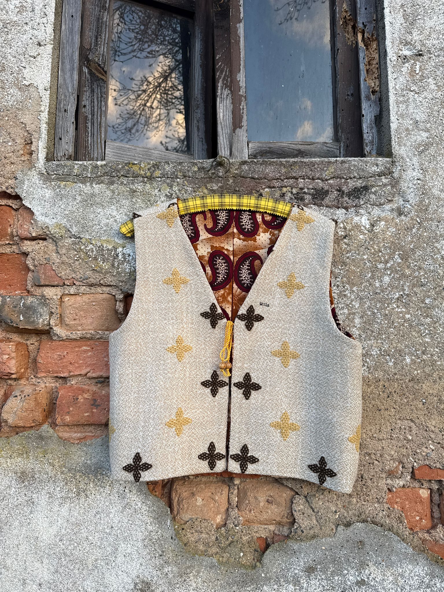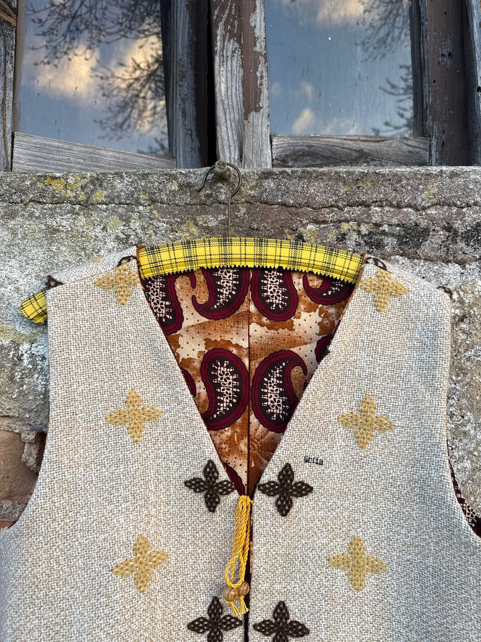 Colete reversível feito com uma manta em lã bordada à mão e um tecido descartado