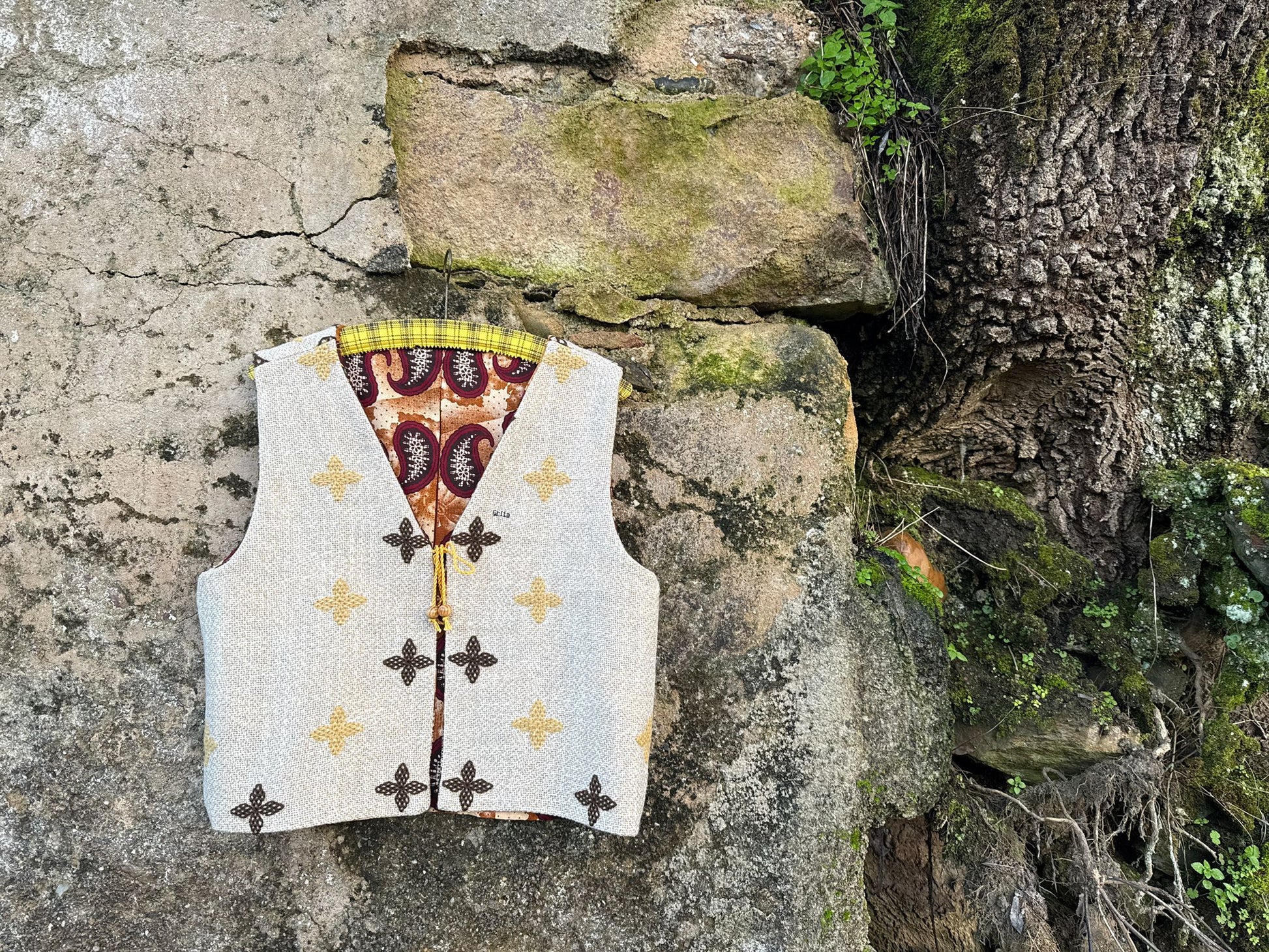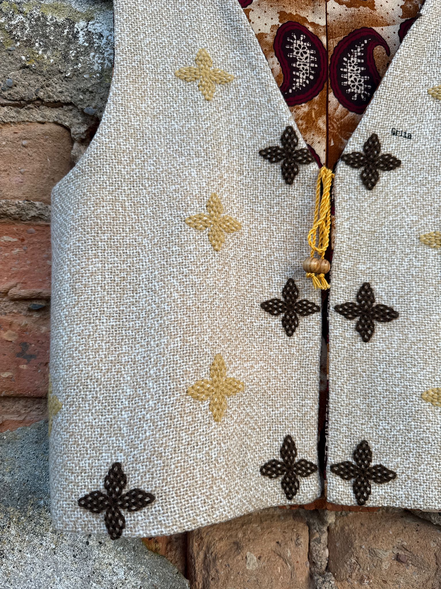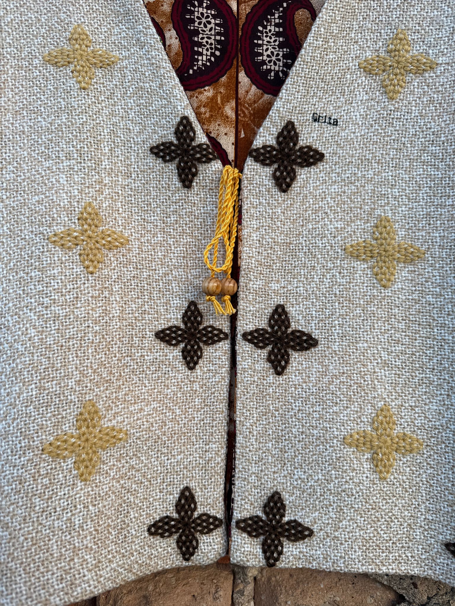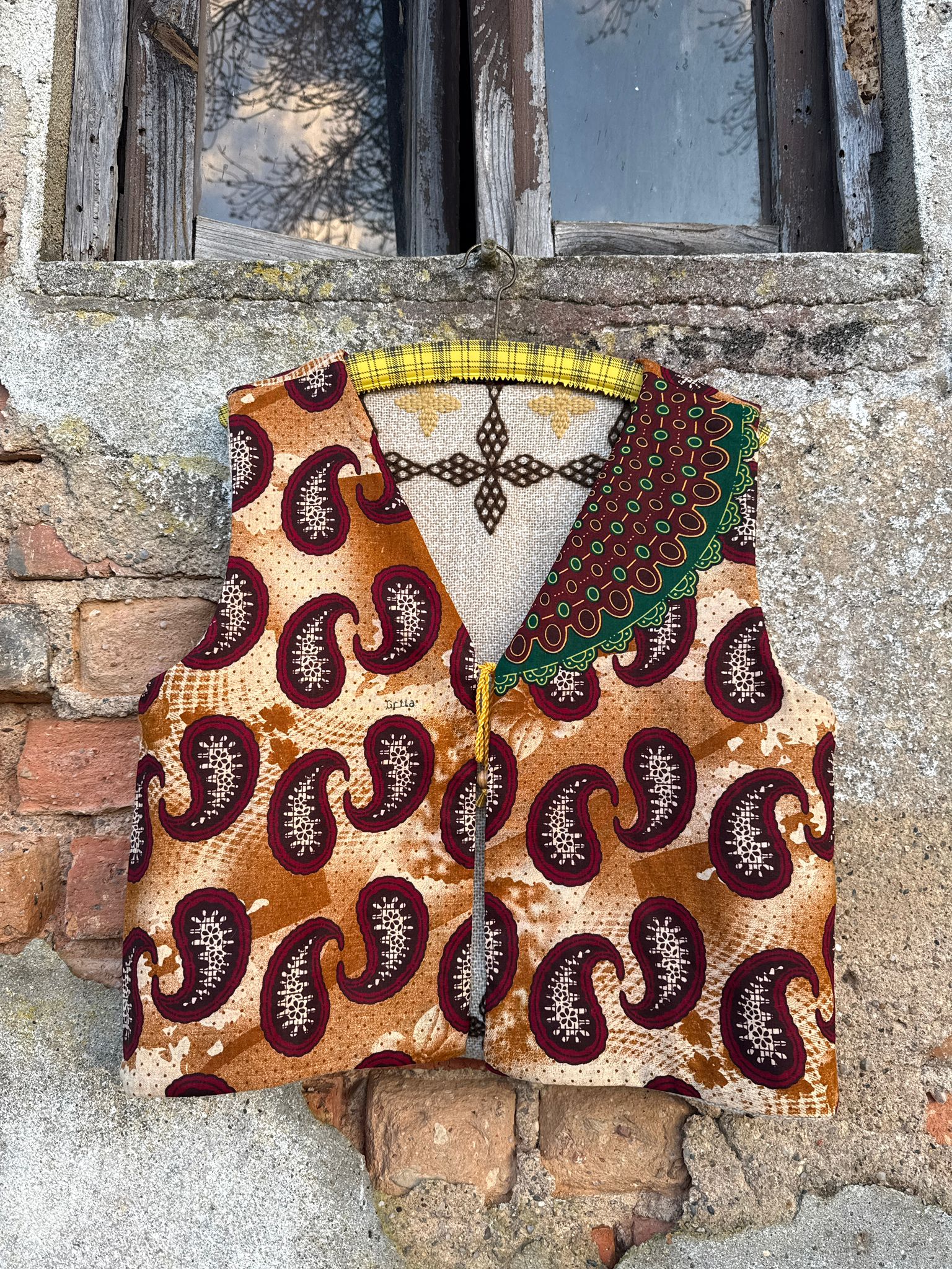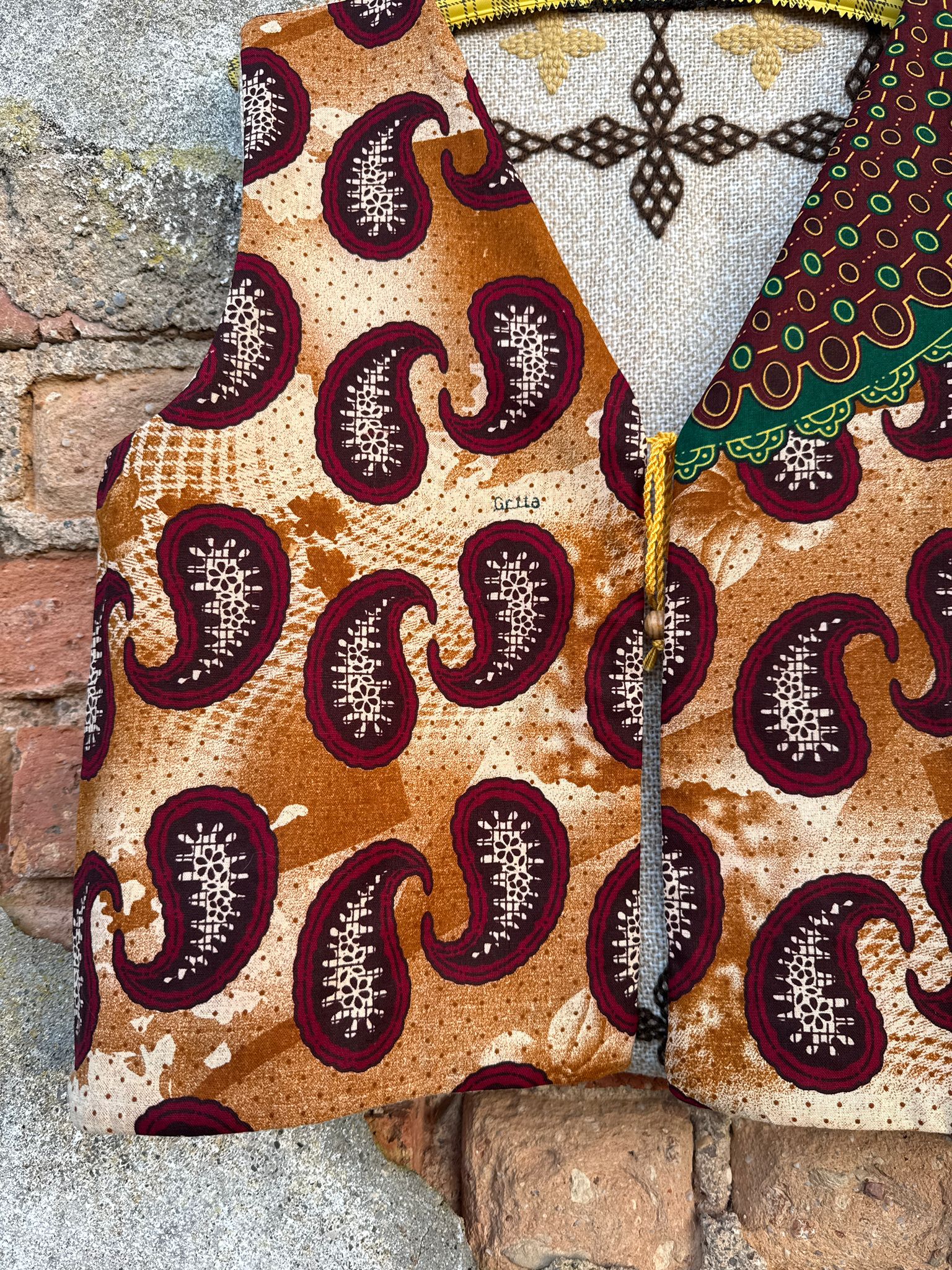 Reversible vest made with a hand-embroidered wool blanket and discarded fabric