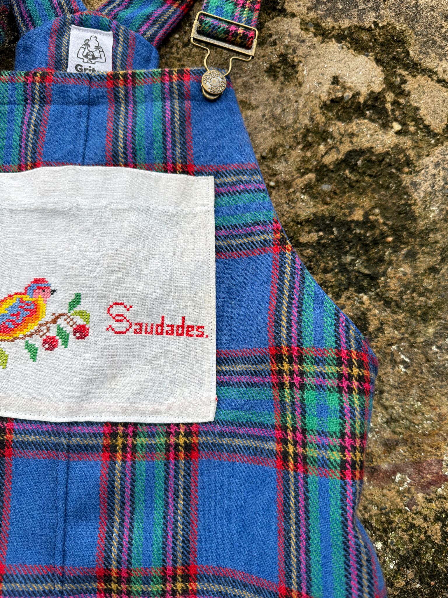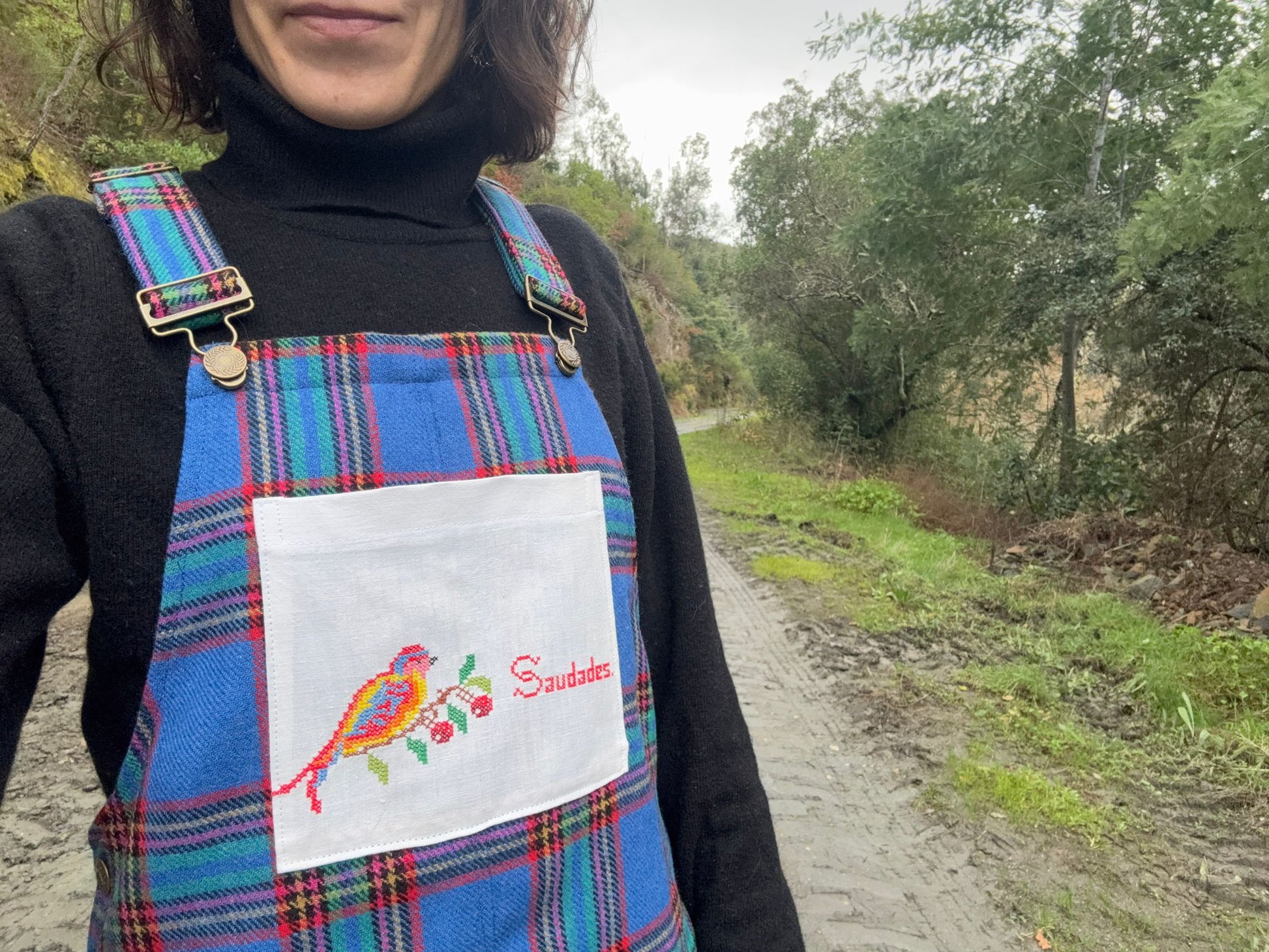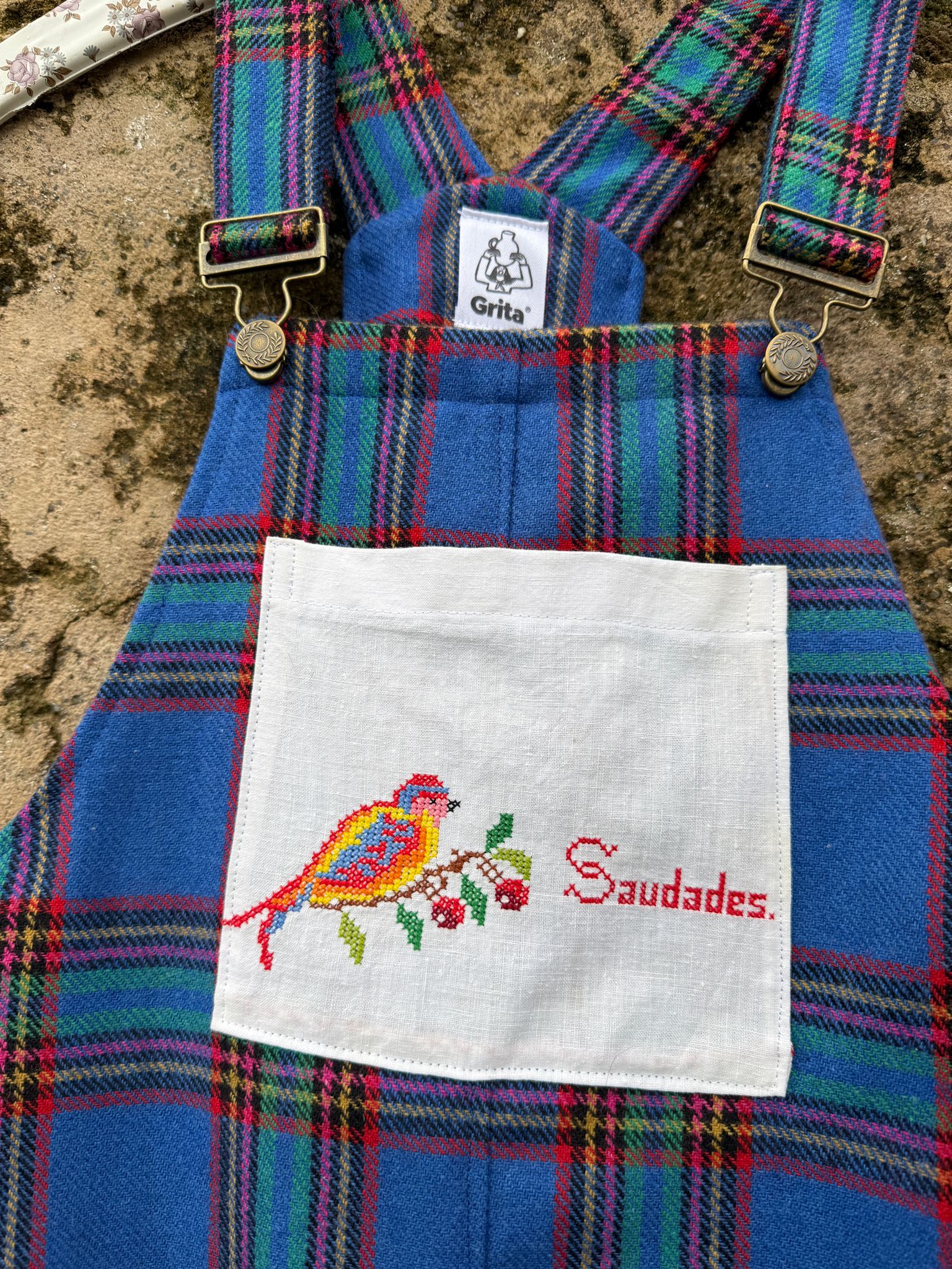 Jardineiras muito giras e quentinhas feitas com um tecido em lã (90%) e um bolso "Grita" feito com um envelope de guardanapo