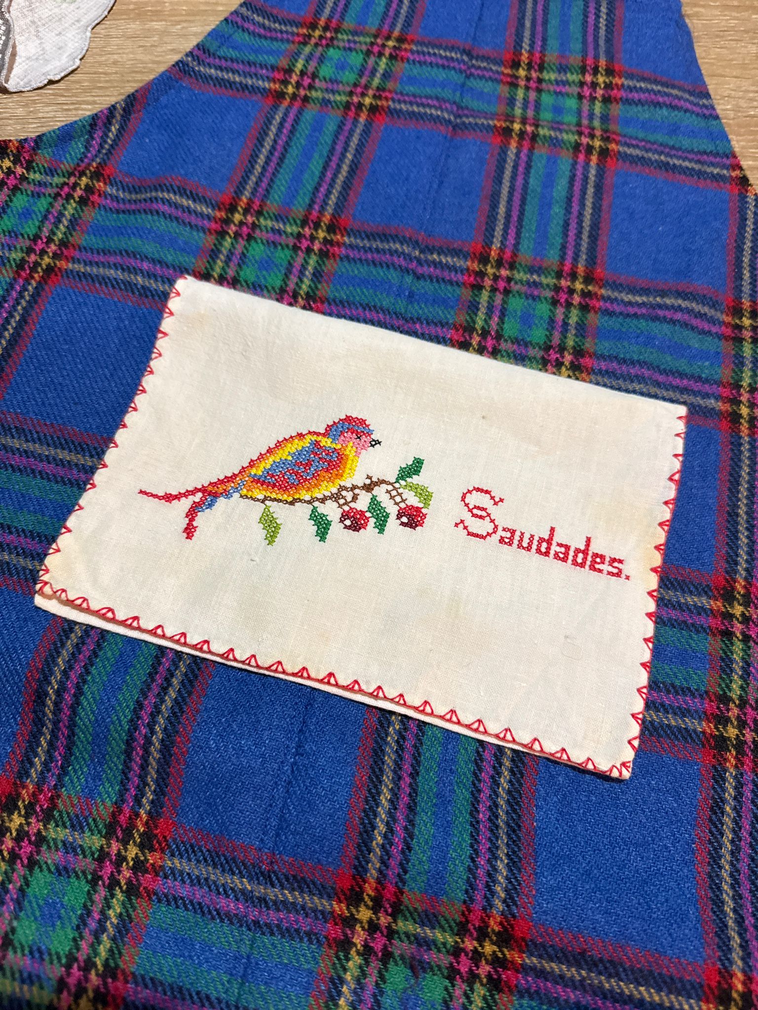 - Made with a hand-embroidered linen tablecloth