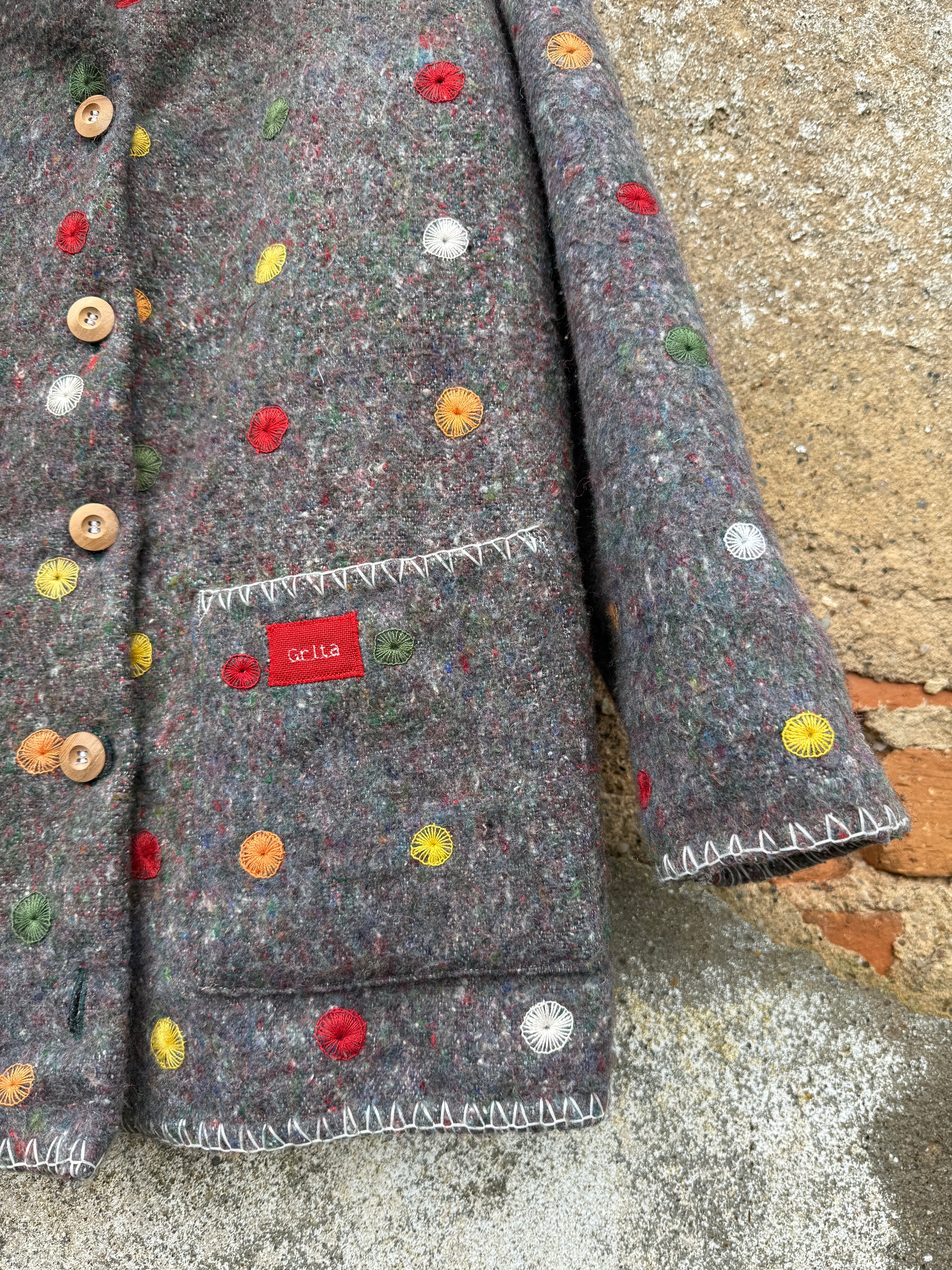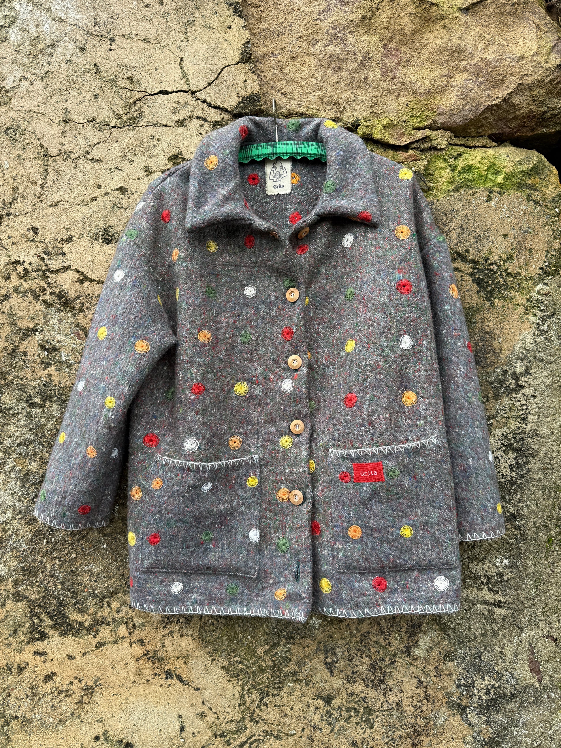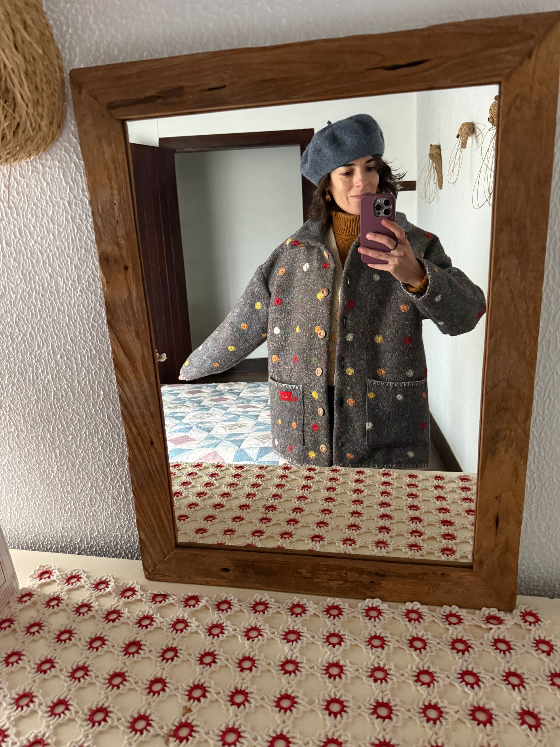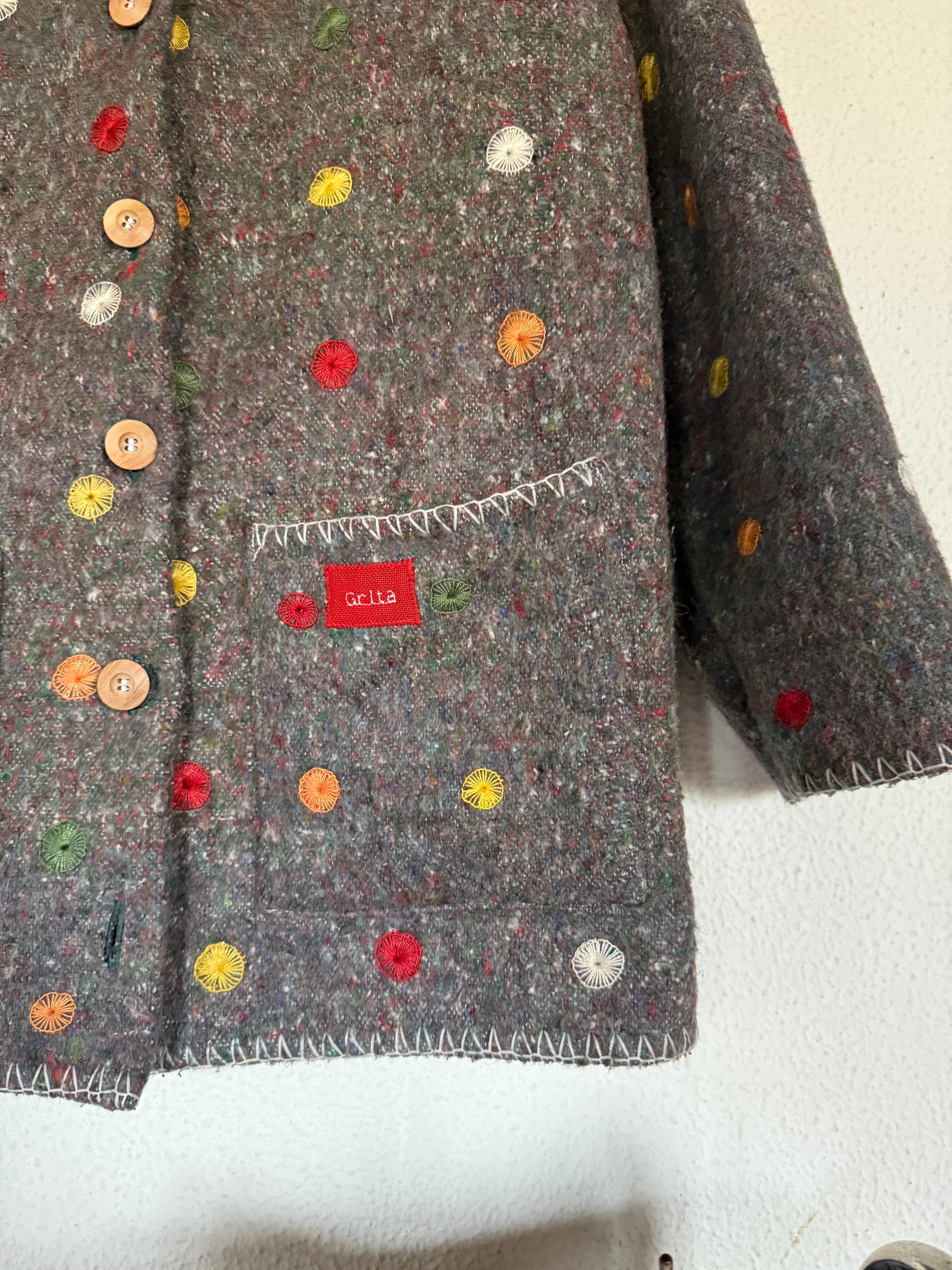 - O tecido tem umas pequenas esferas coloridas bordadas à mão