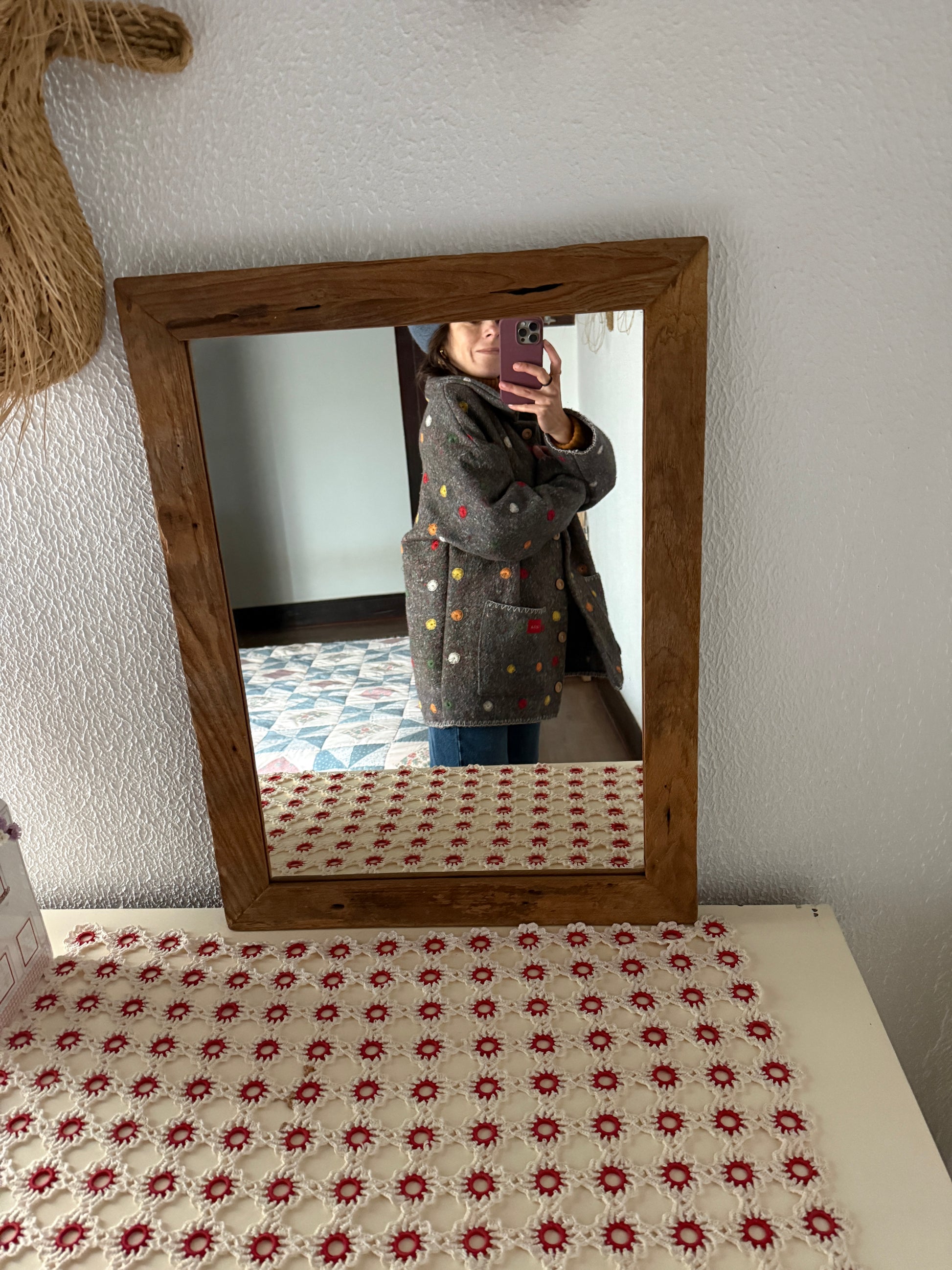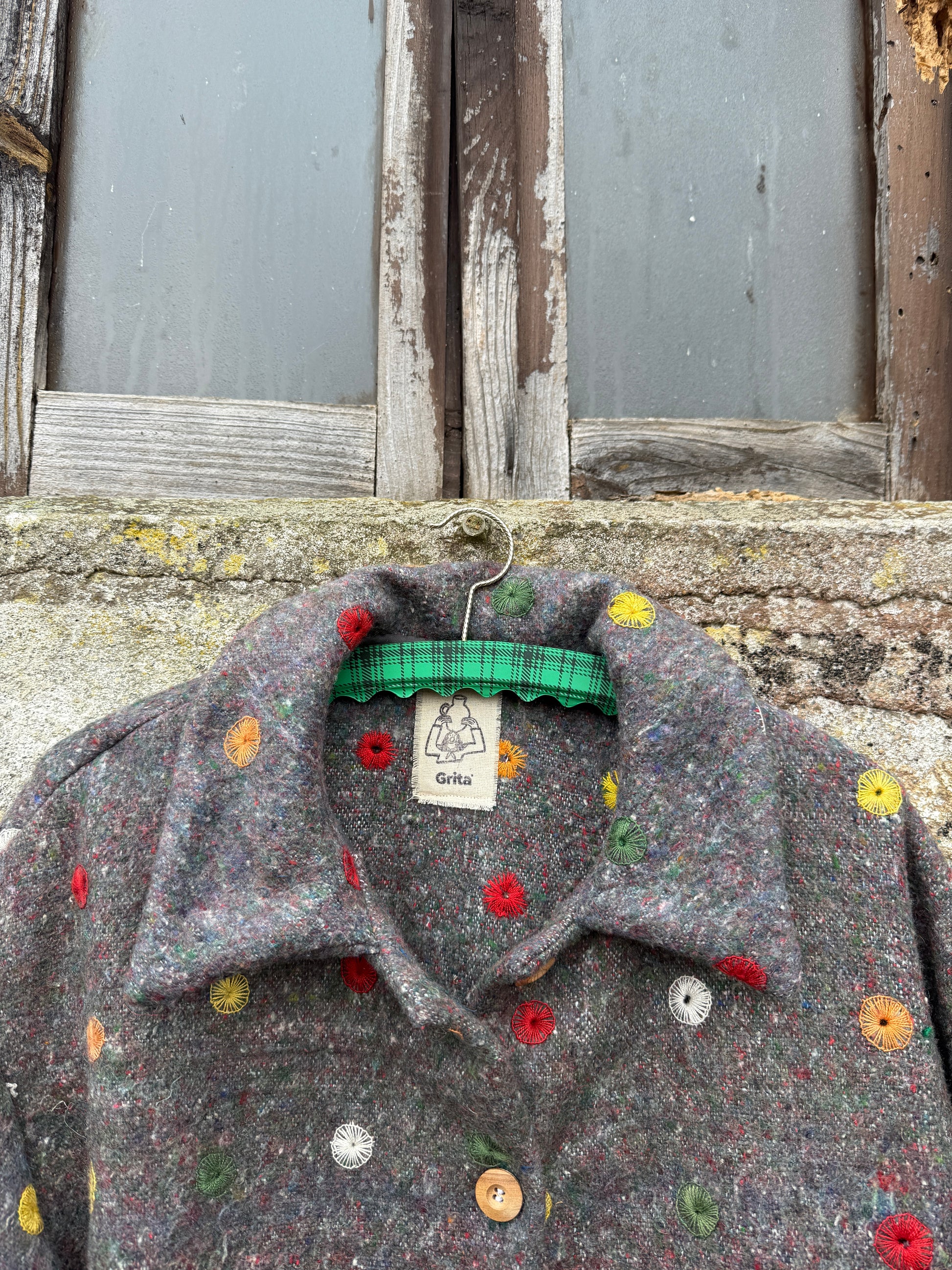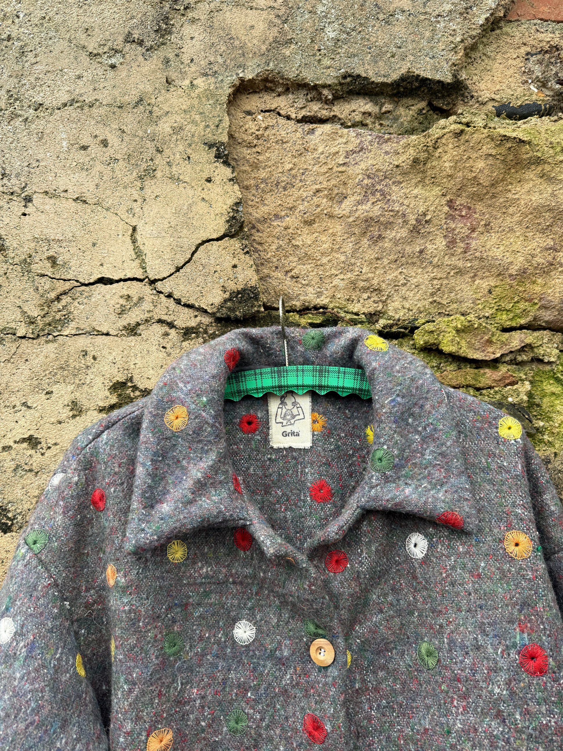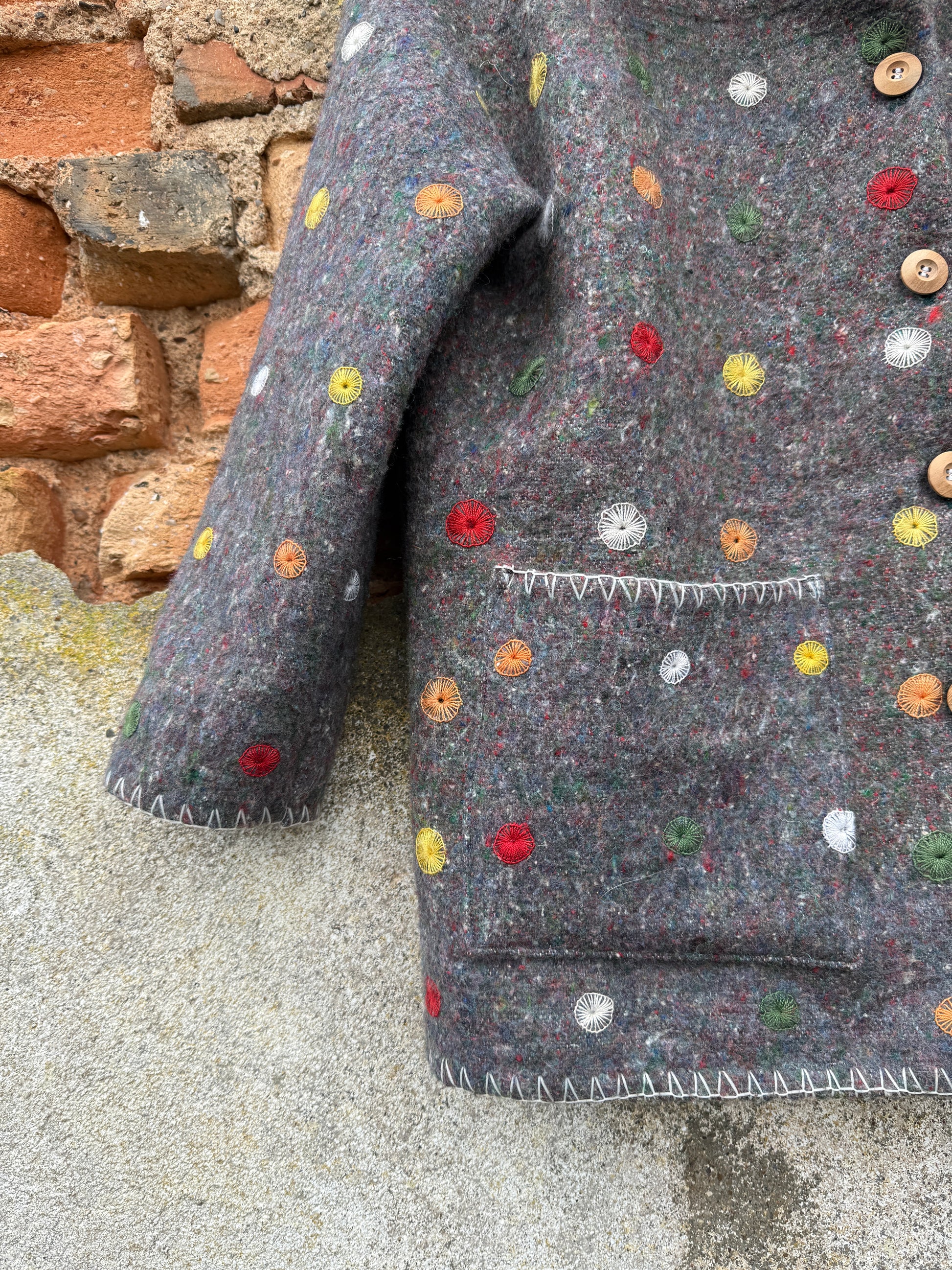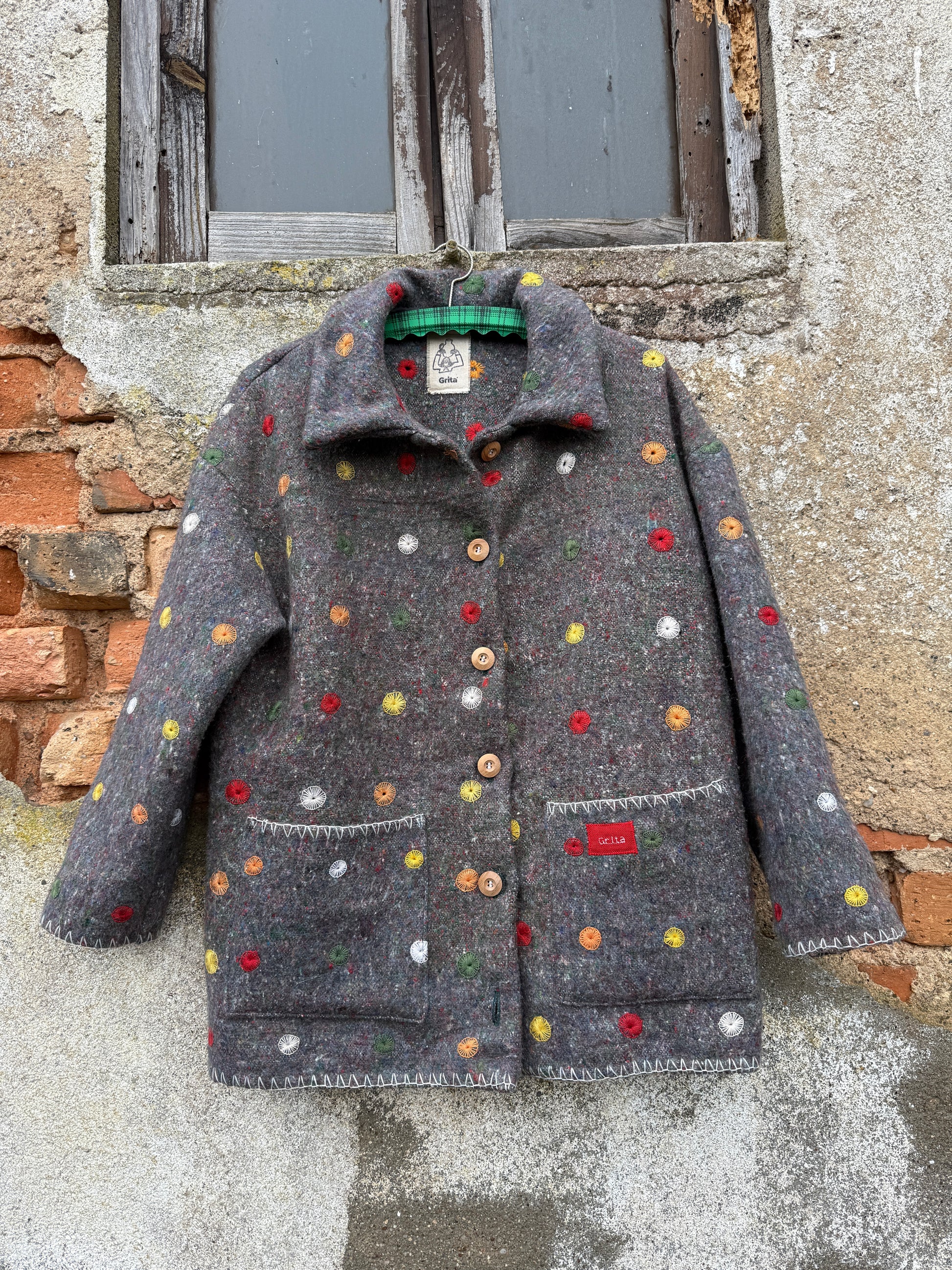 - O tecido tem umas pequenas esferas coloridas bordadas à mão