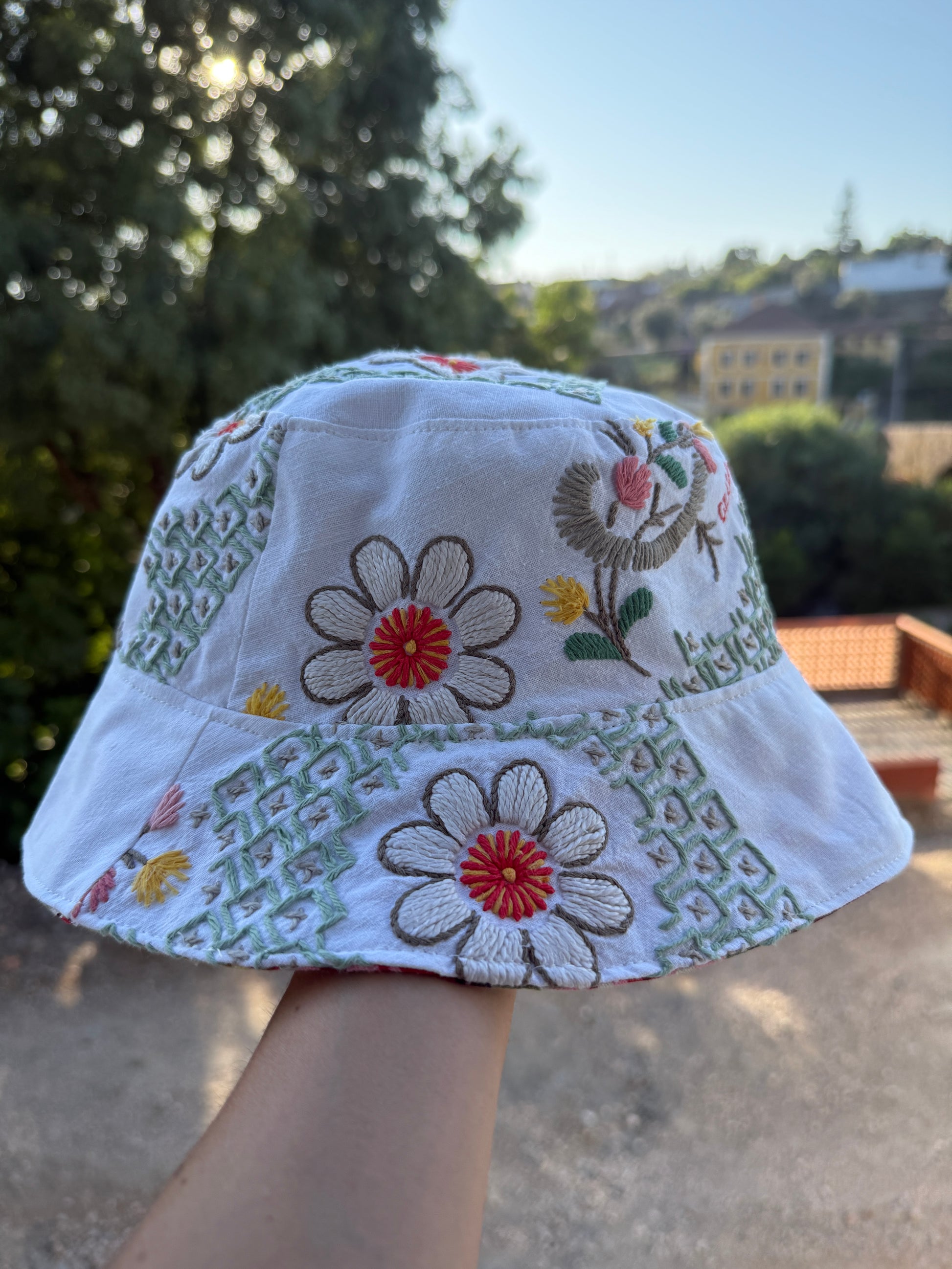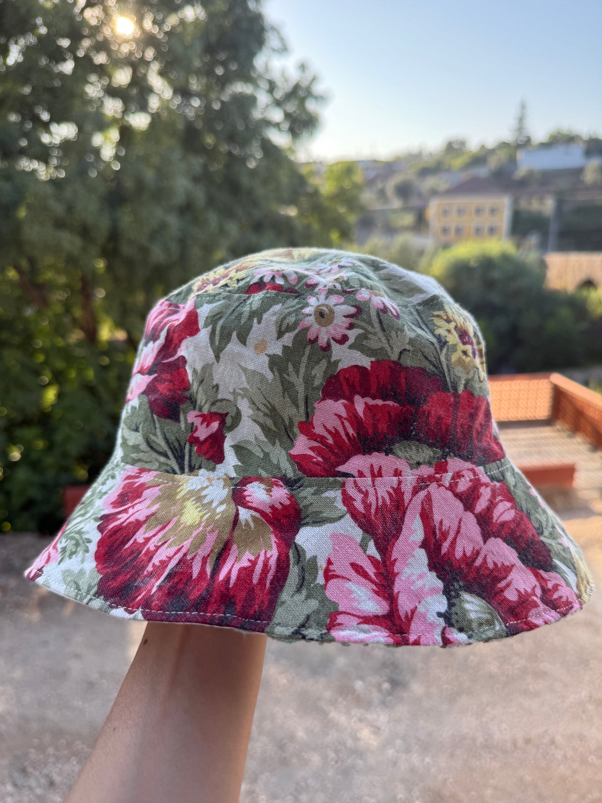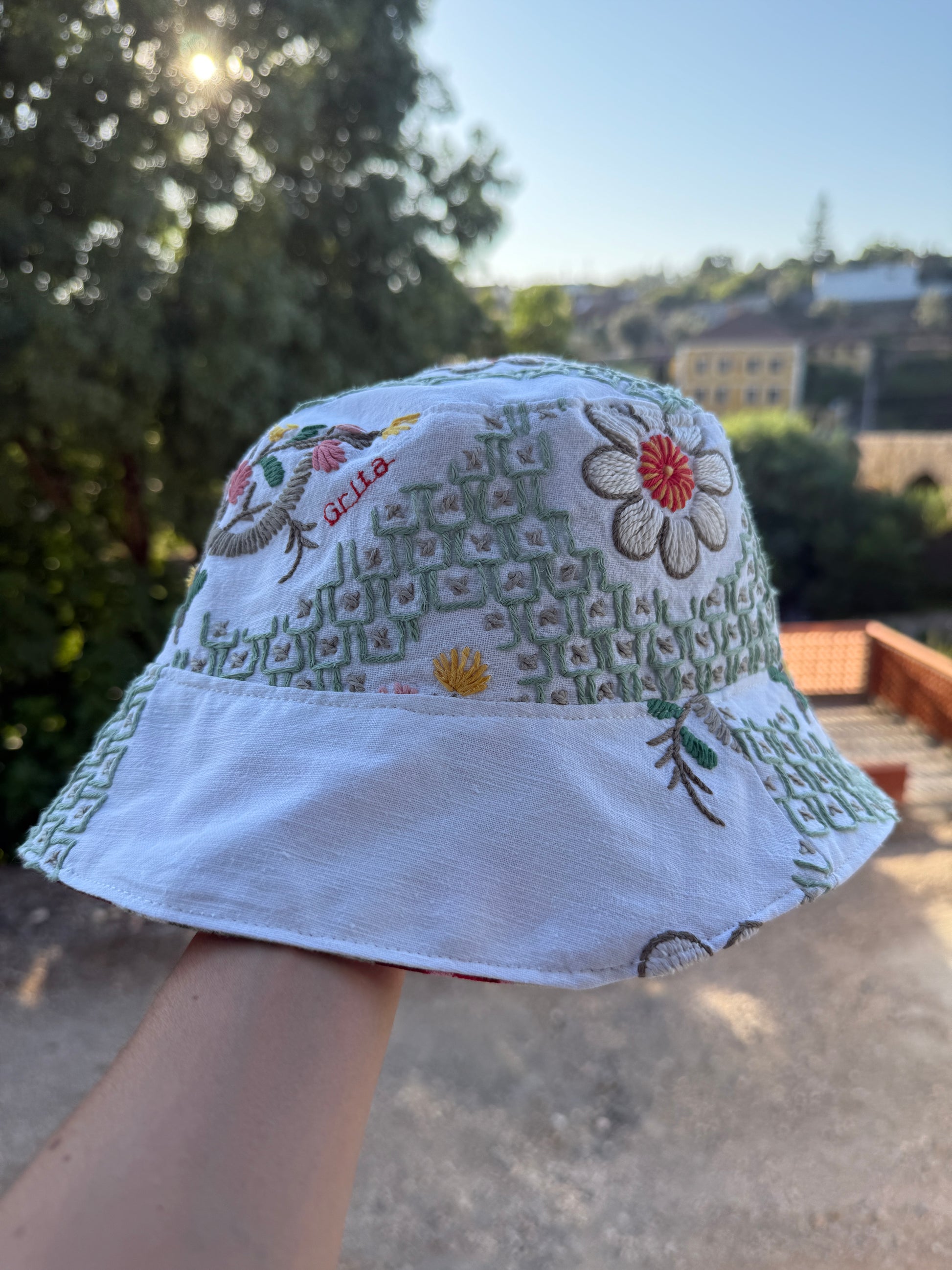 - Feito com uma toalha de mesa em linho e bordada à mão e um tecido antigo florido que normalmente se usava na decoração das casas