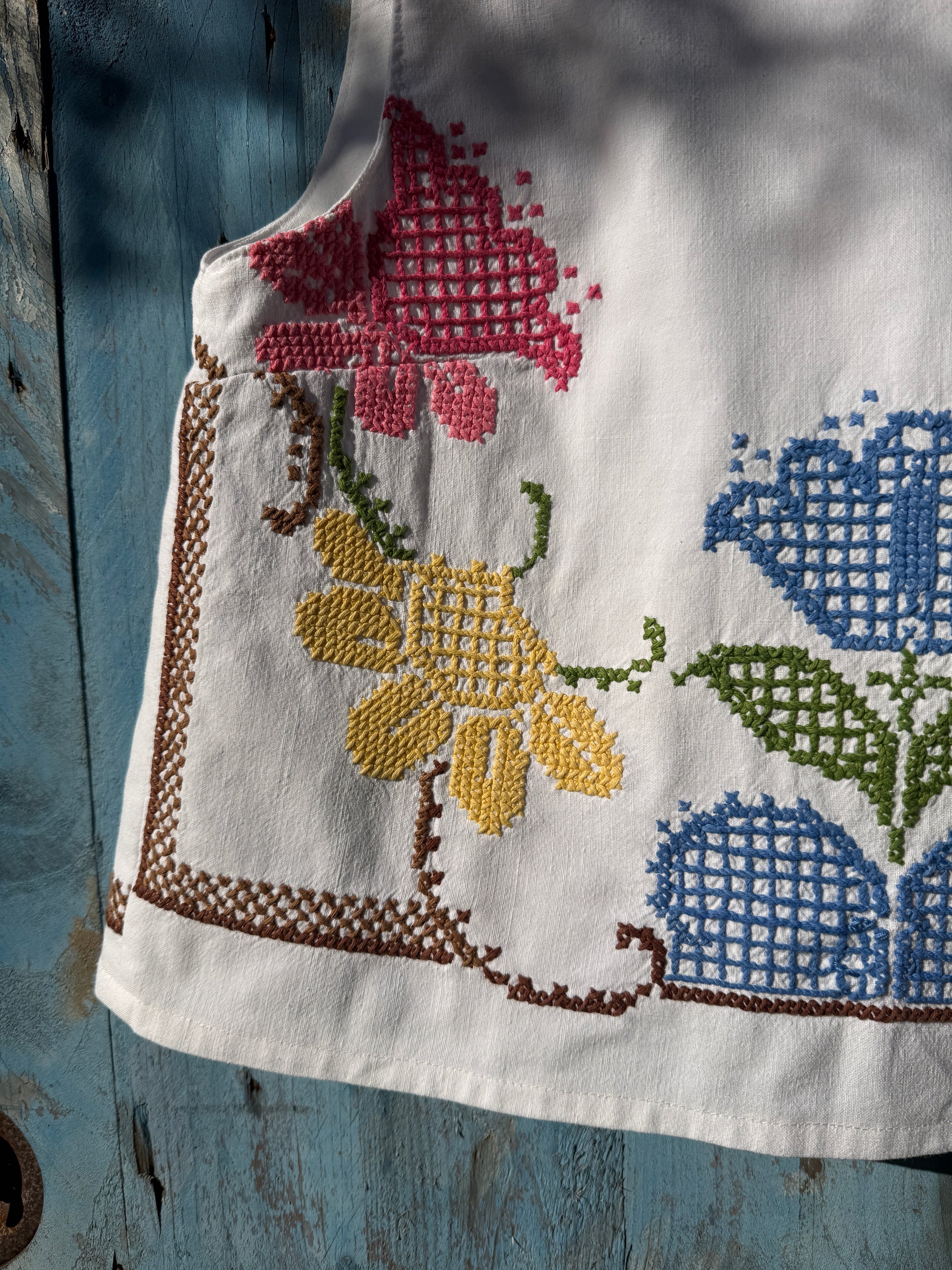 - Made from a hand-embroidered linen curtain, used in its entirety.