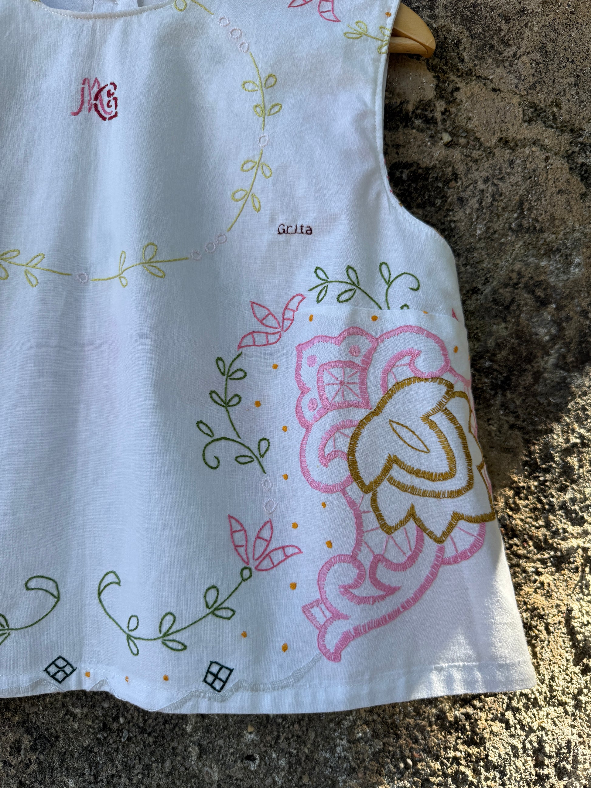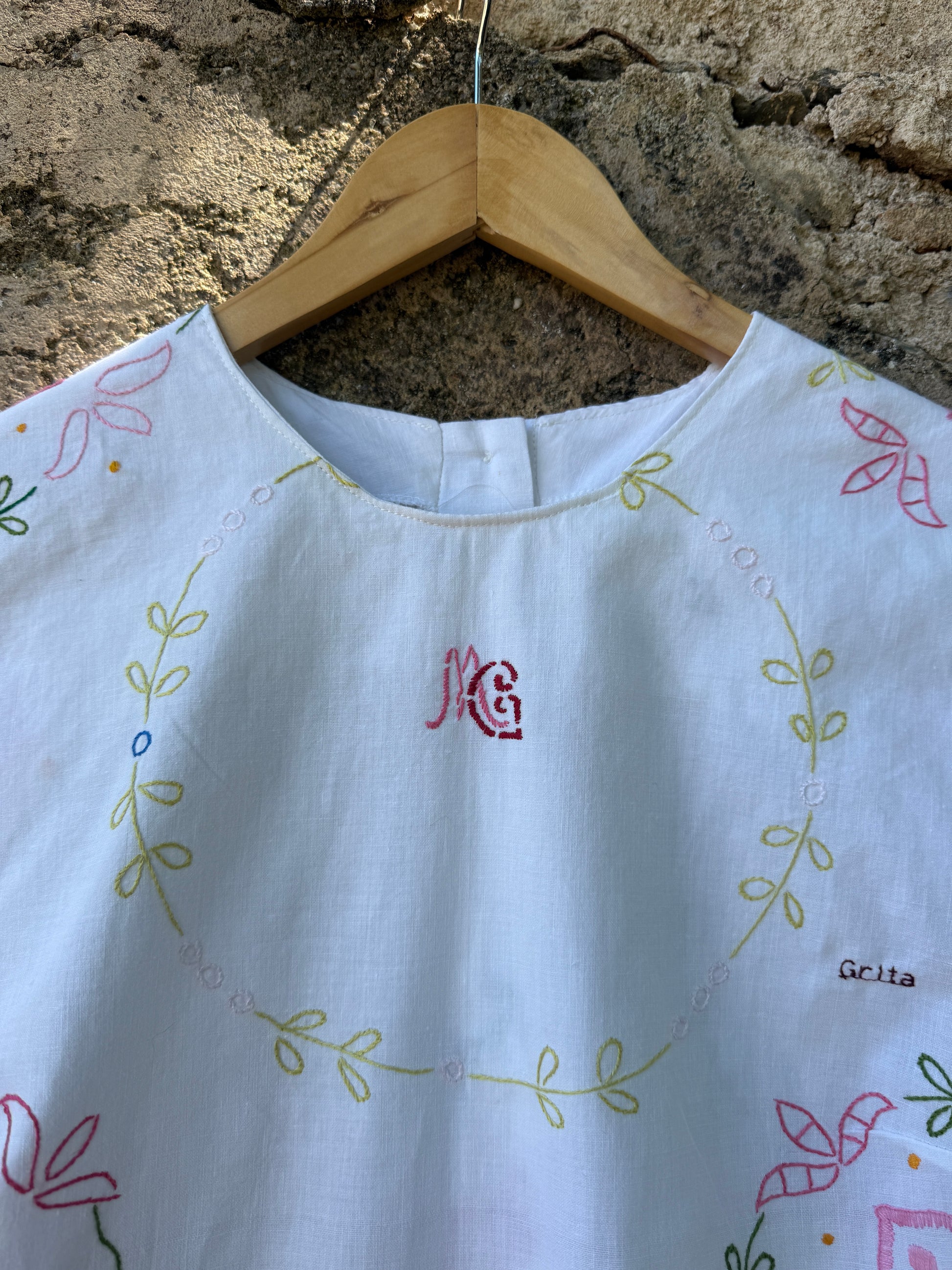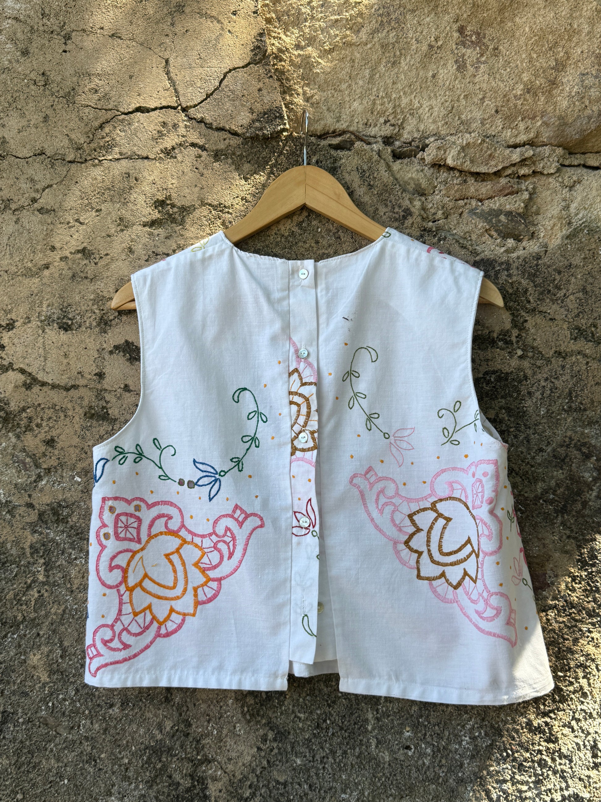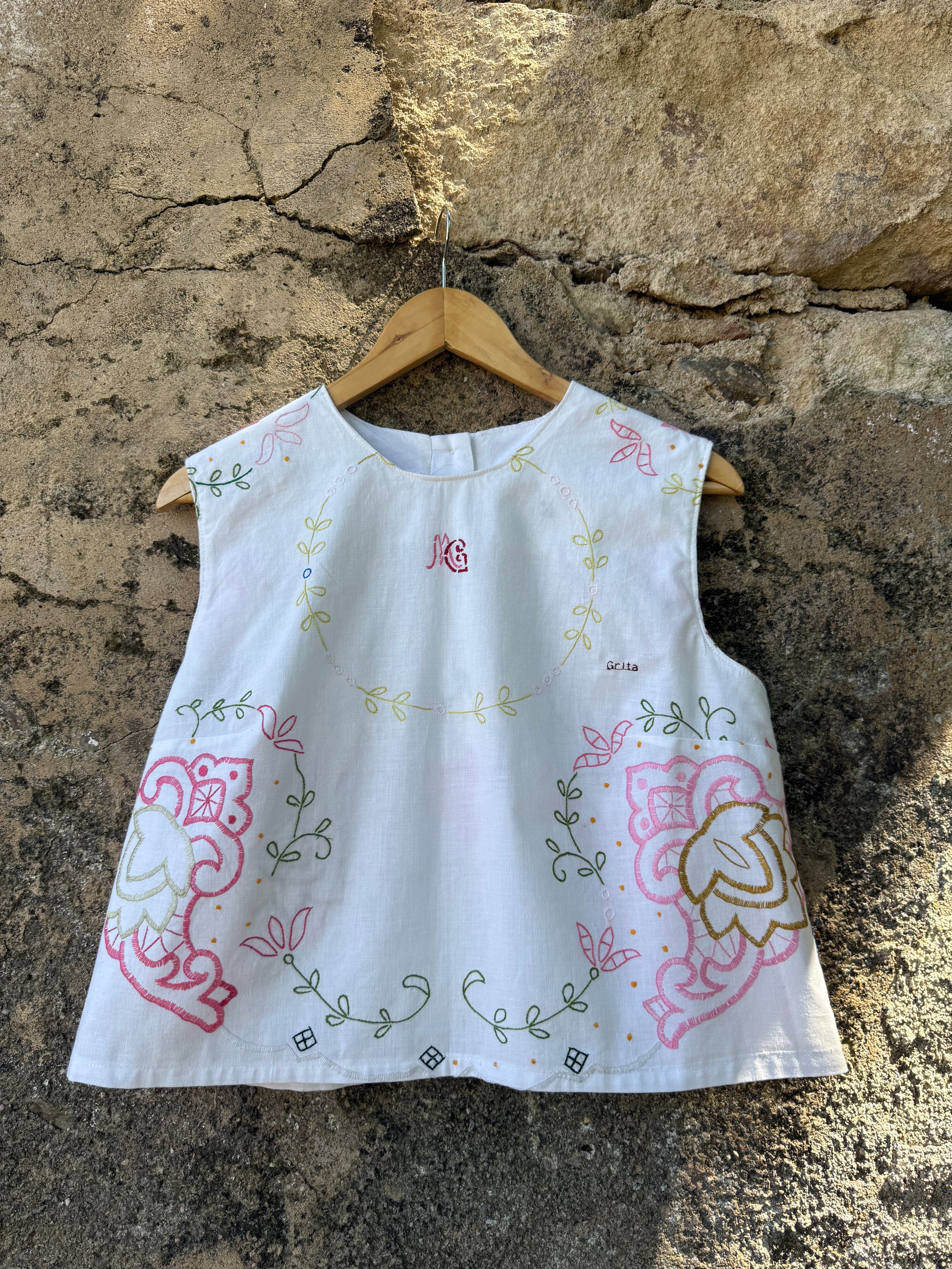 Top muito bonito feito com uma toalha de mesa antiga bordada à mão