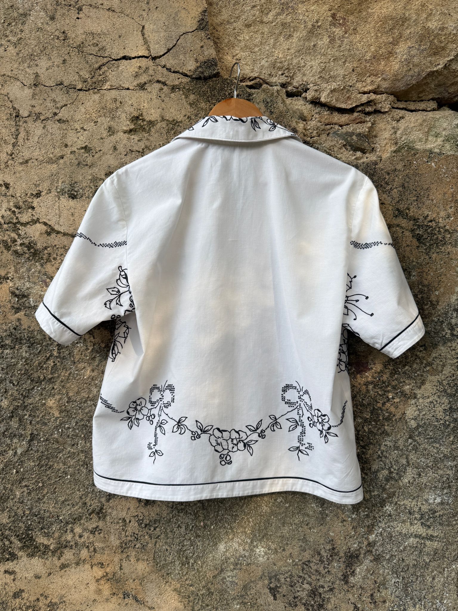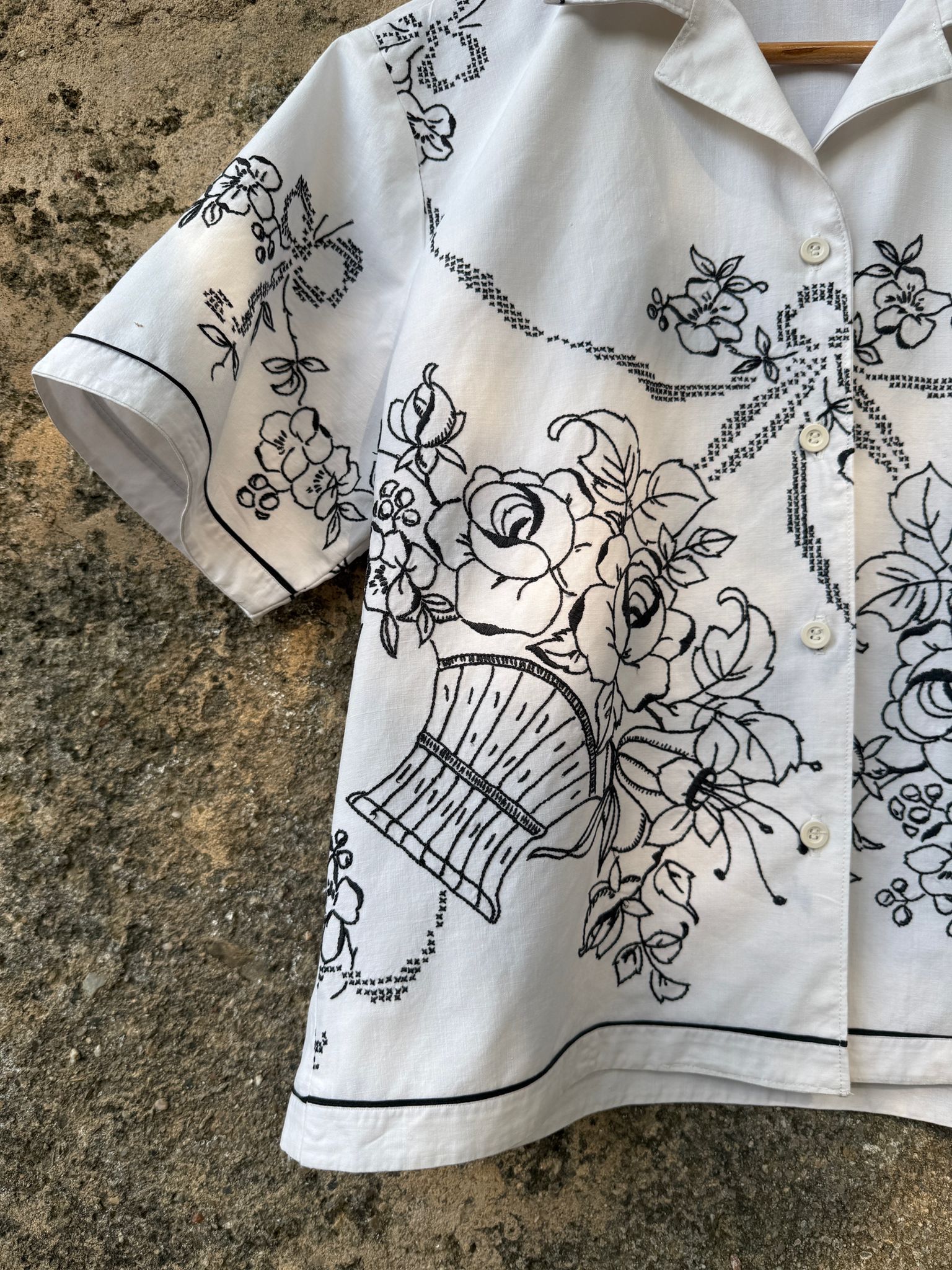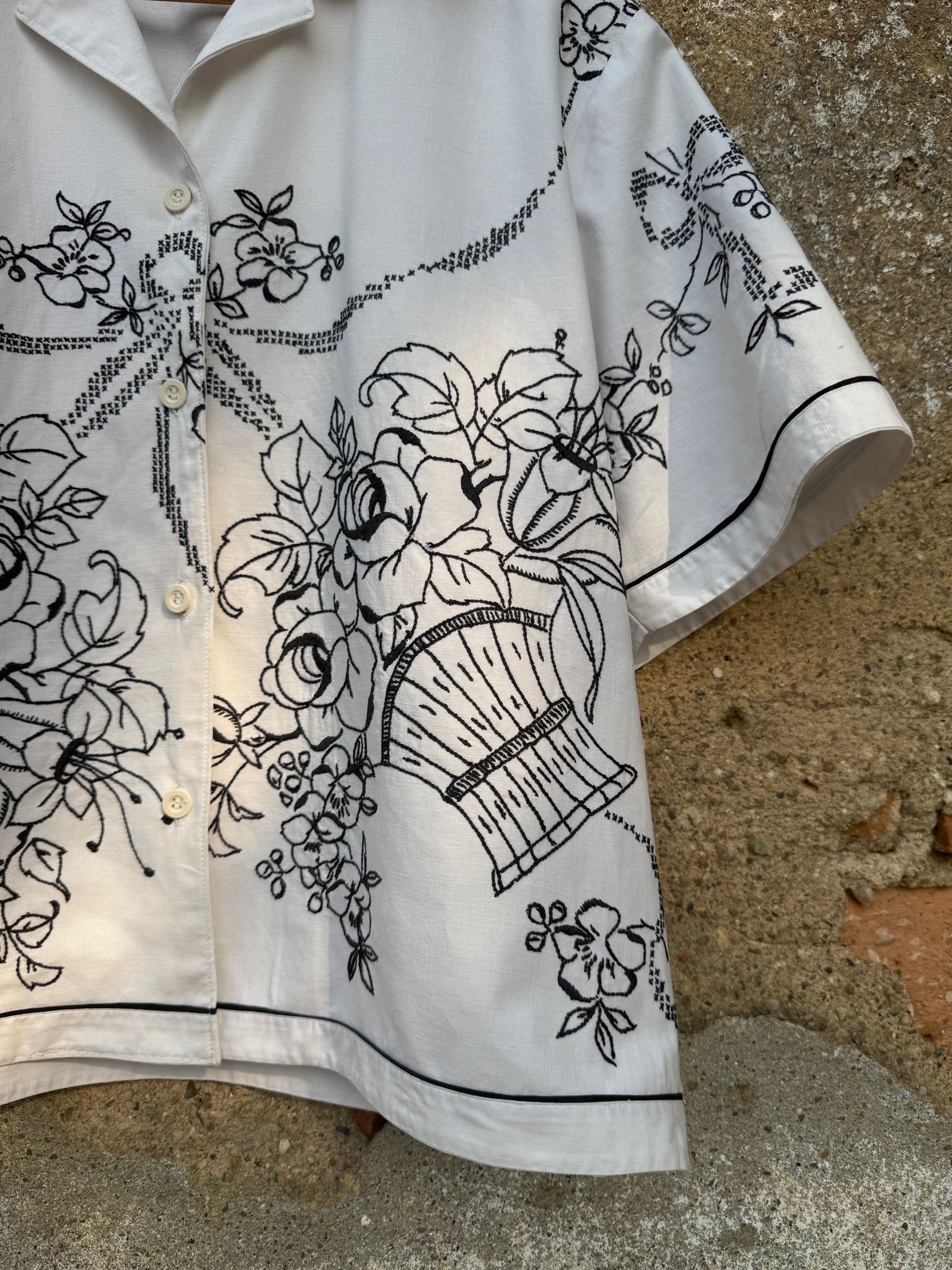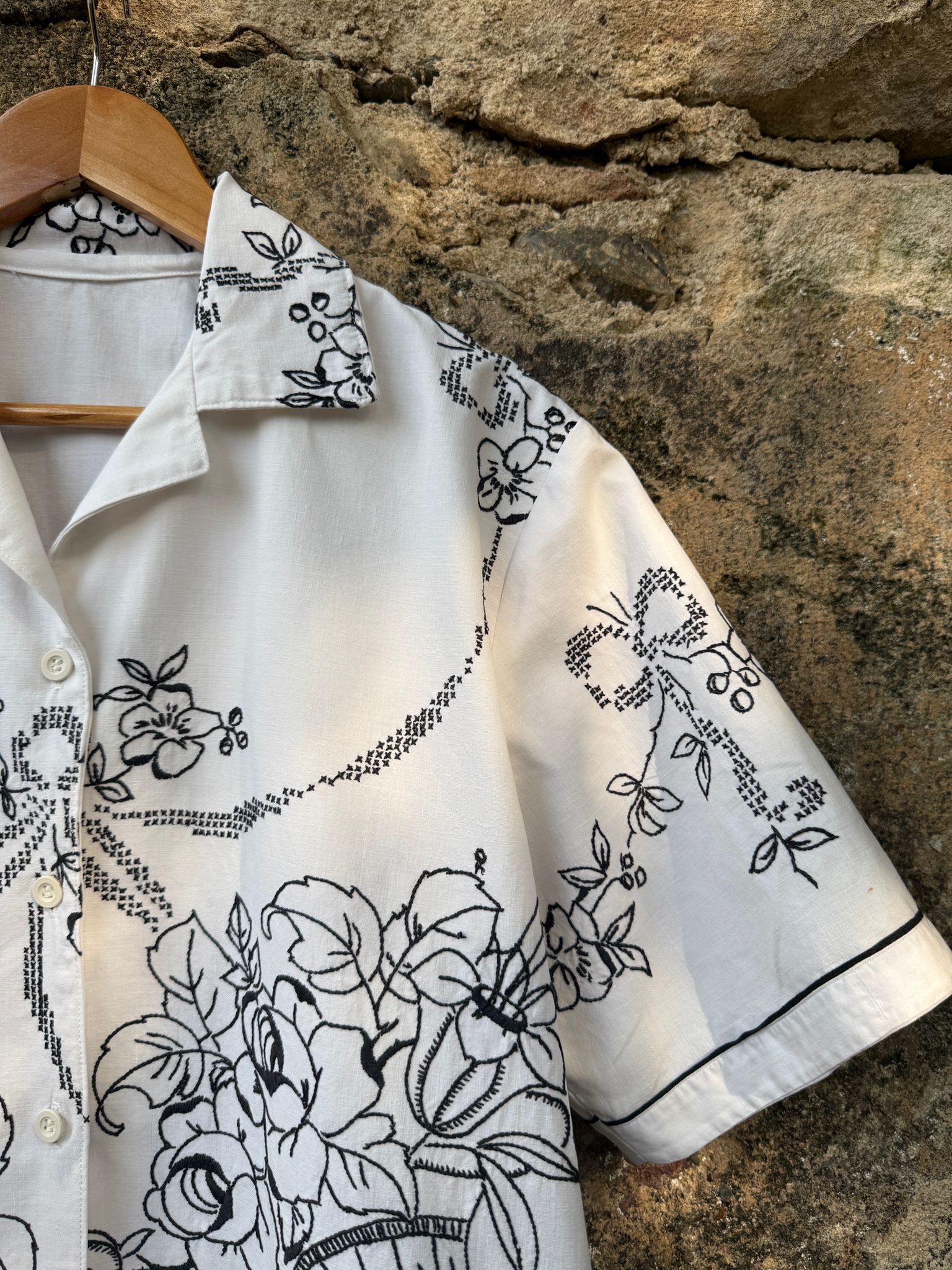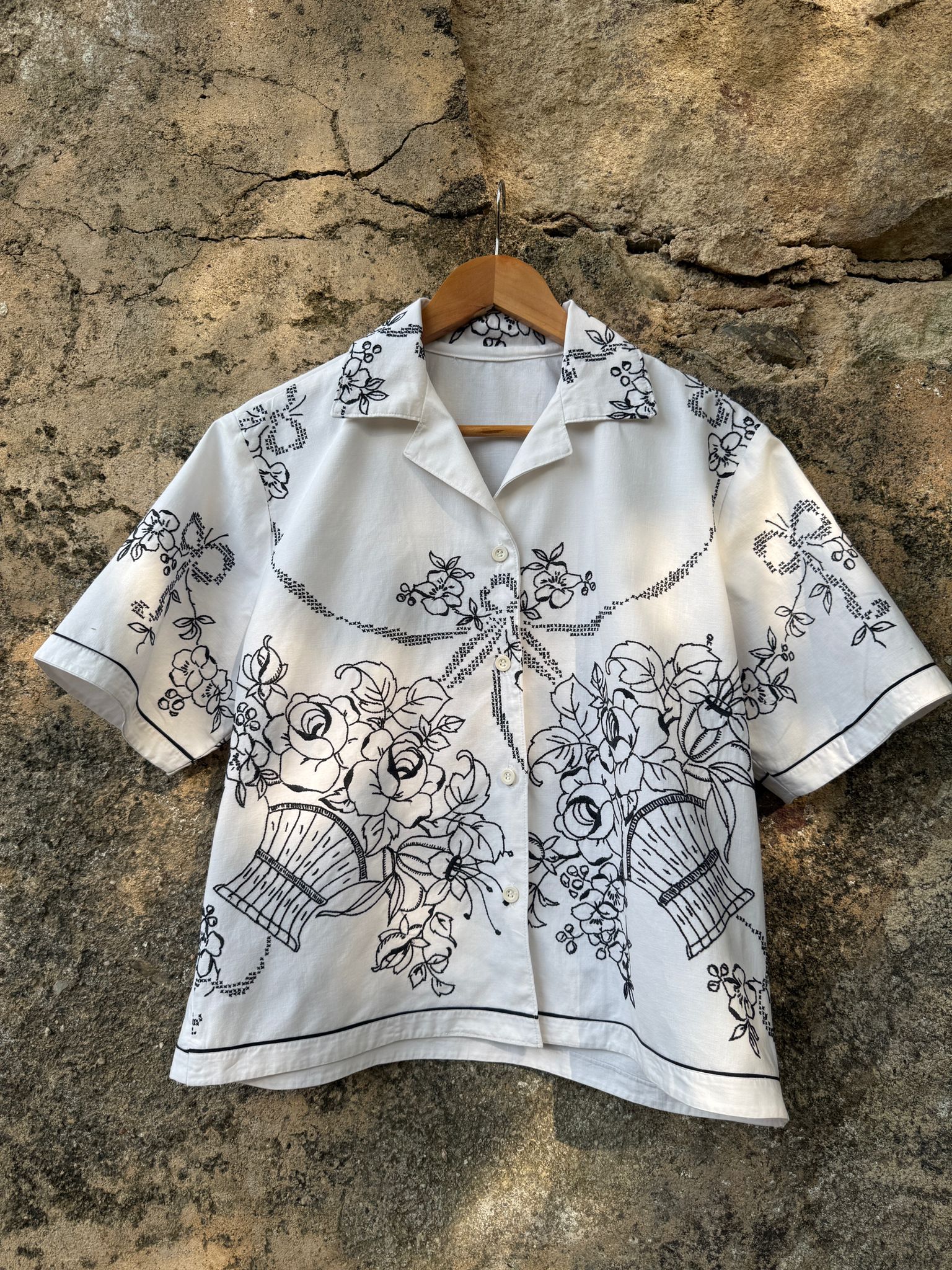 Bonita camisa, feita com uma toalha de mesa em linho e bordada à mão.
