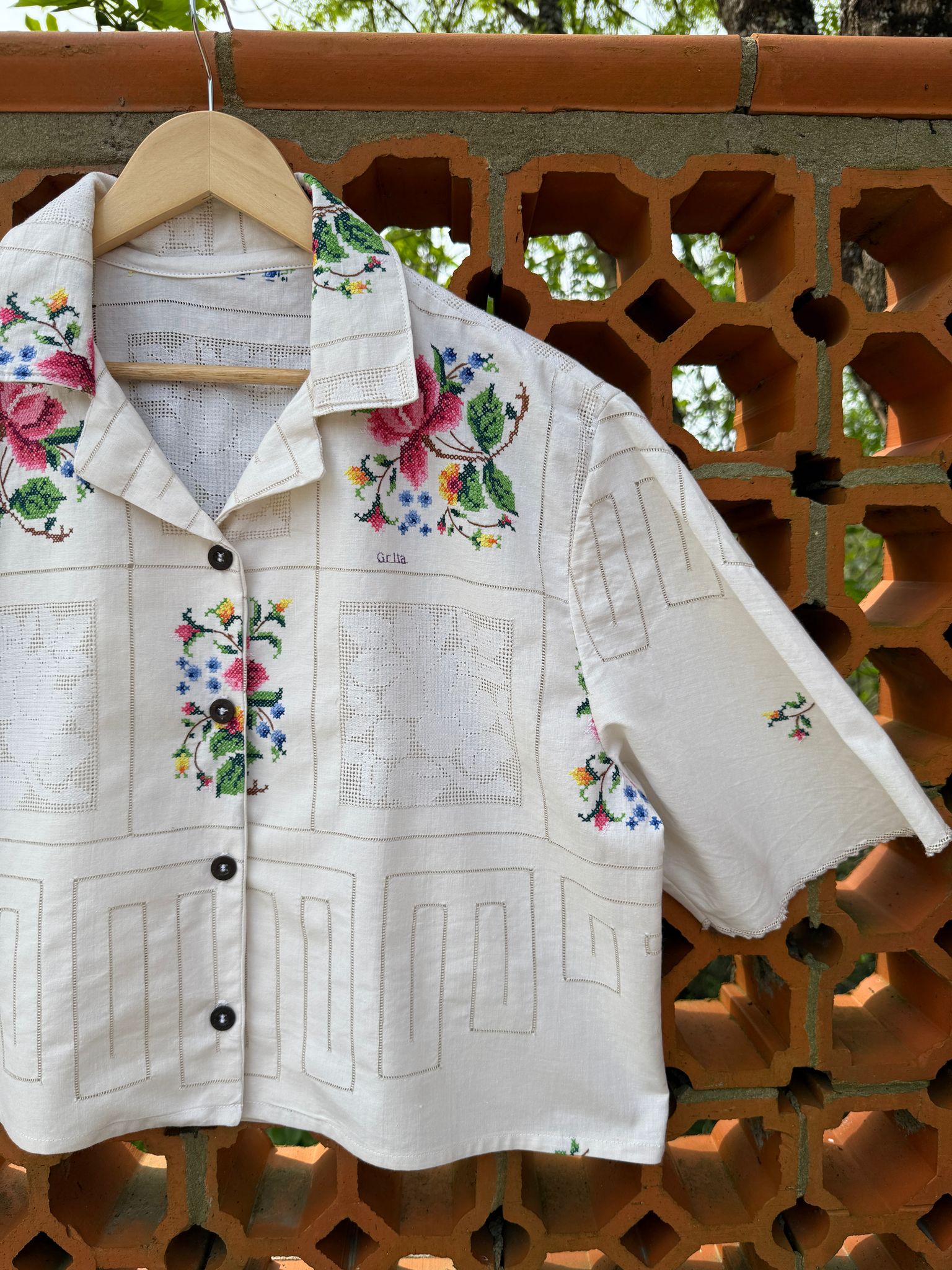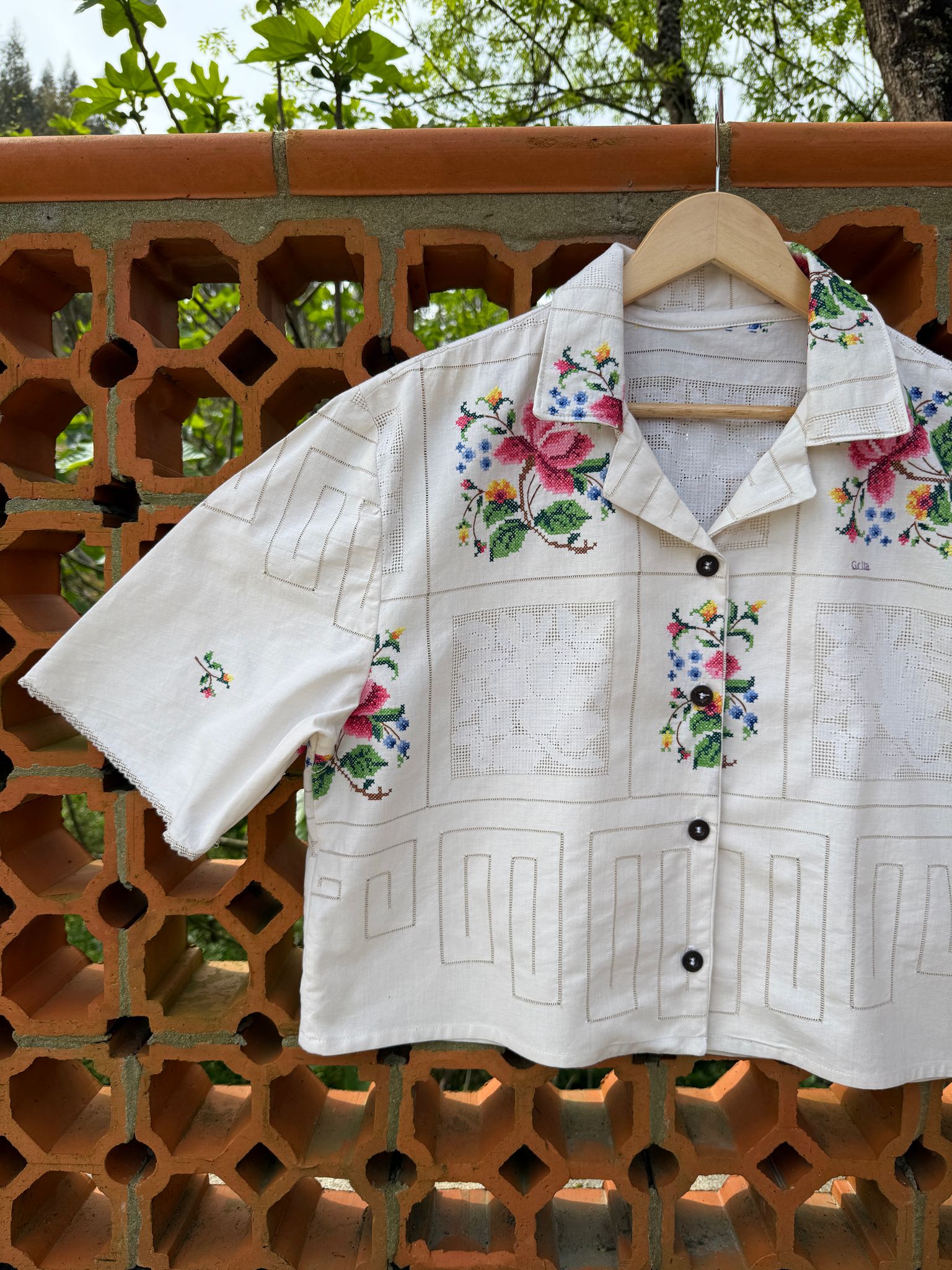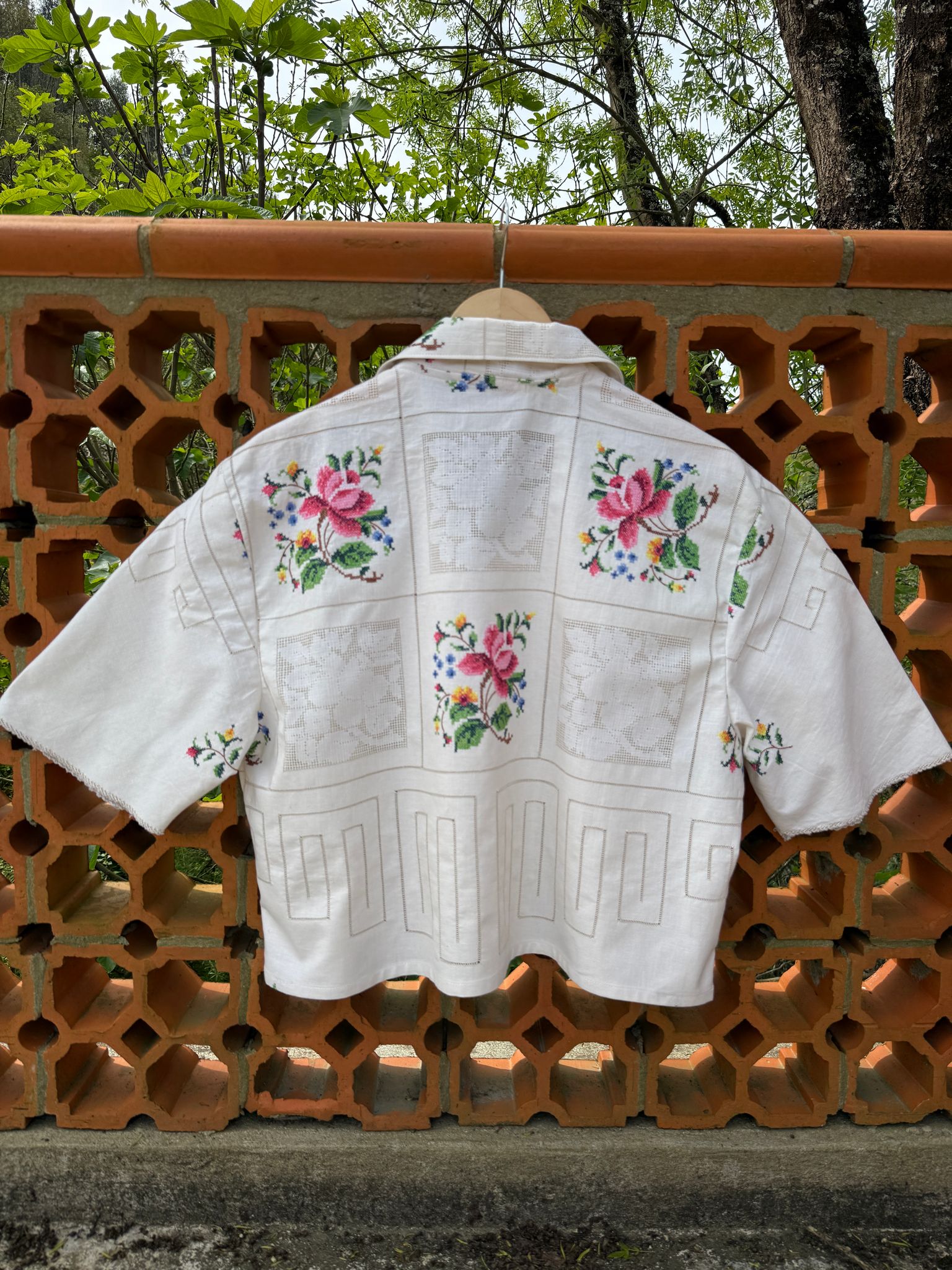 Bonita camisa, feita com uma toalha de mesa em algodão bordada à mão, muito trabalhado