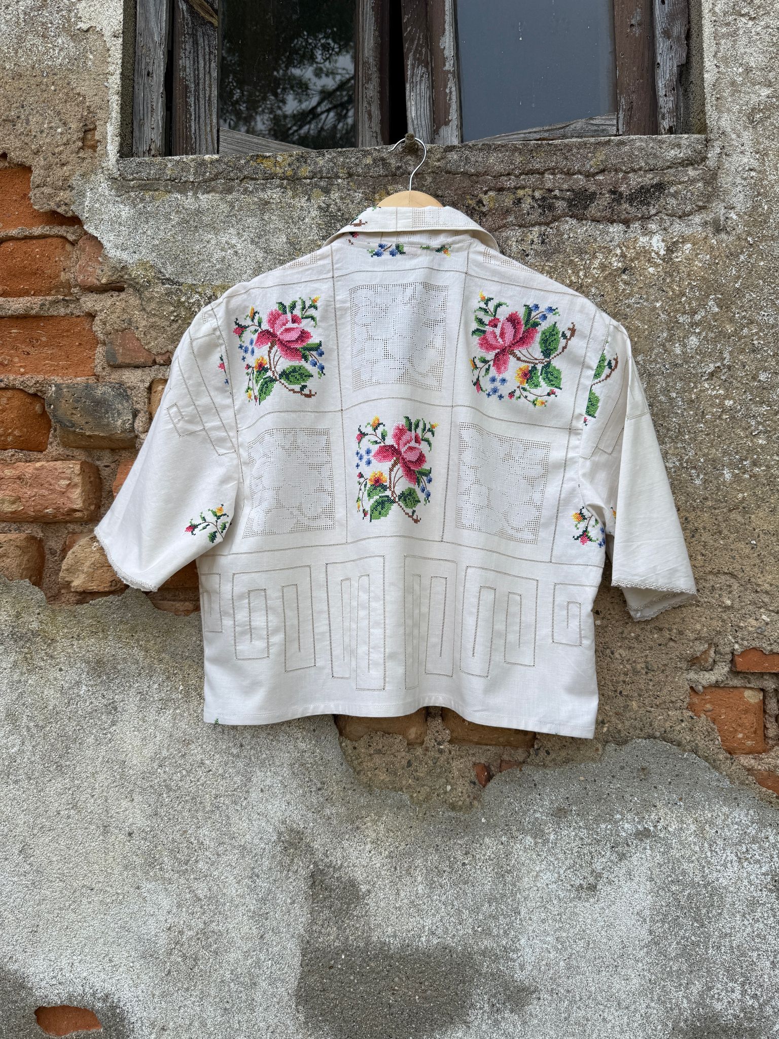 Very special shirt, made from a embroidered tablecloth