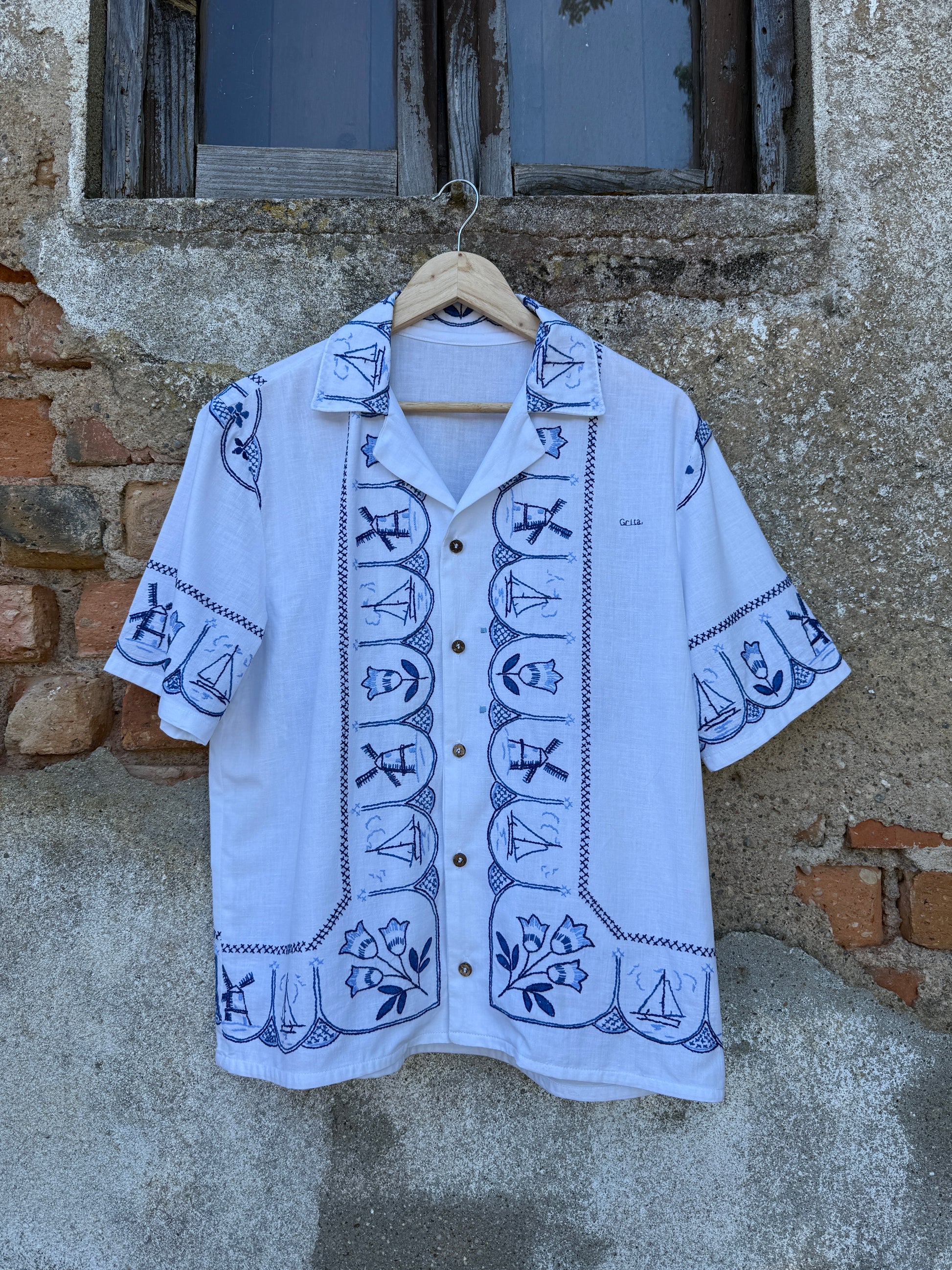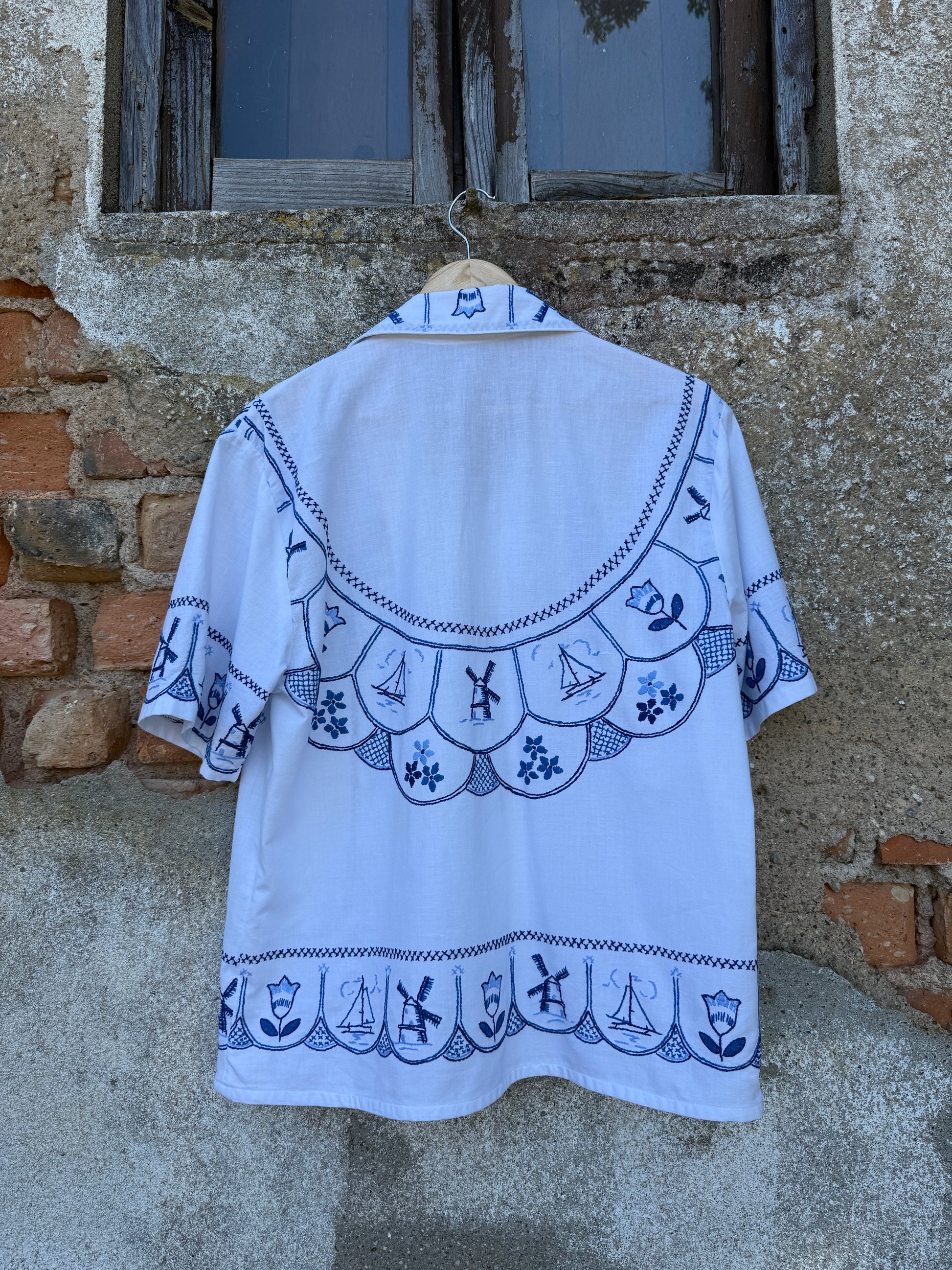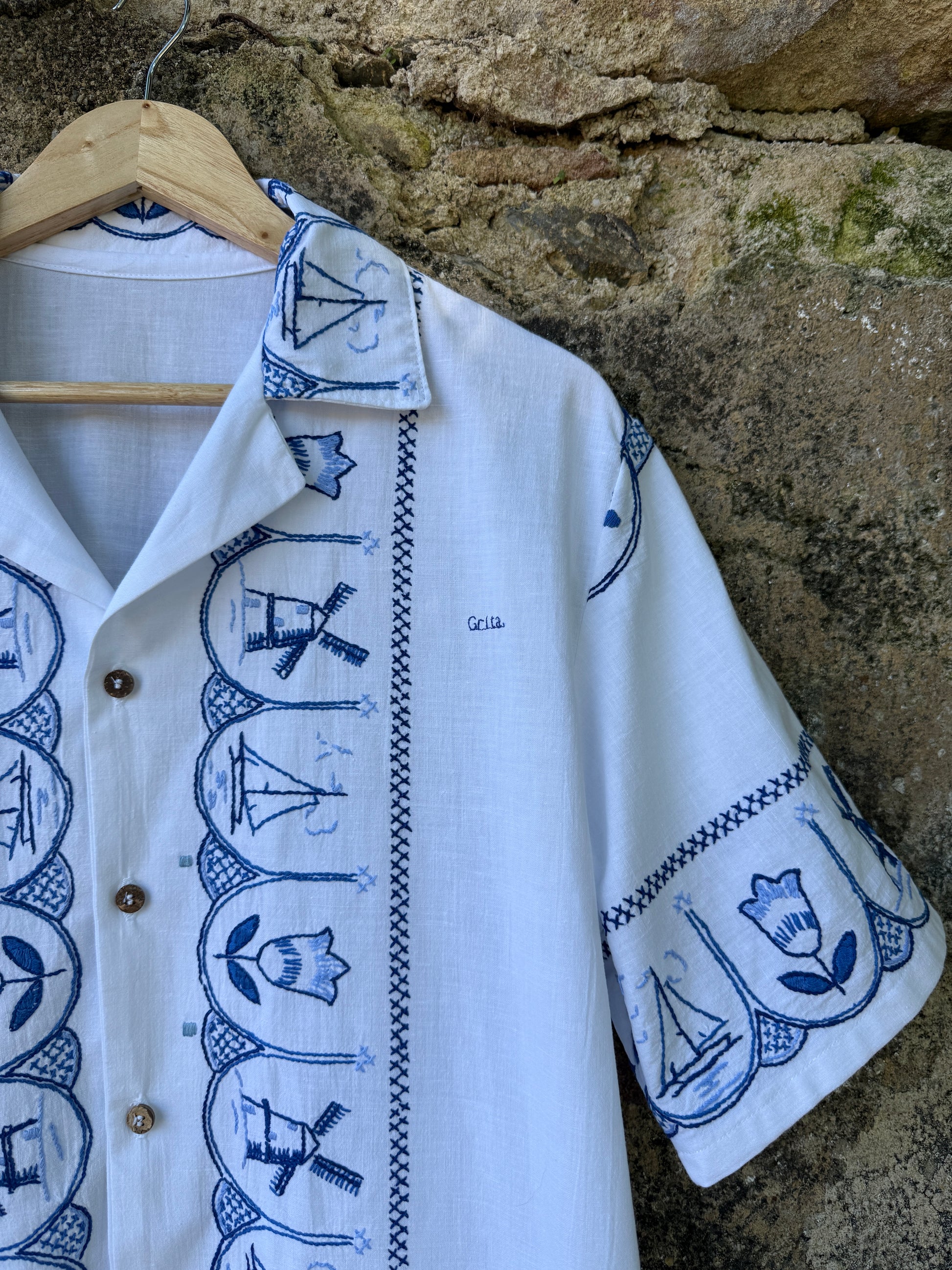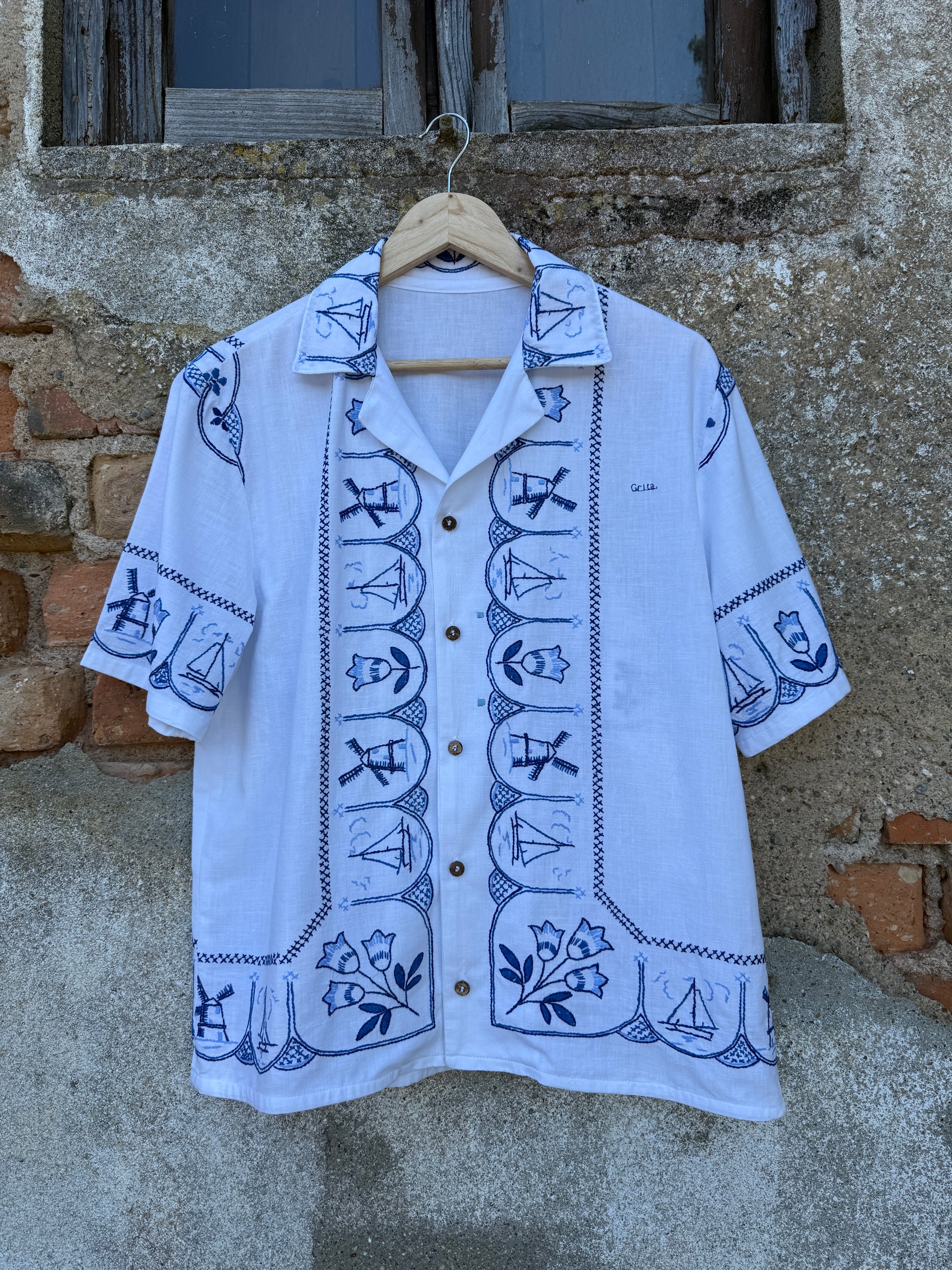 Camisa muito bonita feita com uma toalha de mesa antiga bordada à mão