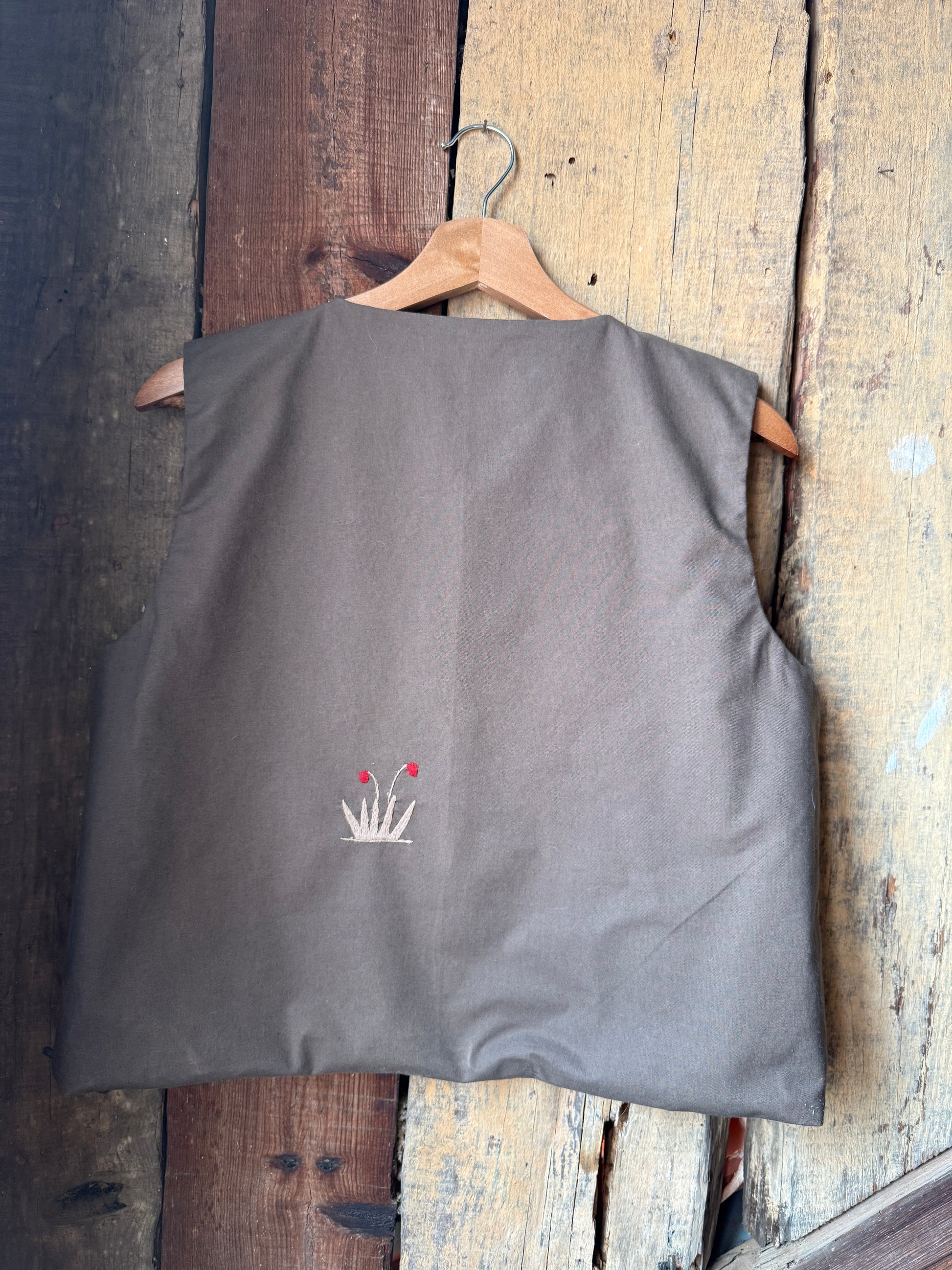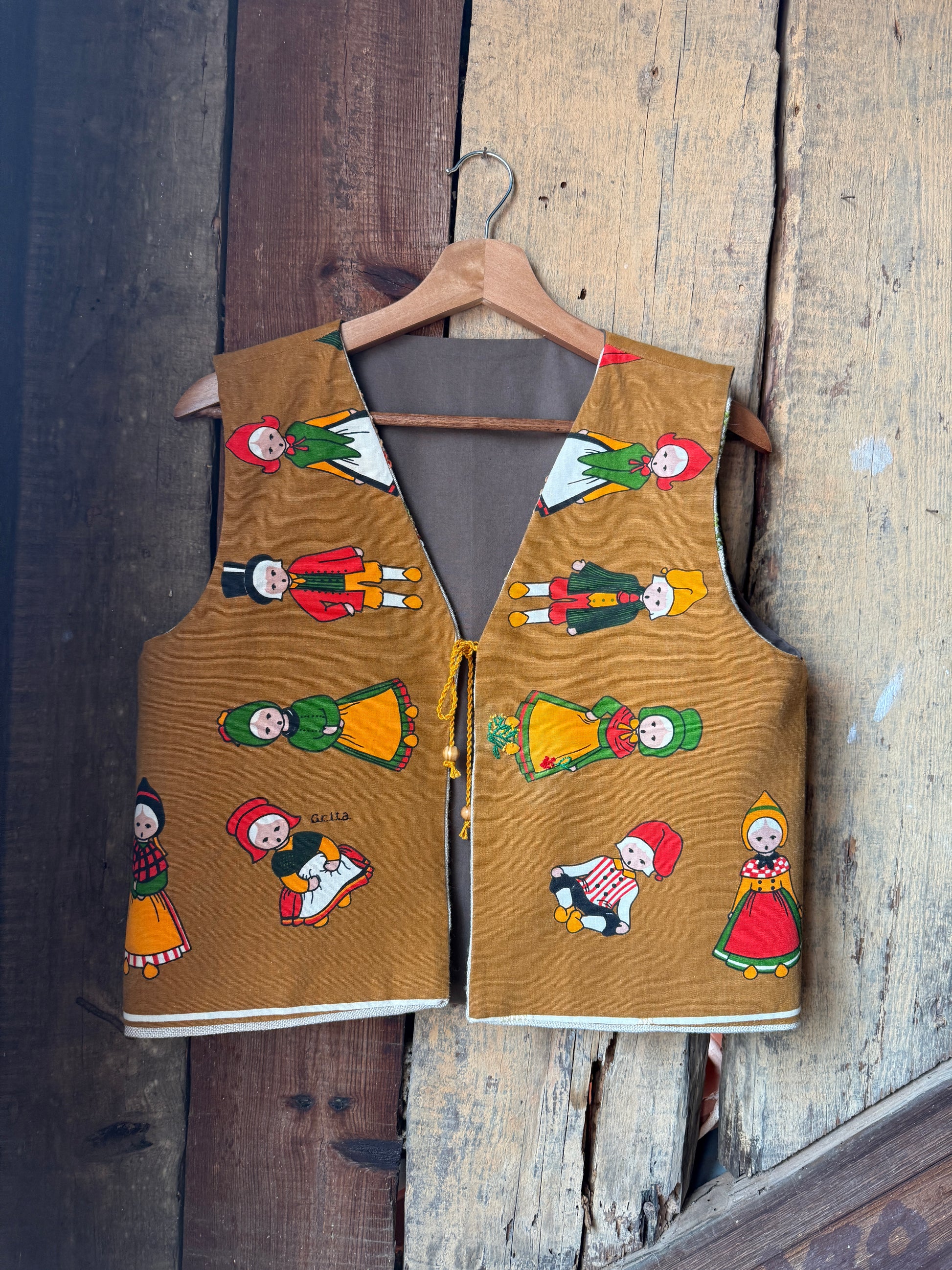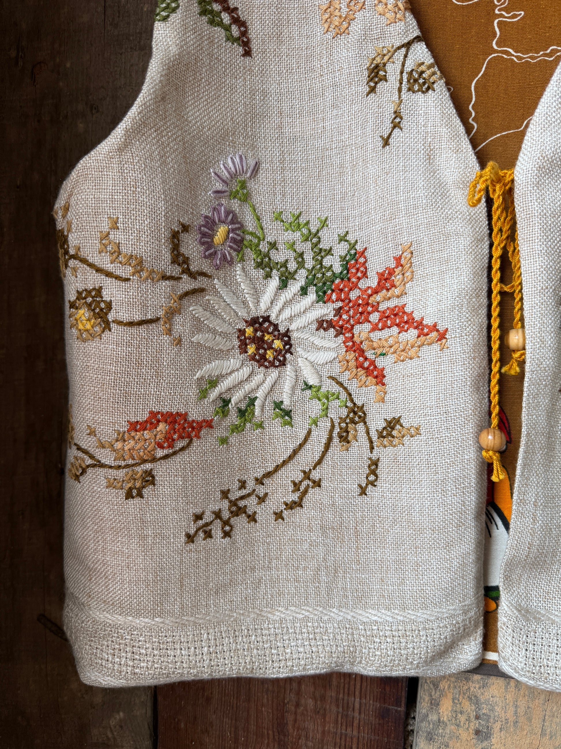 Colete reversível feito com duas toalhas de chá e o resto de uma toalha de mesa