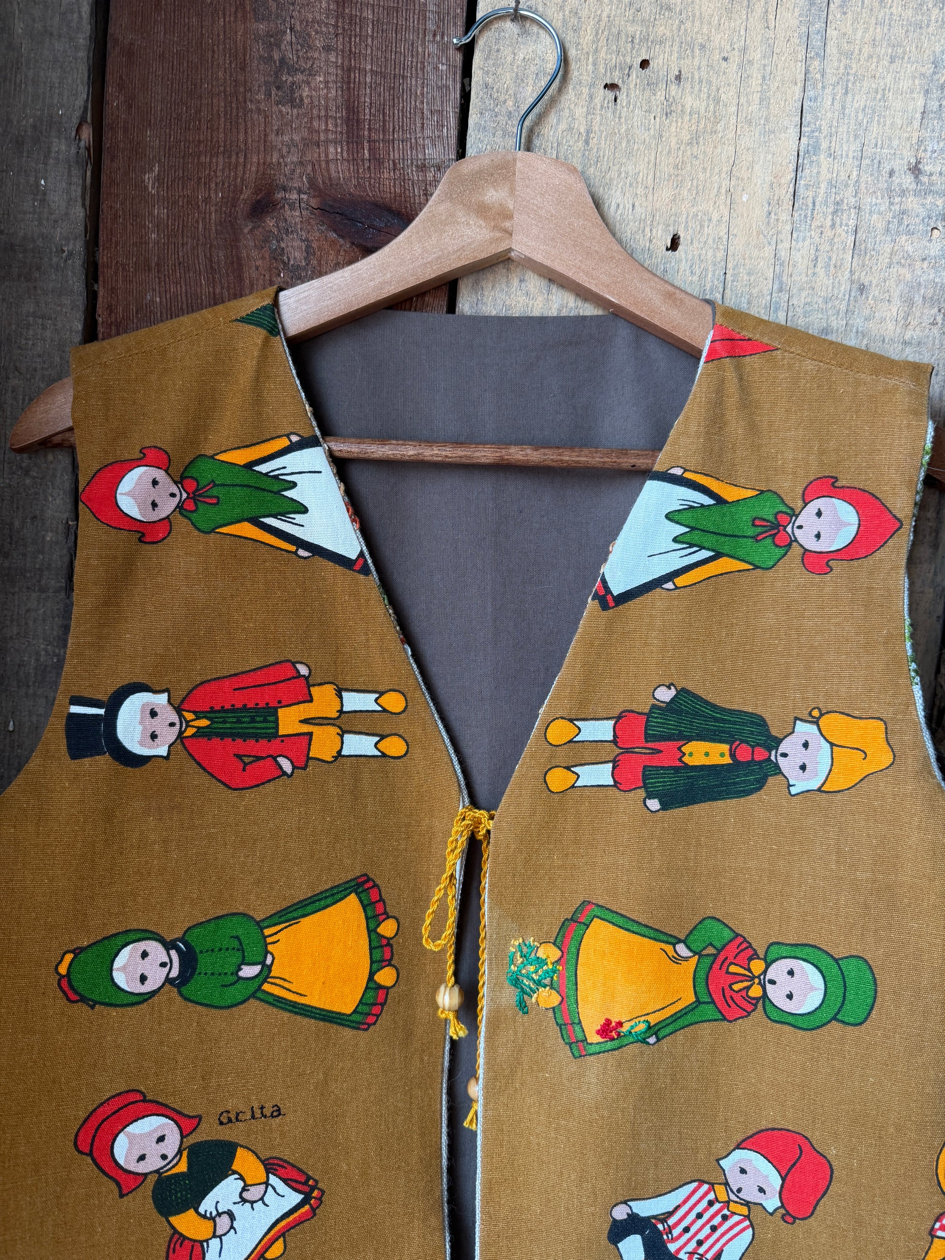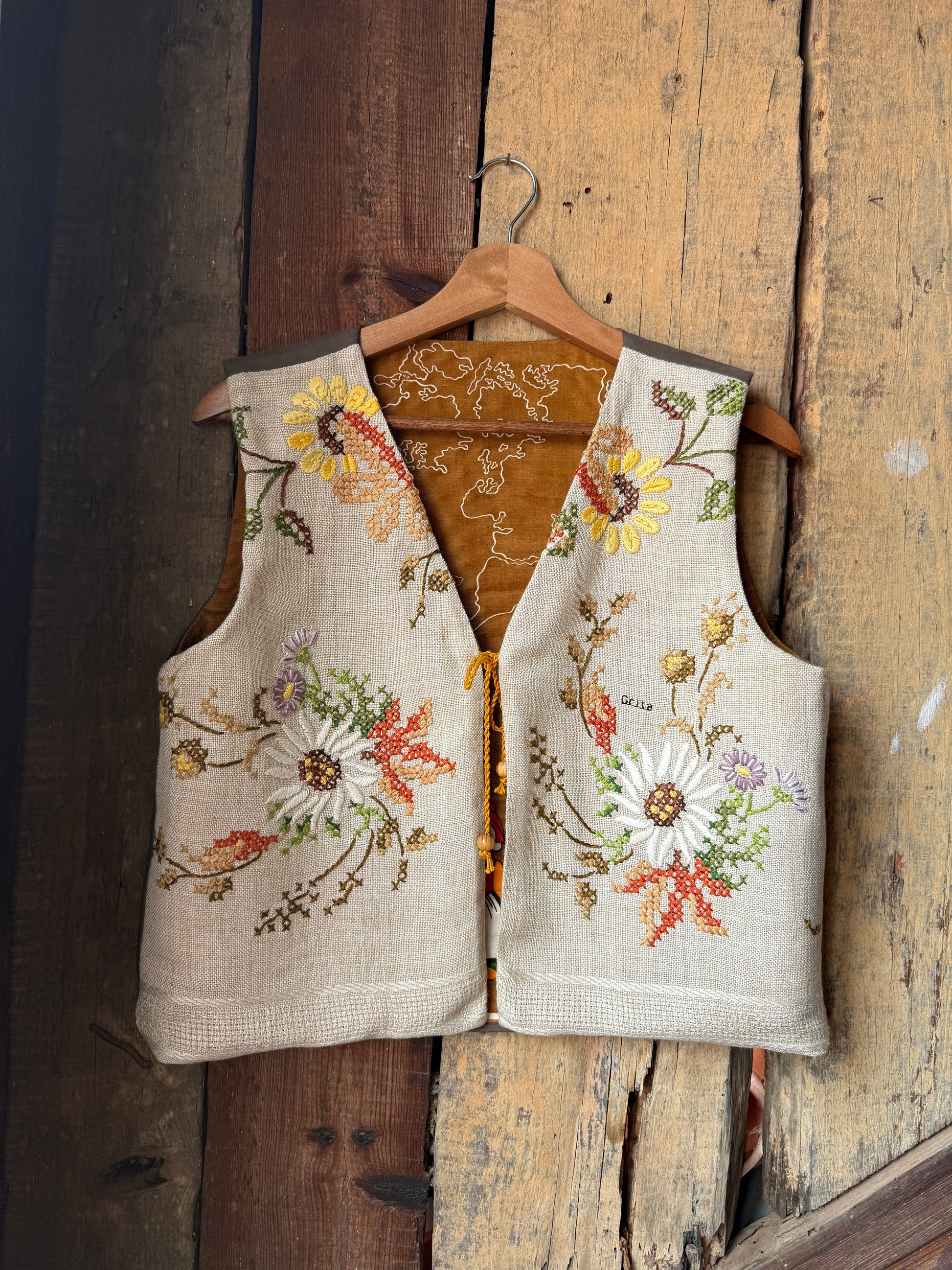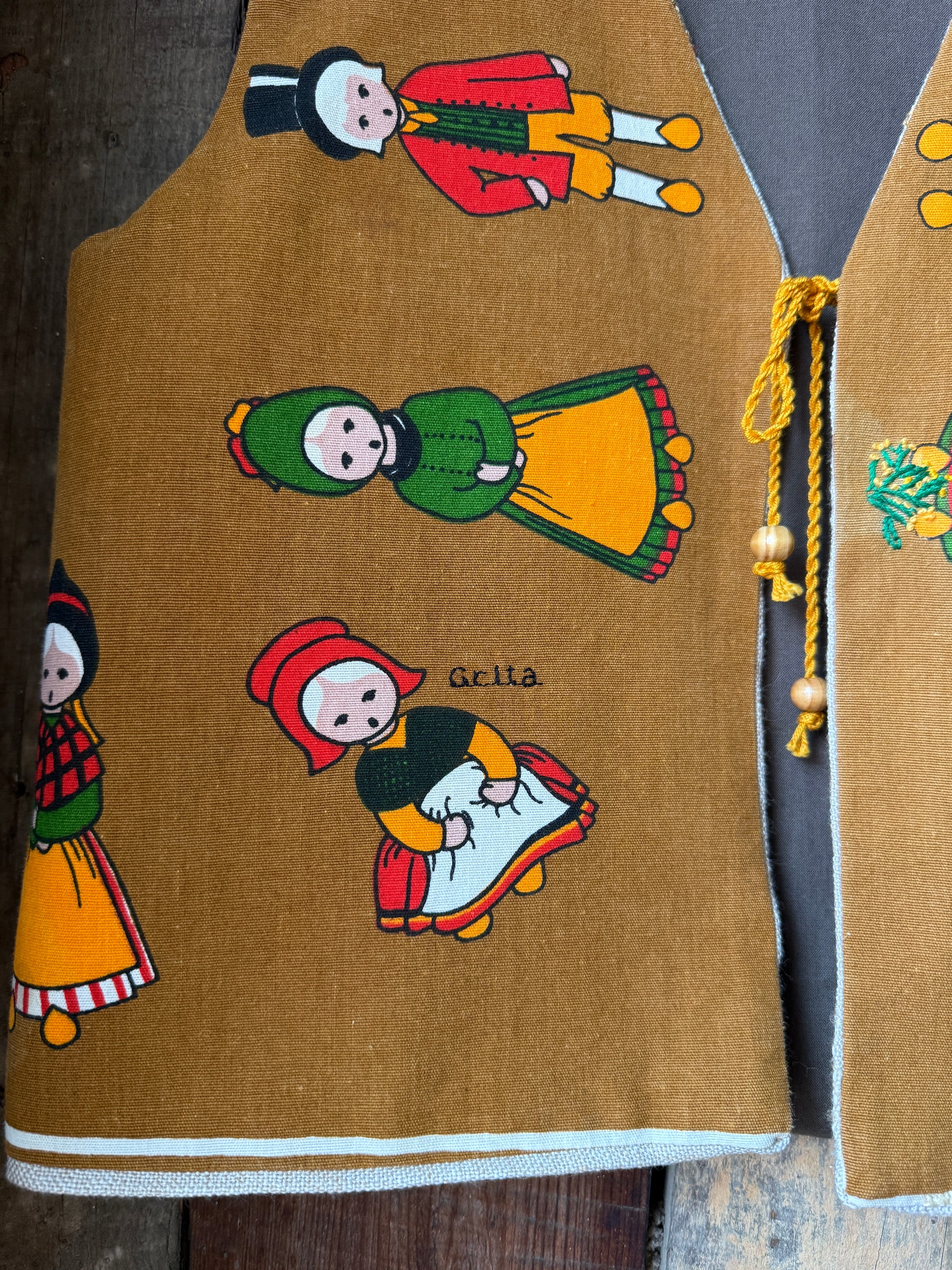 Colete reversível feito com duas toalhas de chá e o resto de uma toalha de mesa