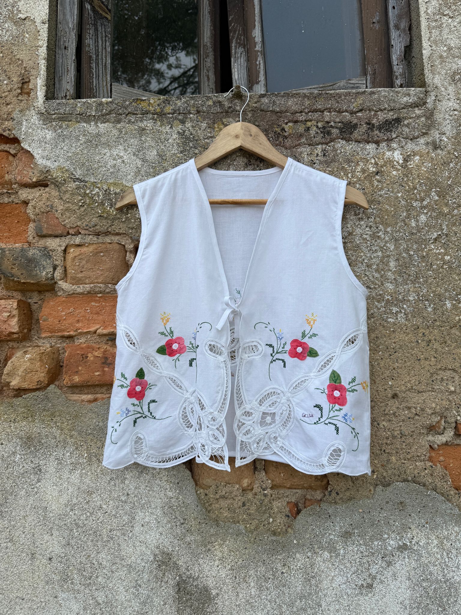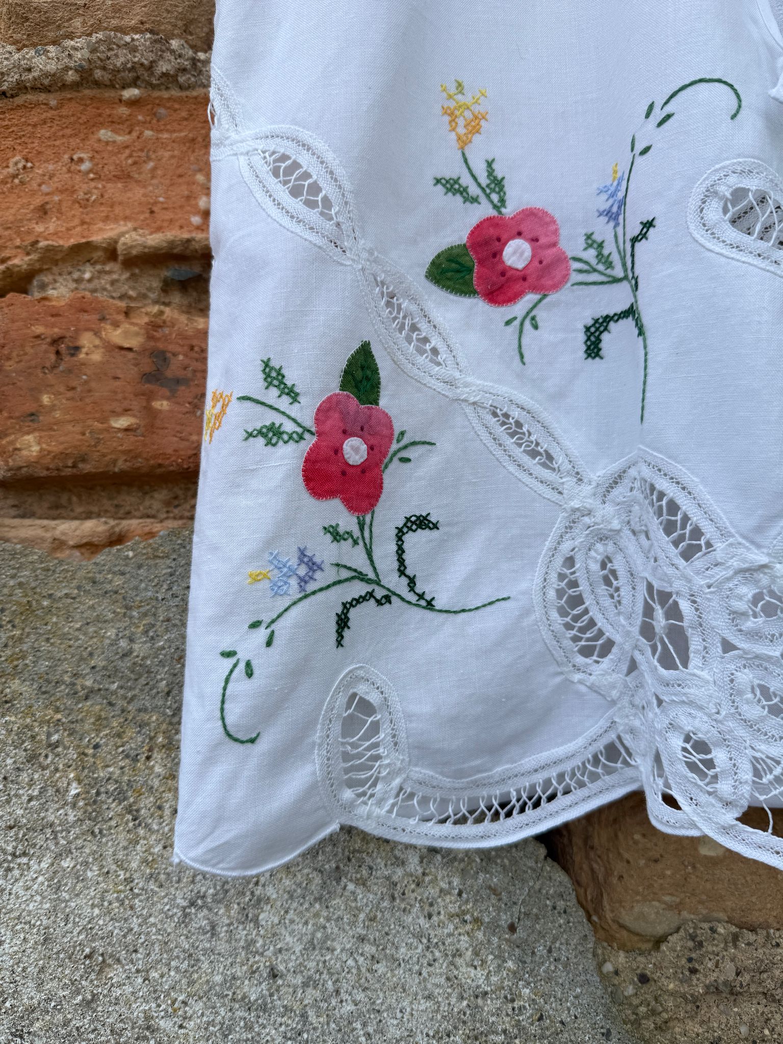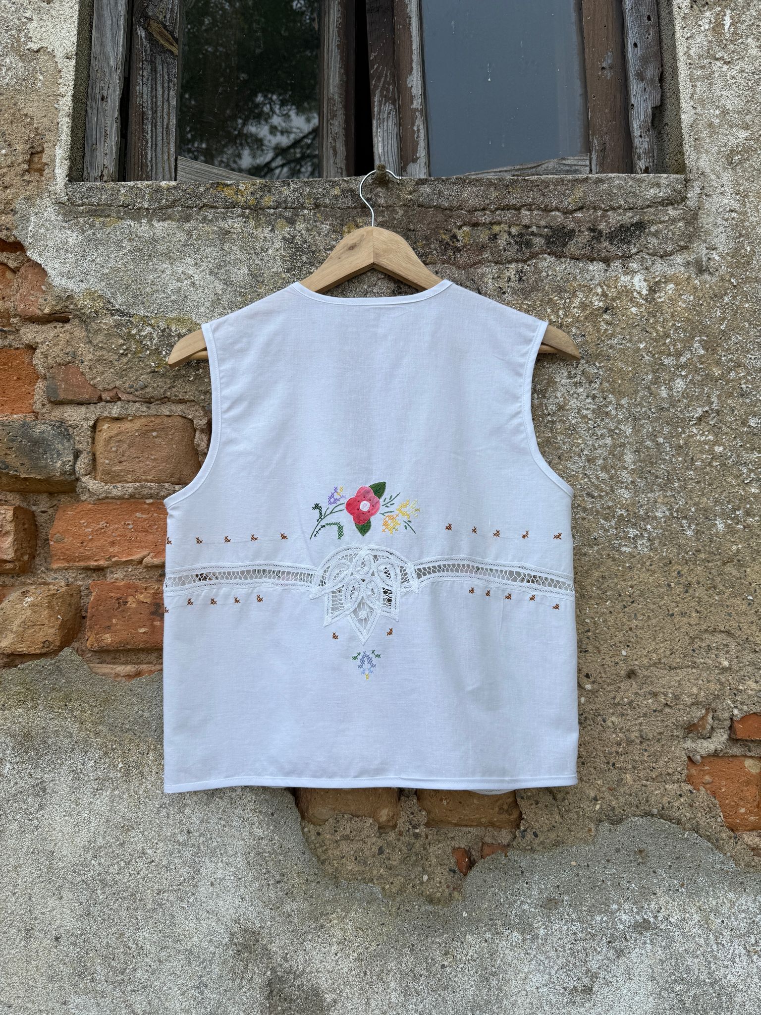 Blusa sem mangas feita com uma toalha de mesa bordada e com aplicações de tecido