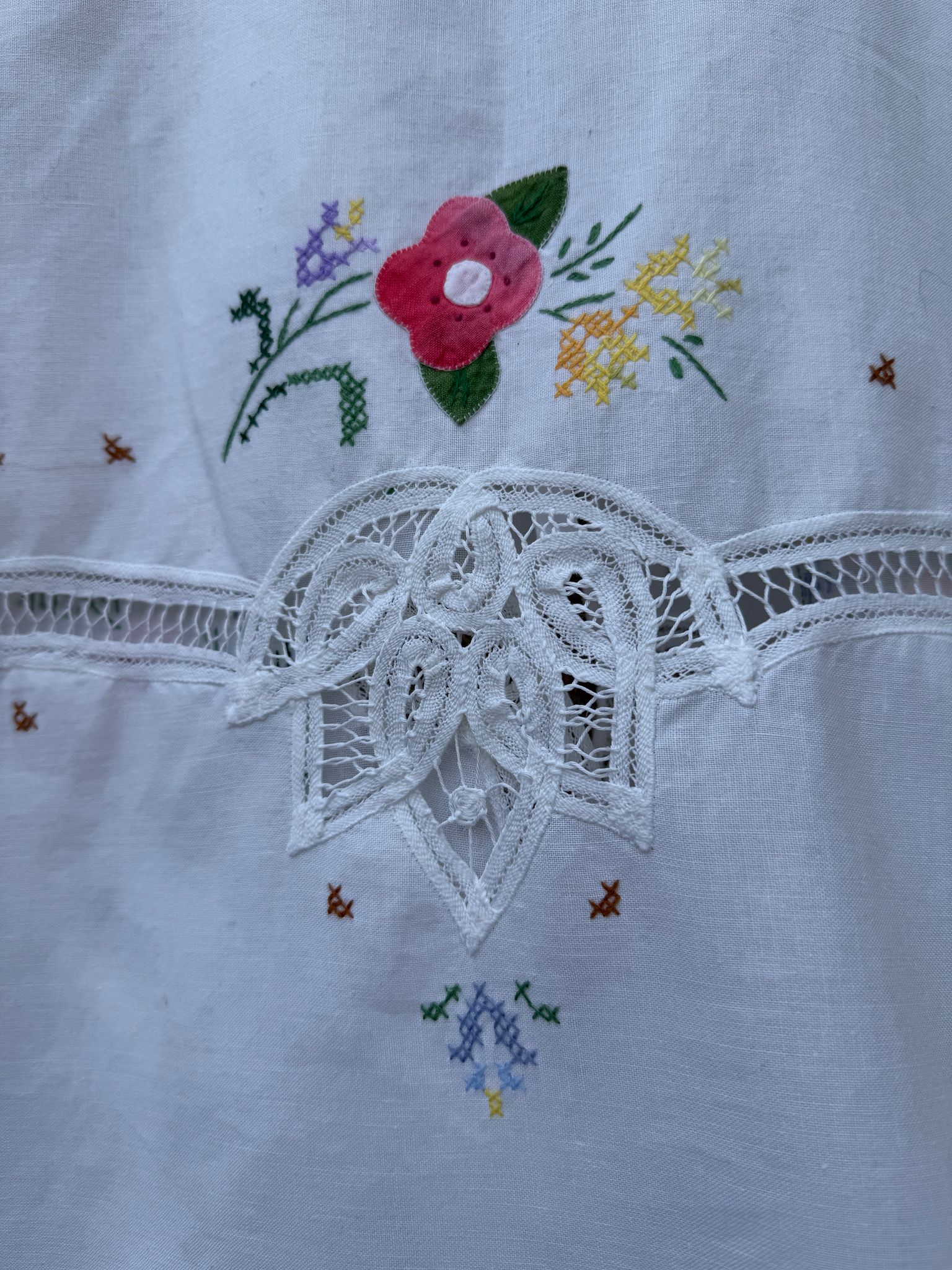Blouse with sleeves made with an embroidered tablecloth and fabric appliqués